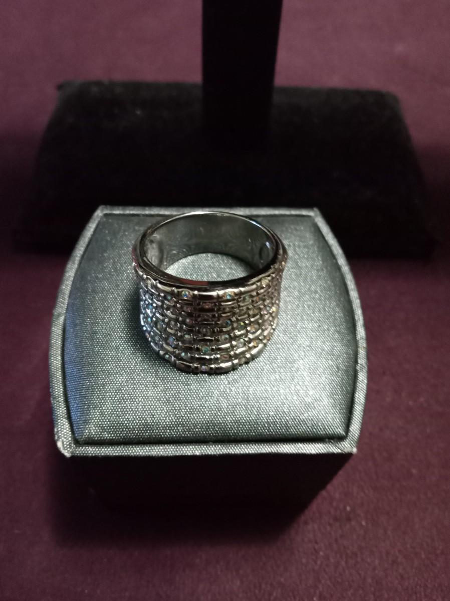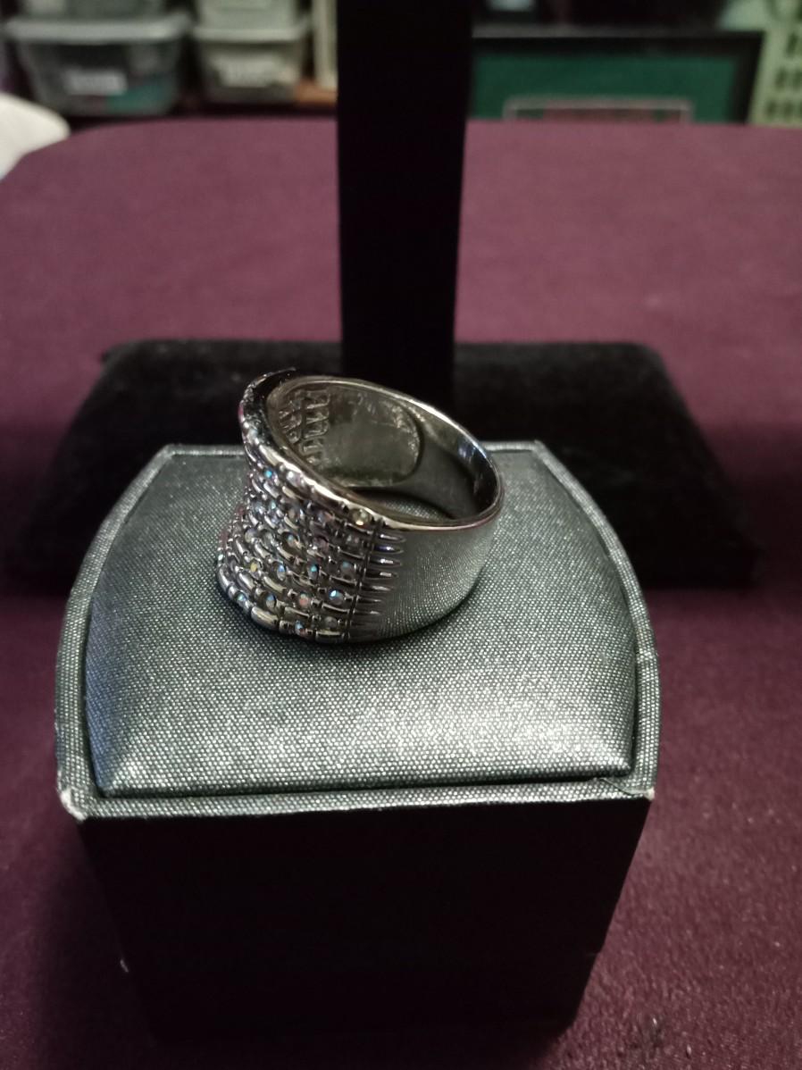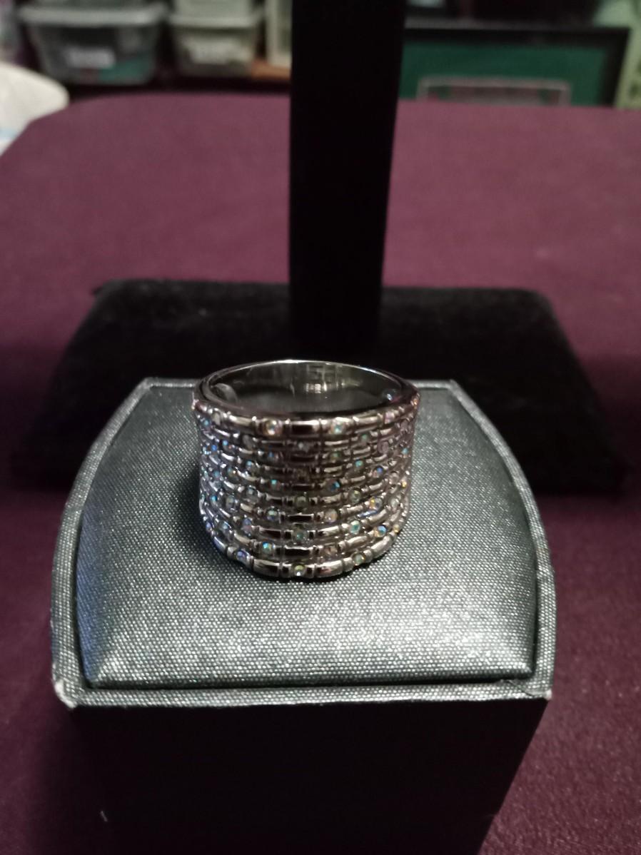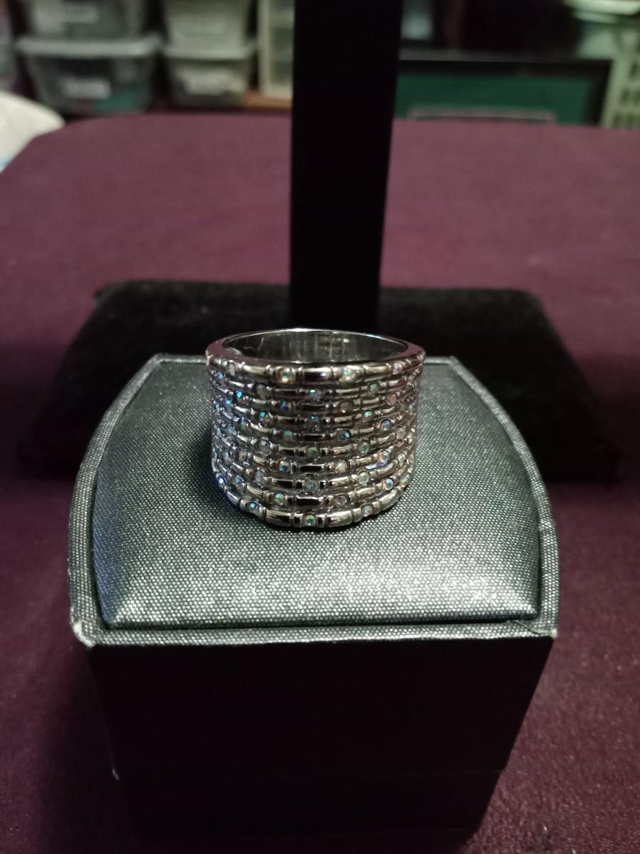 THE WIDE BAND SILVER TONE IS A SIZE 10