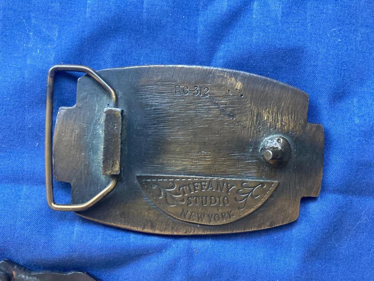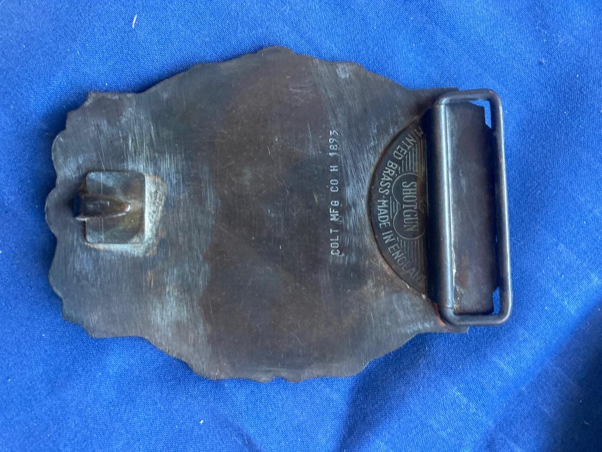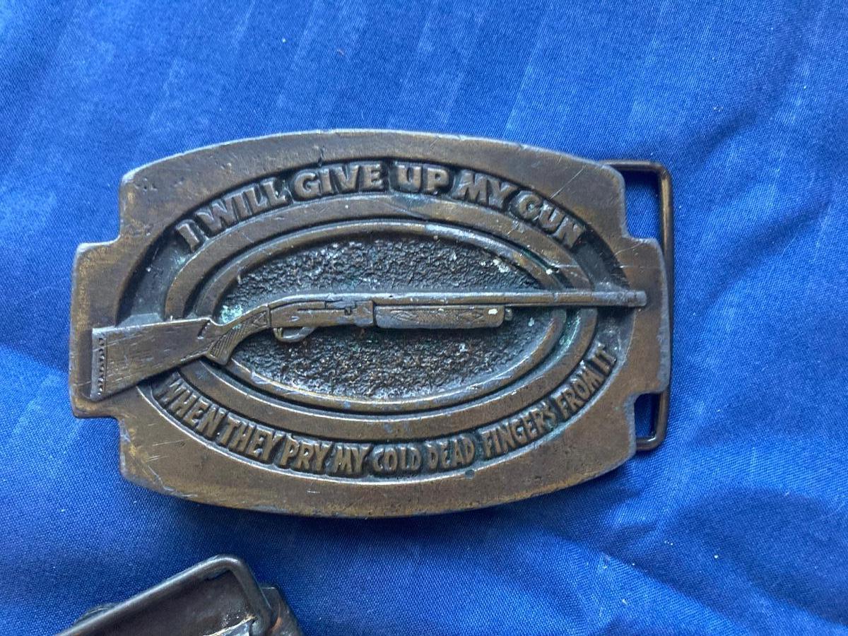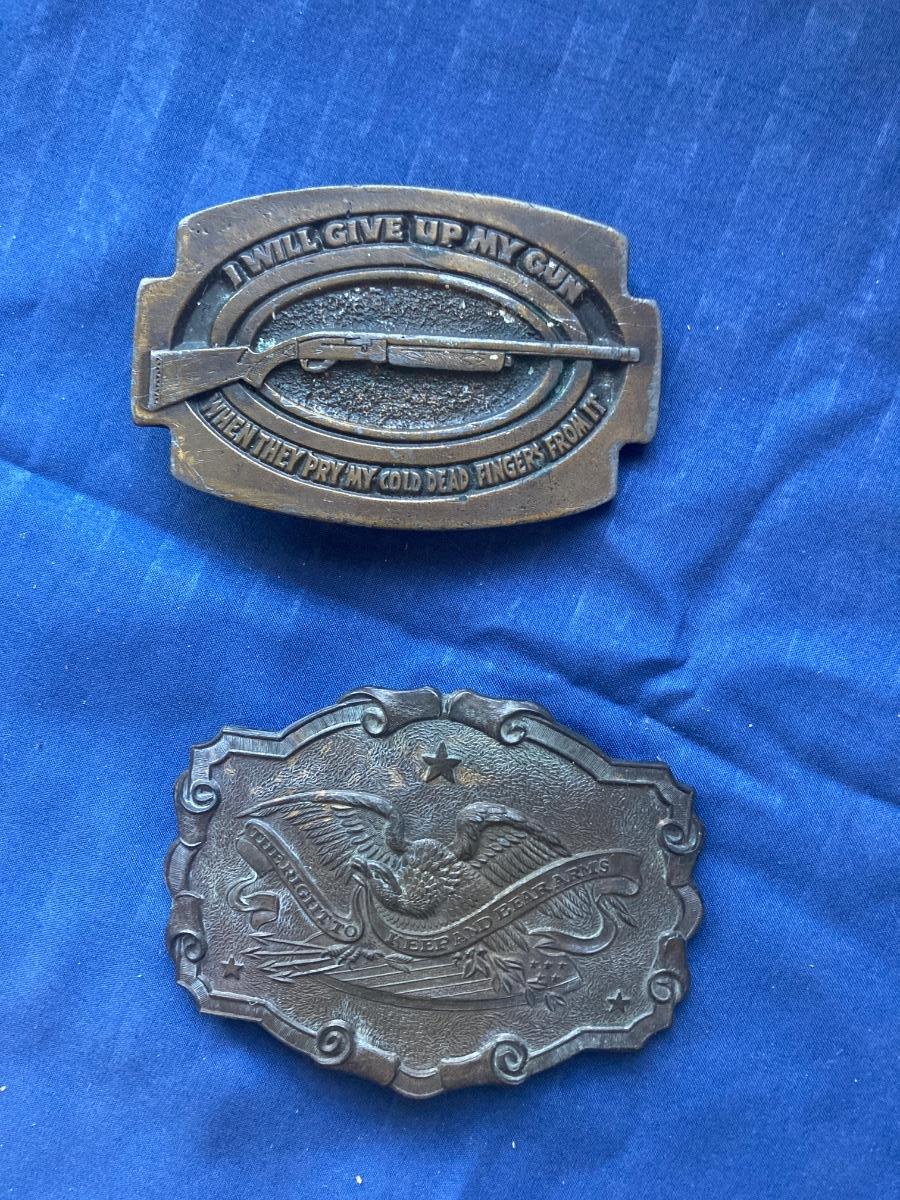 TWO BRASS BELT BUCKLES, 1 WITH THE 2ND AMENDMENT OF THE CONSTITUTION, THE RIGHT TO BEAR ARMS