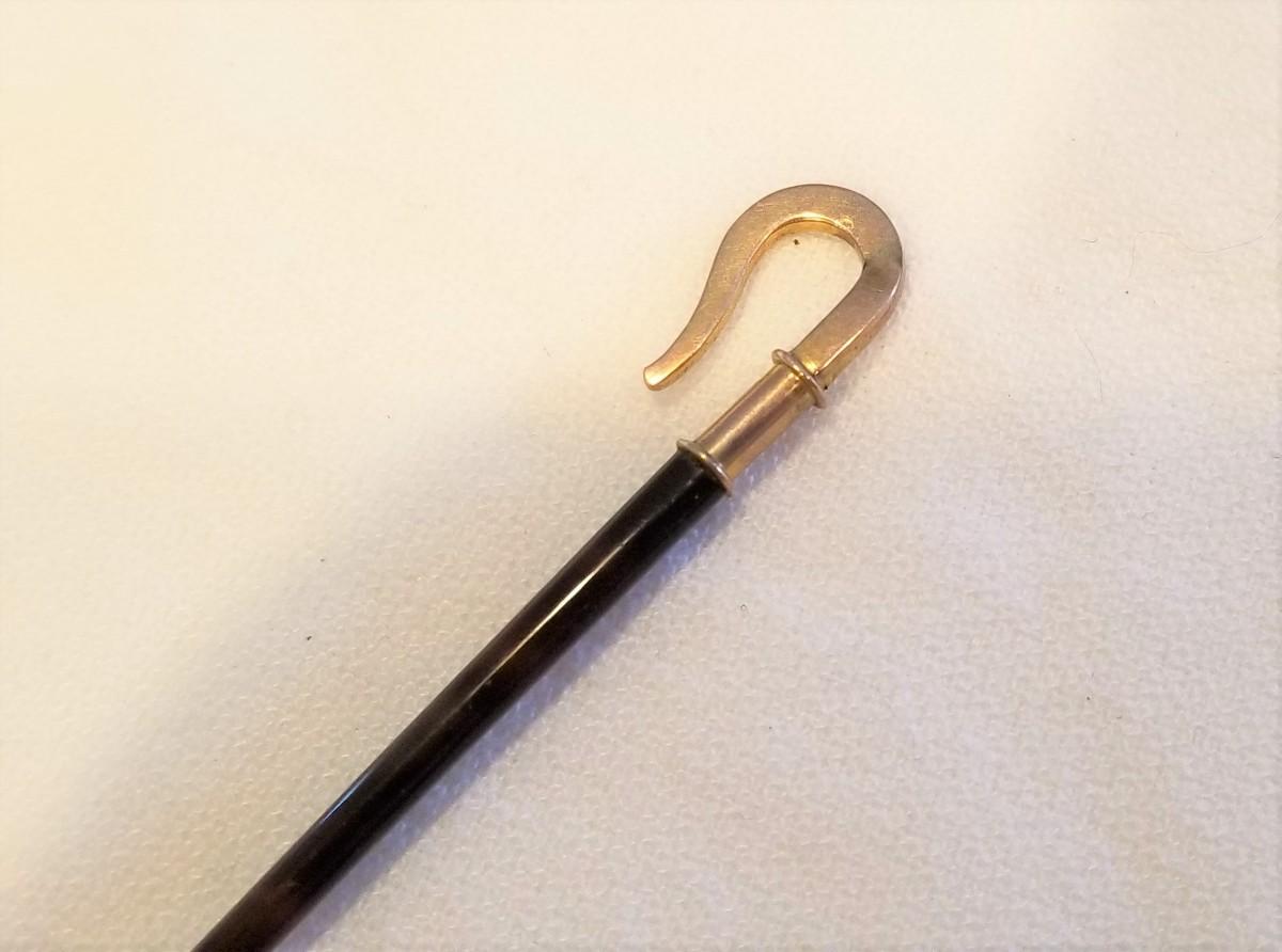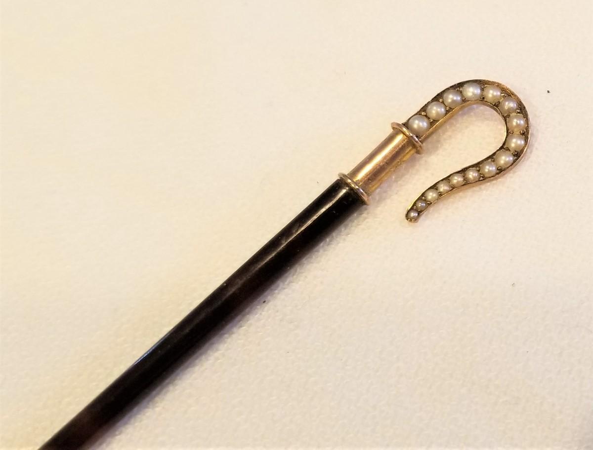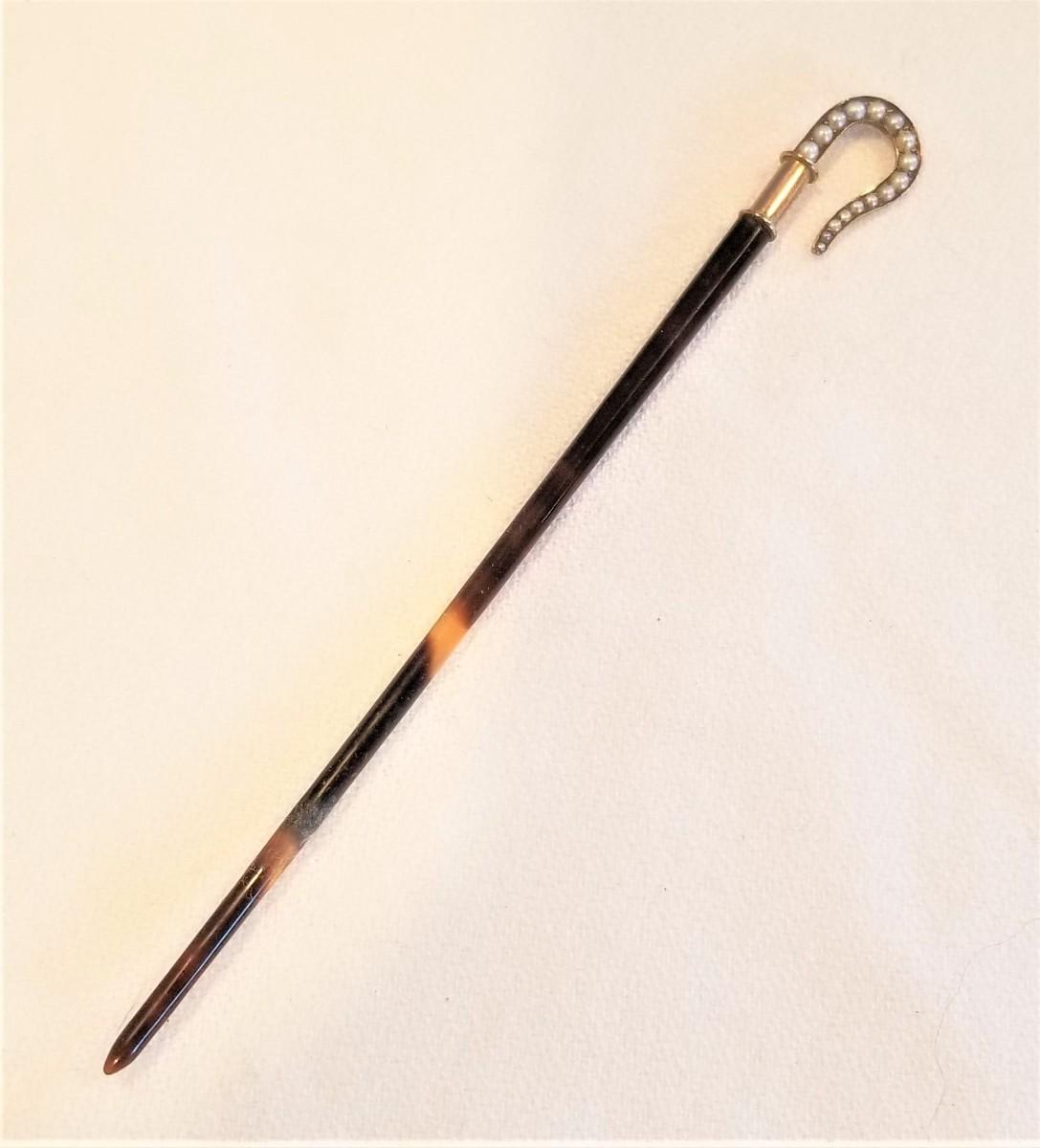 Check out this little beauty - antique hairpin or hair ornament - Faux Tortoise stem with a dainty Shepherd's crook top set with 16 tiny natural seed pearls in a gold-filled frame. No maker's mark. 3.5" long - excellent condition.