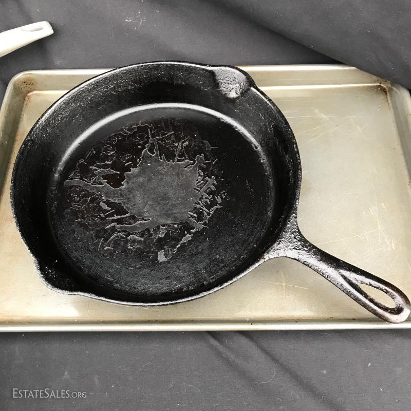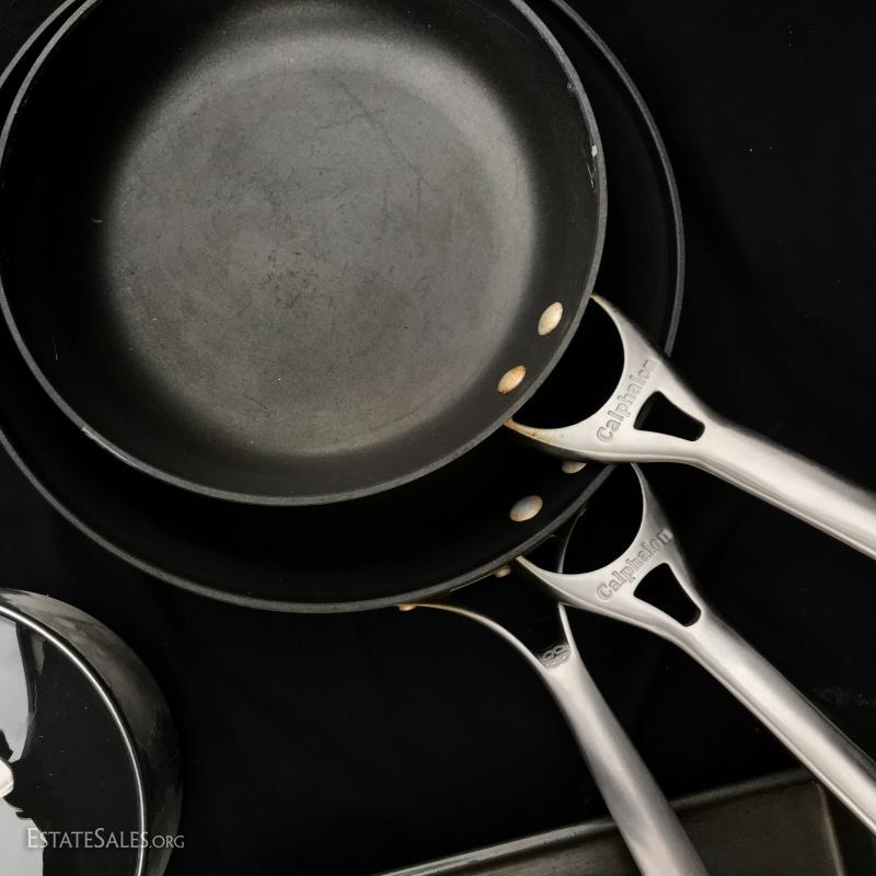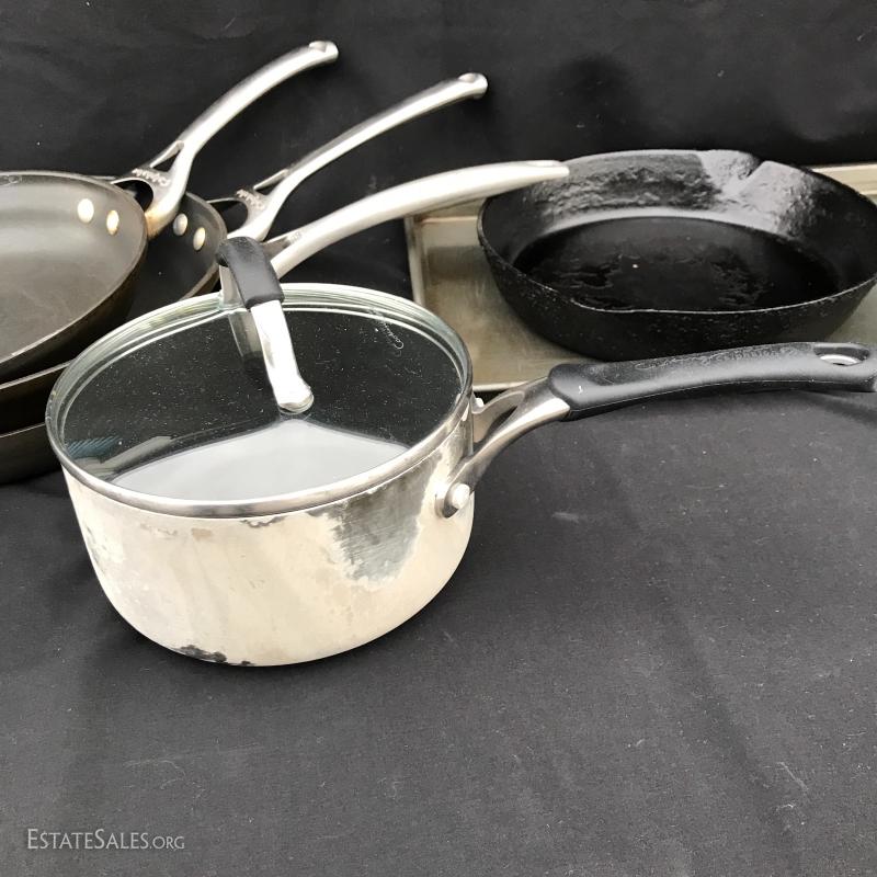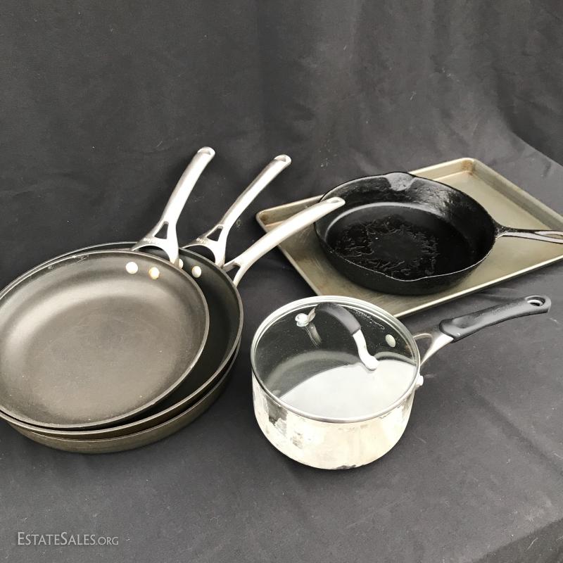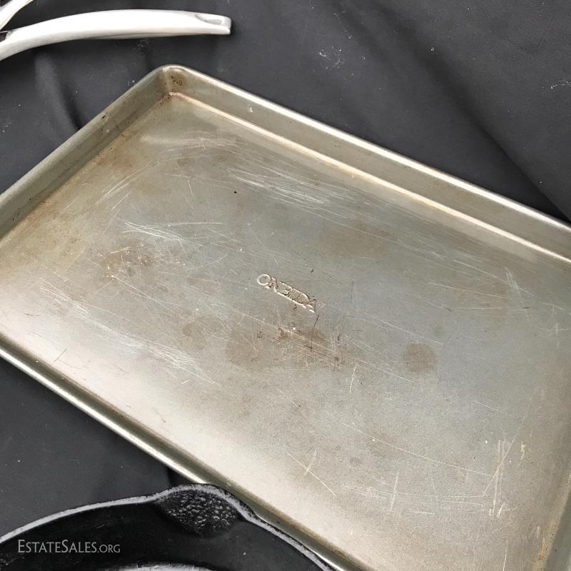 Four Caphlon pots and skillets. Number 8 Cast Iron Skillet. Oneida baking sheet. No shipping. Local pick up only in Asheville, NC.