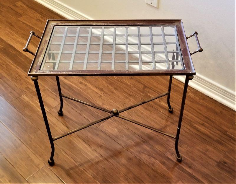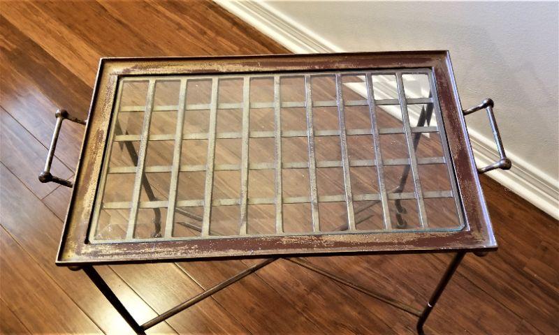 This contemporary metal and glass tray table has a great distressed look - tray lifts off. Good condition. Measures 23" x 13", 20.5" tall.
