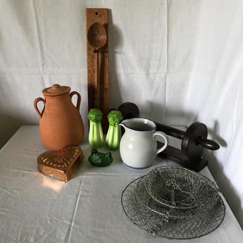 There’s no place like home! This lovely collection of wood, clay, glass and more will give your space that charming country kitchen look. Make changing paper towels easy for all with this vintage wooden rack. Lot also includes a 9.5” tall clay canister with gloss finished interior, a cute celery salt and pepper duo and more. See photos. Local Pickup Only.
