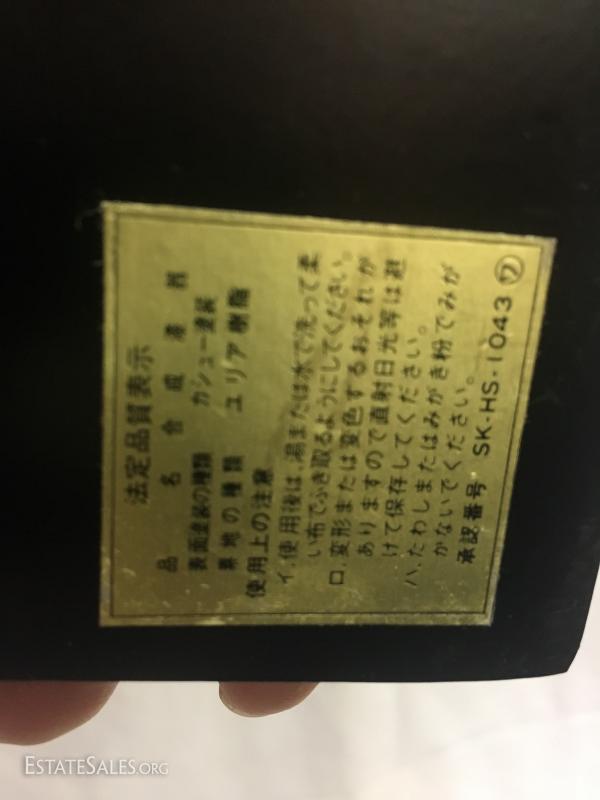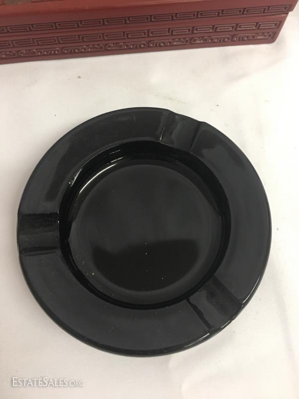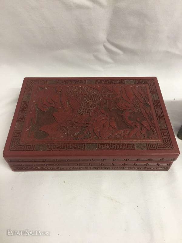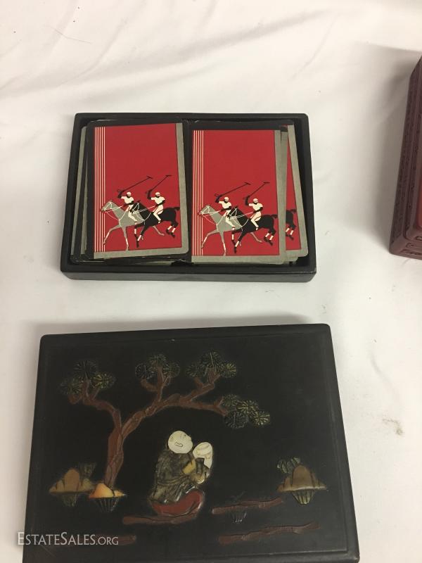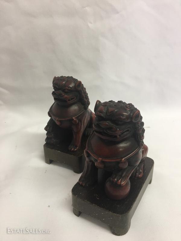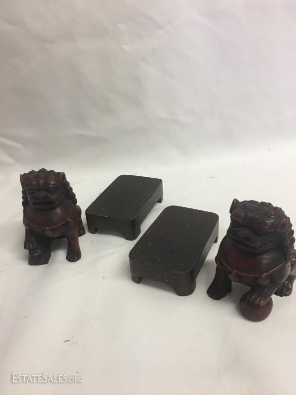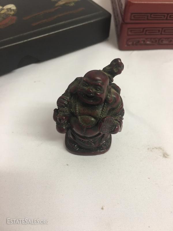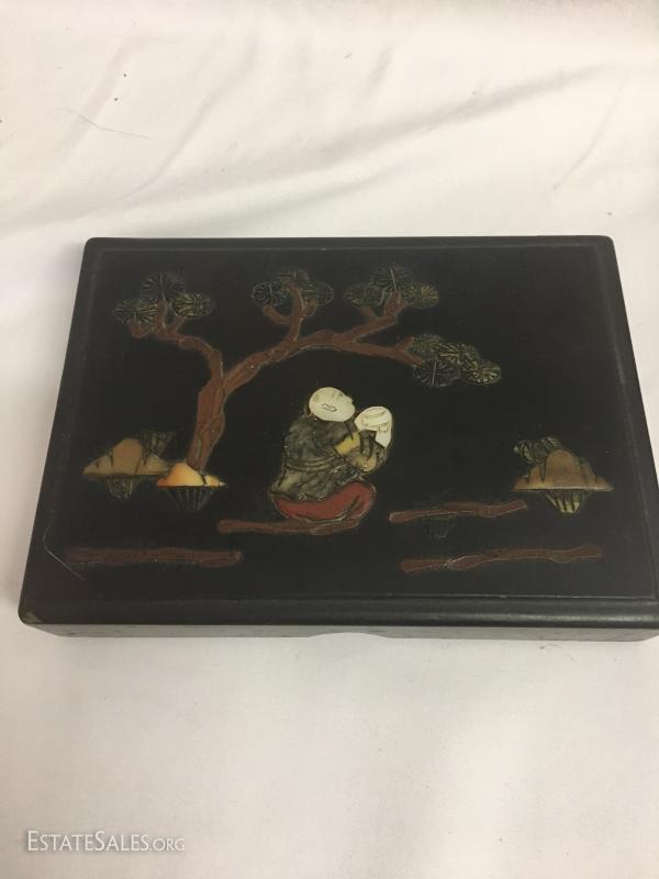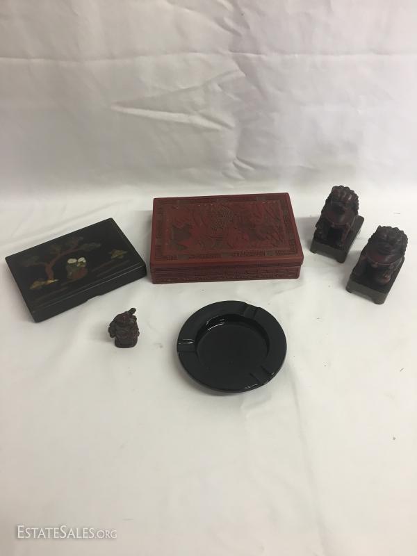 Black ceramic ash tray. Cinnabar writing box, black resin box with playing cards, two lion statues on stands and small Buddha. Lion statues measure 4" tall on stands and red cinnabar box is 8" x5" X1.5". This lot is avaiable for shipping or local pick up in Waynesville, NC.