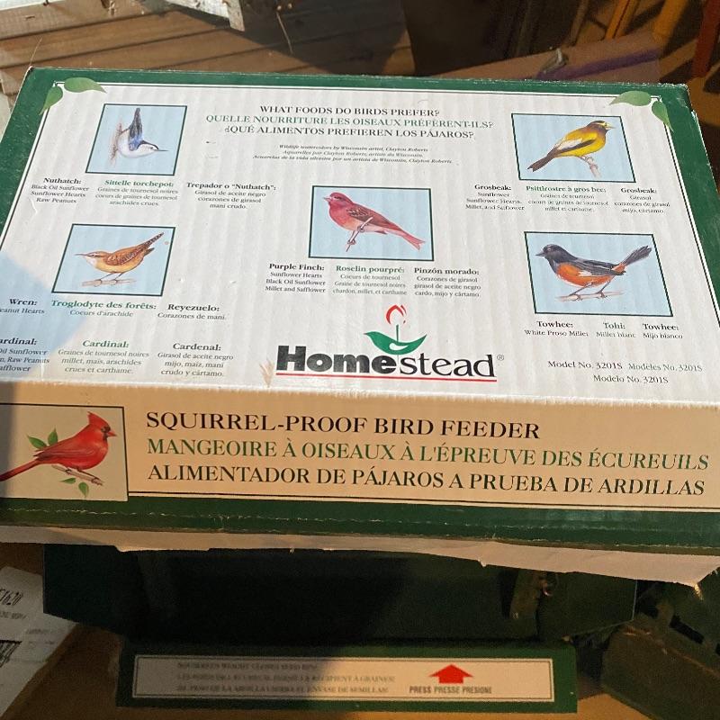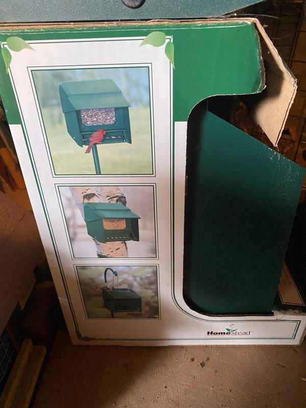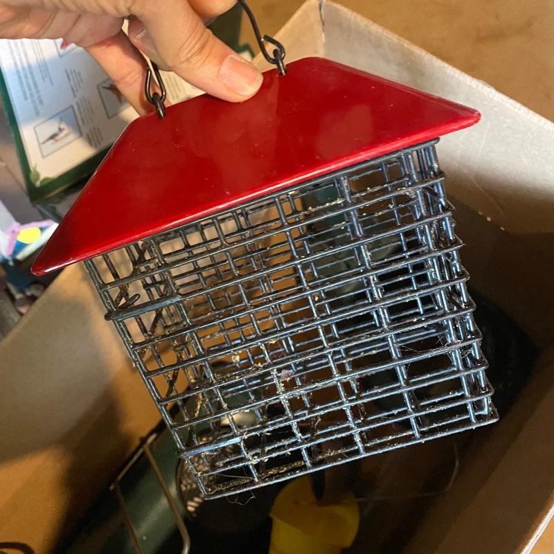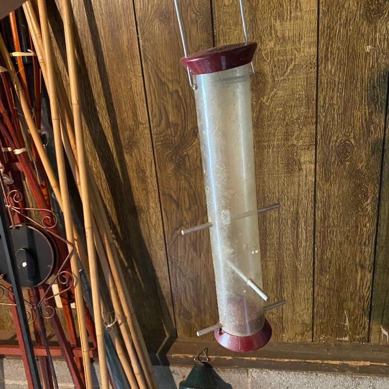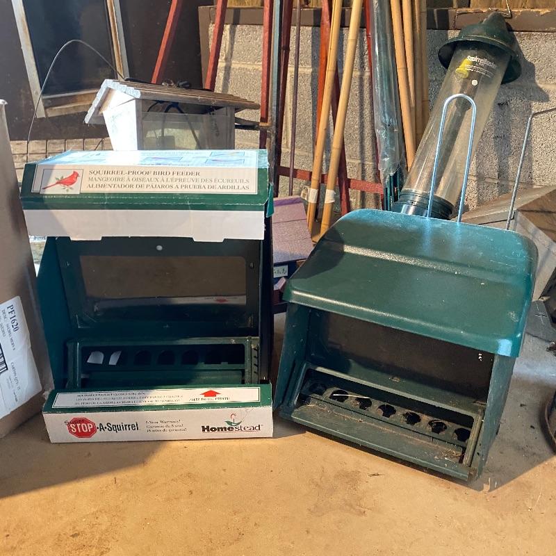 Tired of those fluffy tailed nuisances stealing all your bird food, then this lots for you! Over 10 bird feeders are included here and whilst not all of them are squirrel proof, many are that includes a brand new Homestead feeder. We have also included a brand new Baffle to add to one of the two poles that comes with this lot.Two scoops are included to help you fill all these feeders. There is also one bird house. One metal top feeder is missing its top hanging attachment. This feeder measures 15” tall. To further enhance your outdoor space, we have included a cast iron bench. This bench is just the ends and the back. You will need to add the wood seat to be make it functional. Lot also has tiki torches, a wood trellis and various garden stakes, see images.