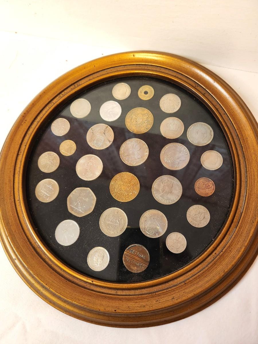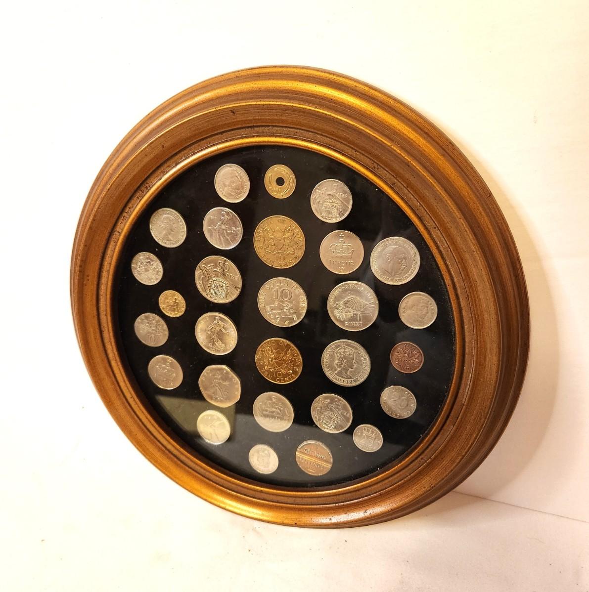 Lot #27 Foreign Coin Lot in Round Frame - England, Kenya, France, etc