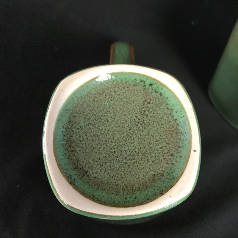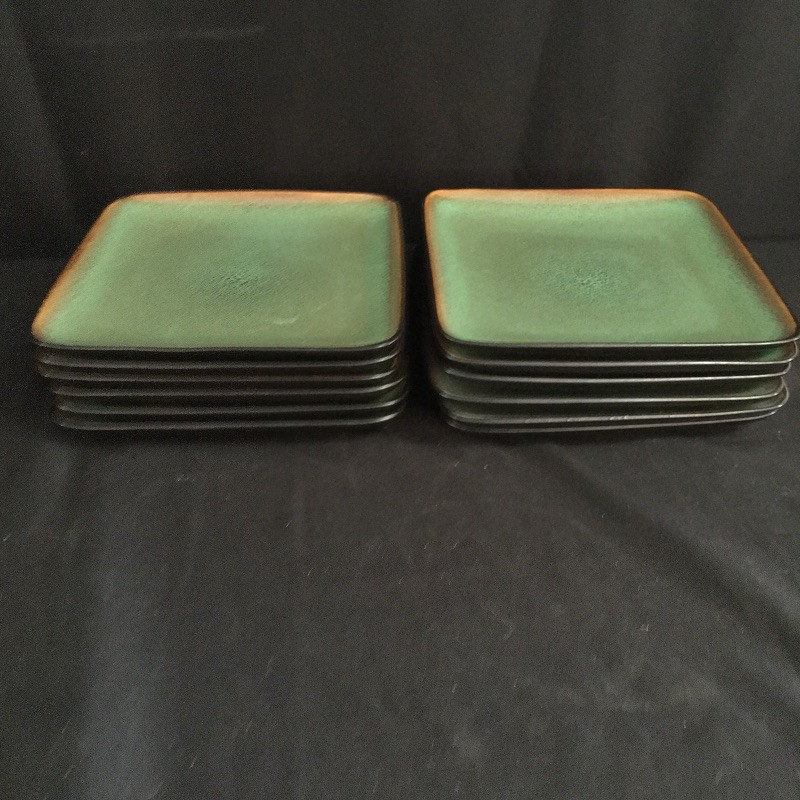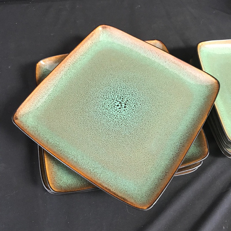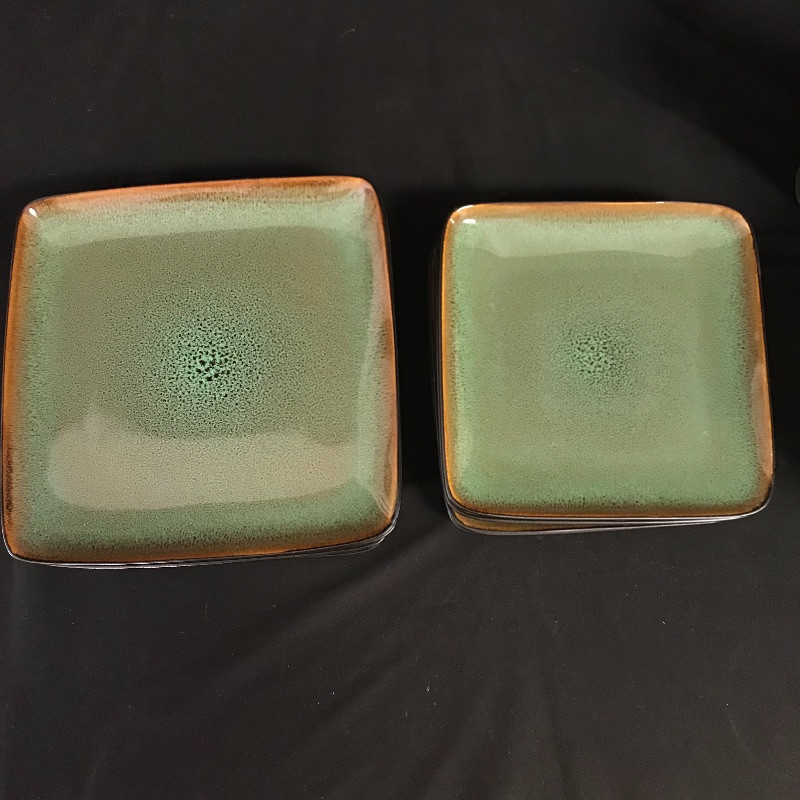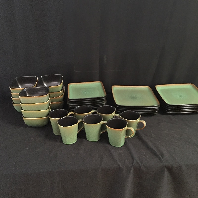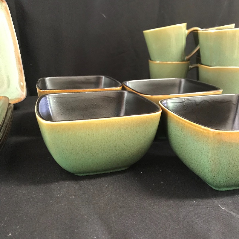 Four piece modern green stoneware set. Plates and bowls state dishwasher, microwave and oven safe. Set is complete with twelve each 10.5” and 8” square plates, twelve bowls and seven mugs. Dishes look lighter with a black background. Color closest to true is shown in the photo with the tan background.