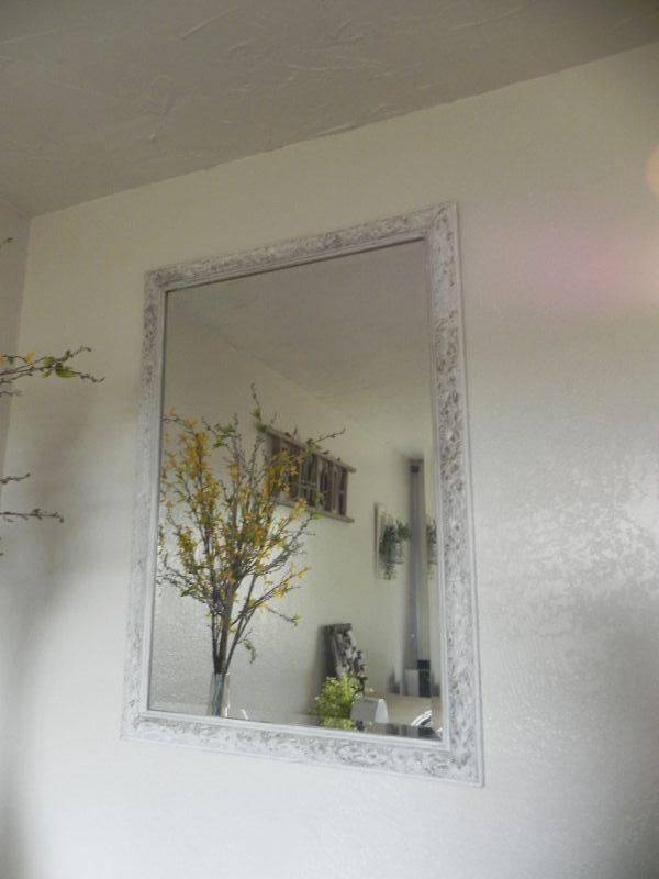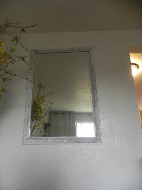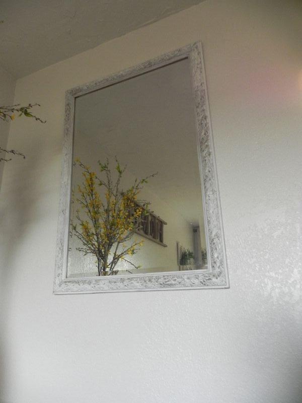 MEASURES 29"X39", SHABBY CHIC PAINTED CREAM COLORED METAL FRAME, MIRROR IS BEVELED.