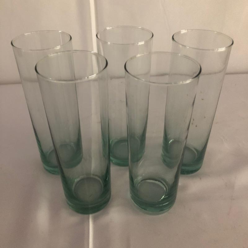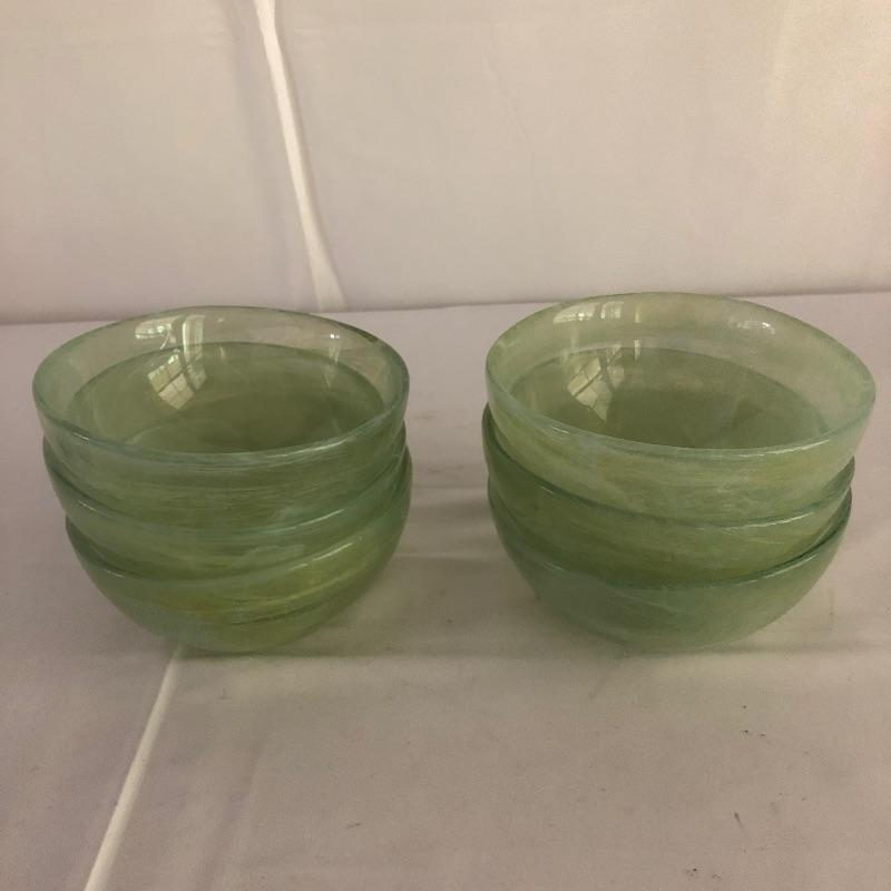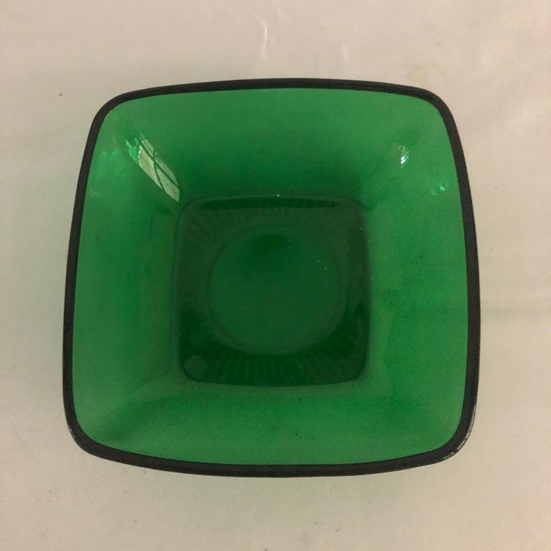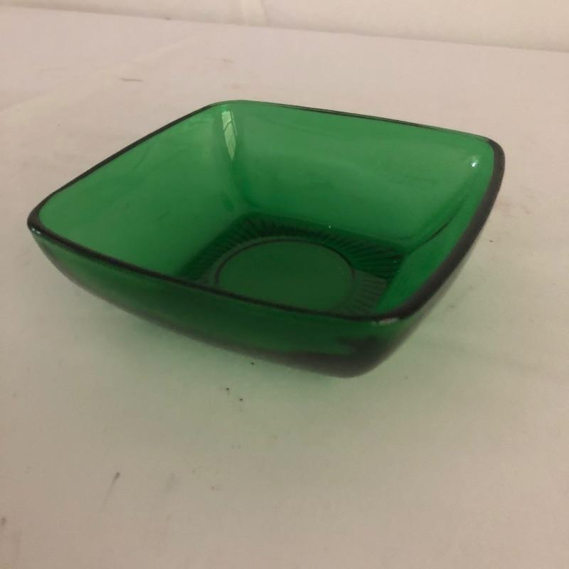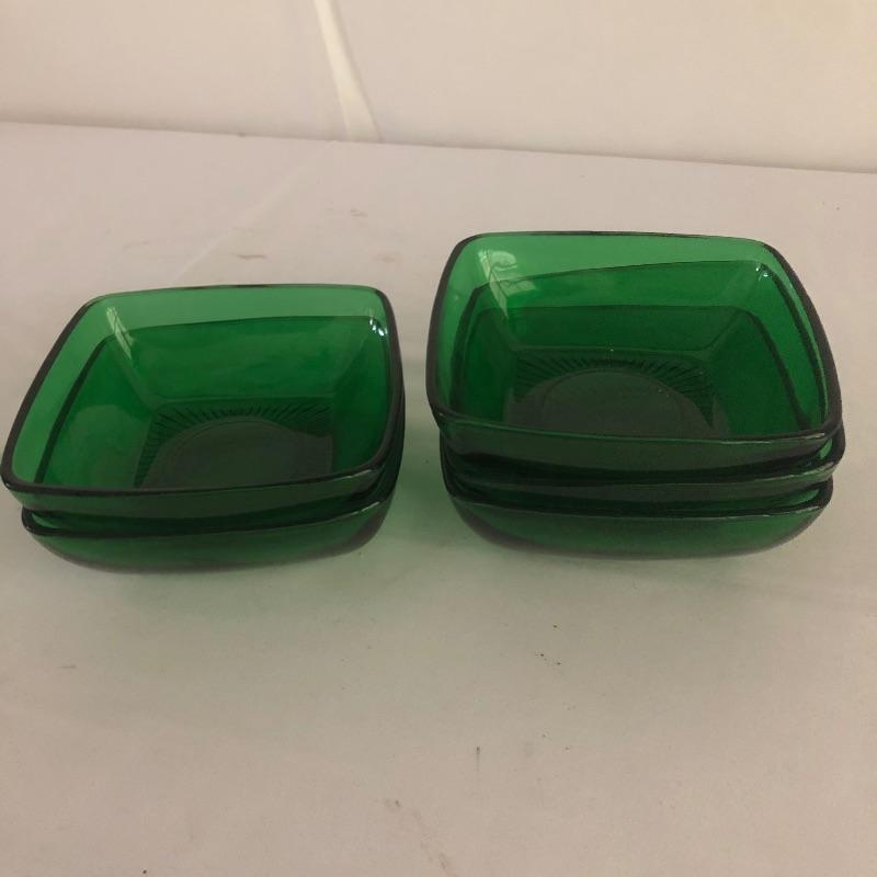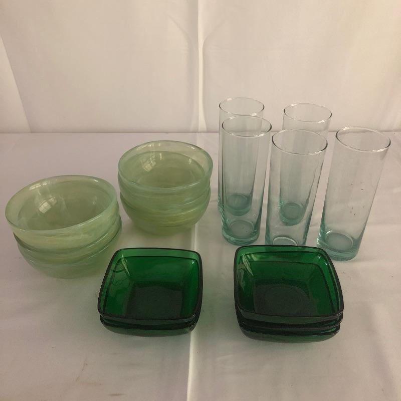 Let these green glass dishes add some pops of color to your table! Lot includes five 7.25” glasses with hints of green, seven 5.5”d jade colored bowls, and Five bold emerald green 5” square dishes. Shipping available.