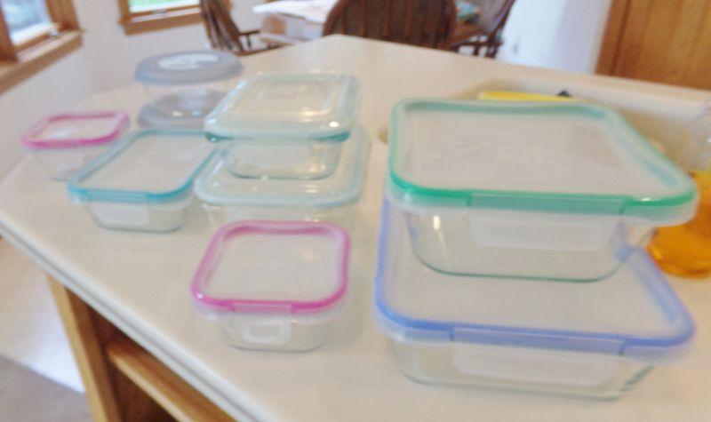 9 GLASS CONTAINERS WITH LOCKING PLASTIC LIDS