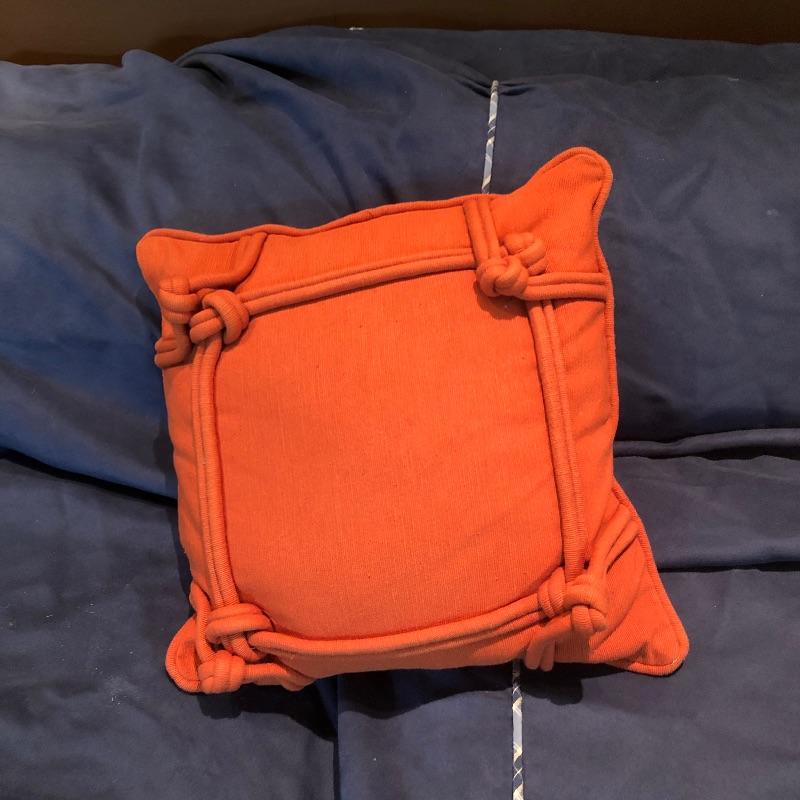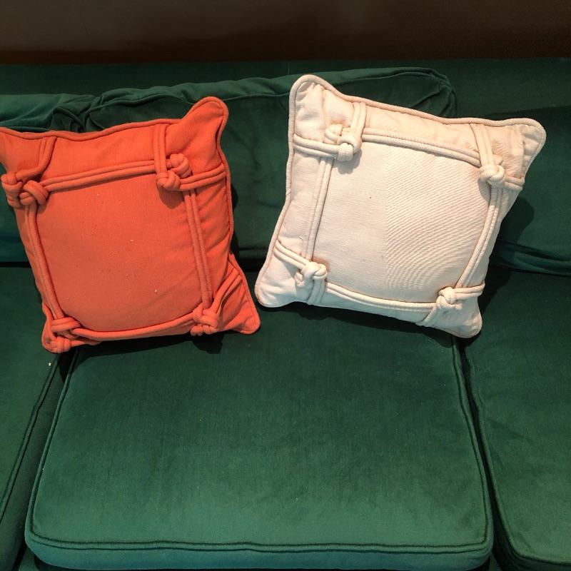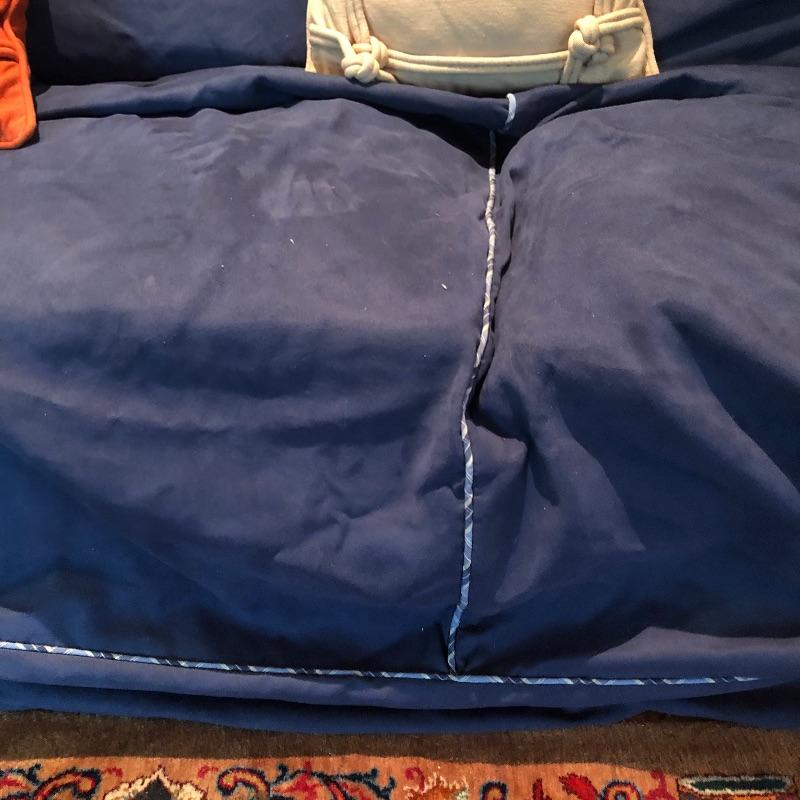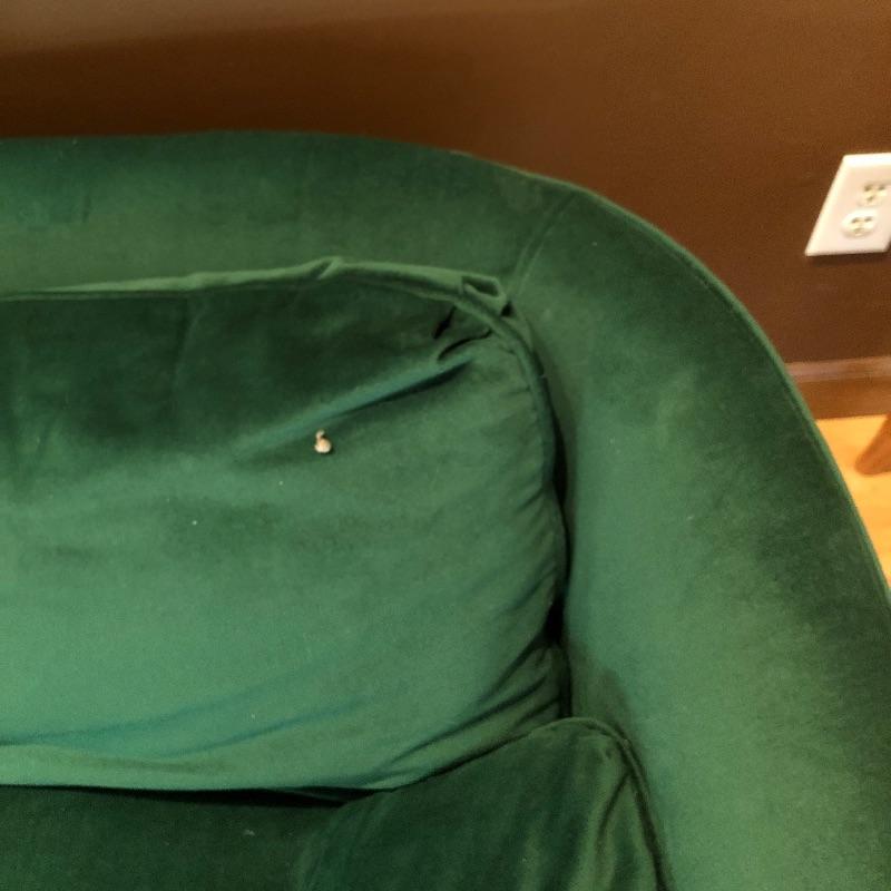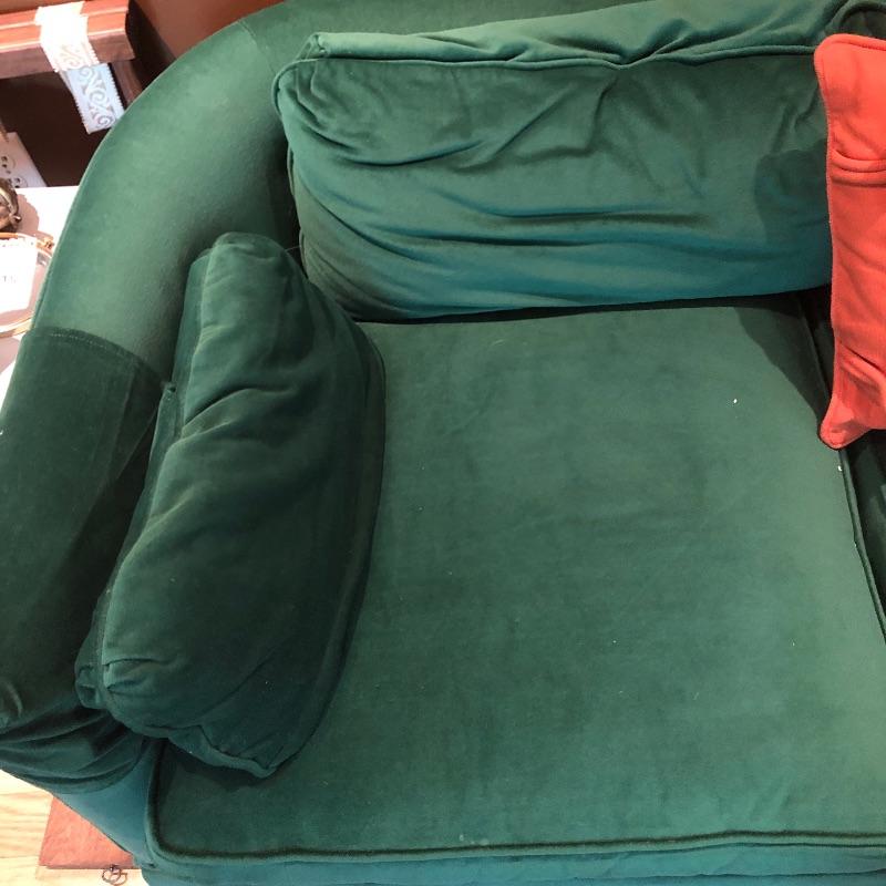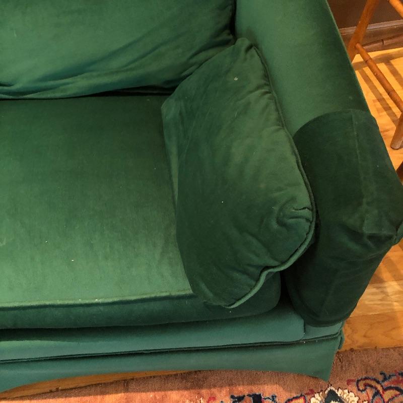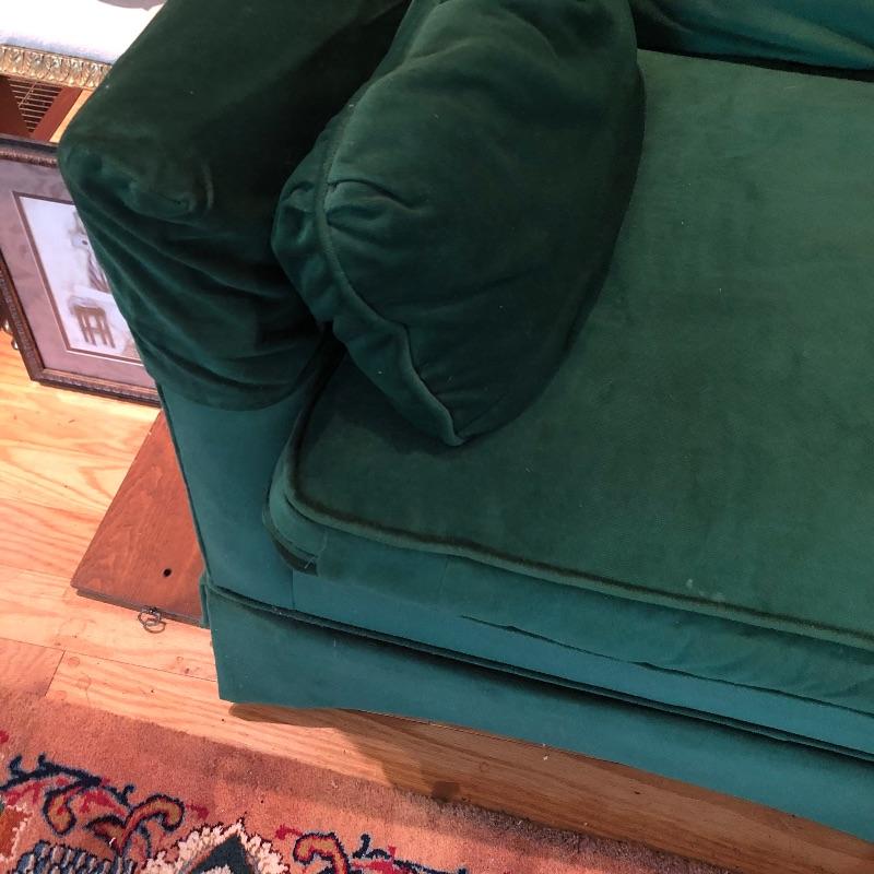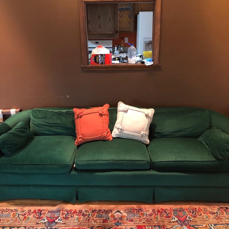 This large, green couch (88.5” x 37” x 24”) certainly has some character! You can leave it as the striking green color, or there is a nice blue fabric slip covering included. It comes with two small pillows, one orange and one cream colored. Spice up your living space with this beauty low rider. Local pickup only.