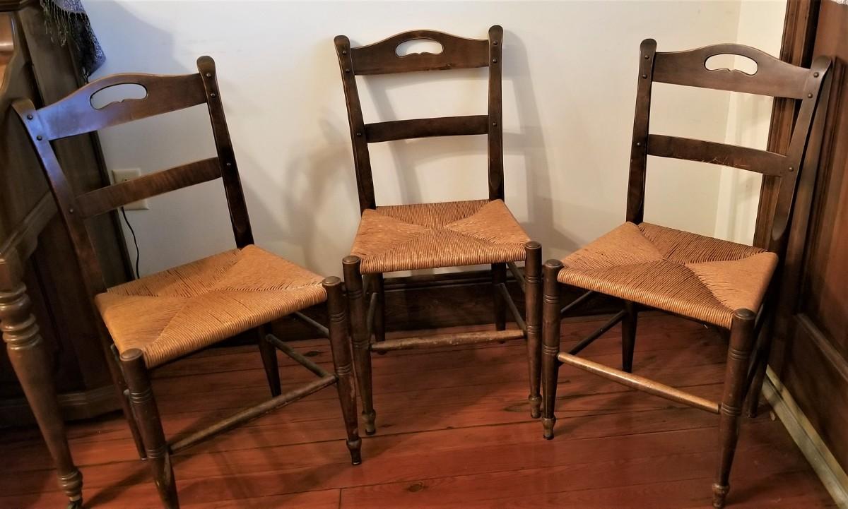 These three matching vintage Rush bottomed side chairs are sturdy and in good condition. Each is 34" tall, 17" across, and 14" deep.
