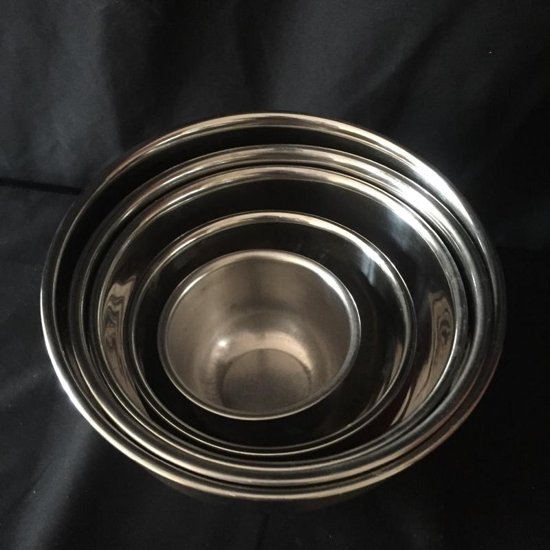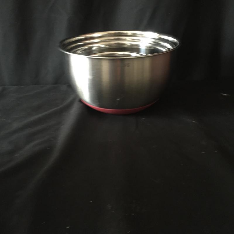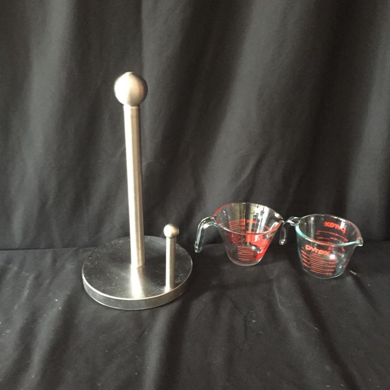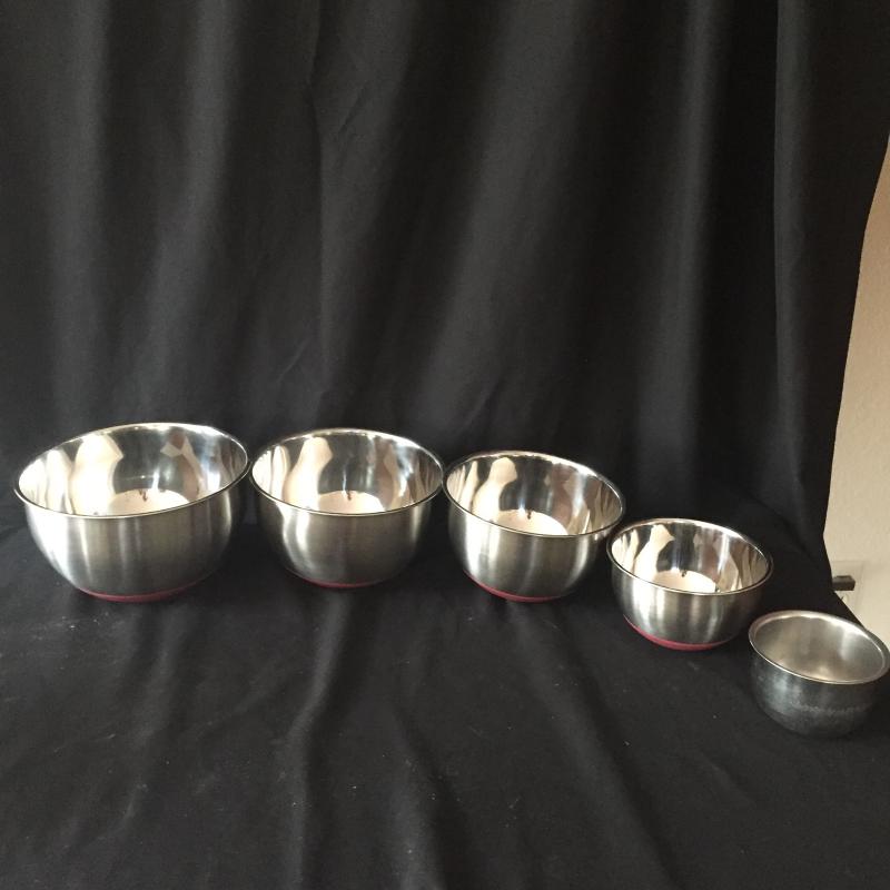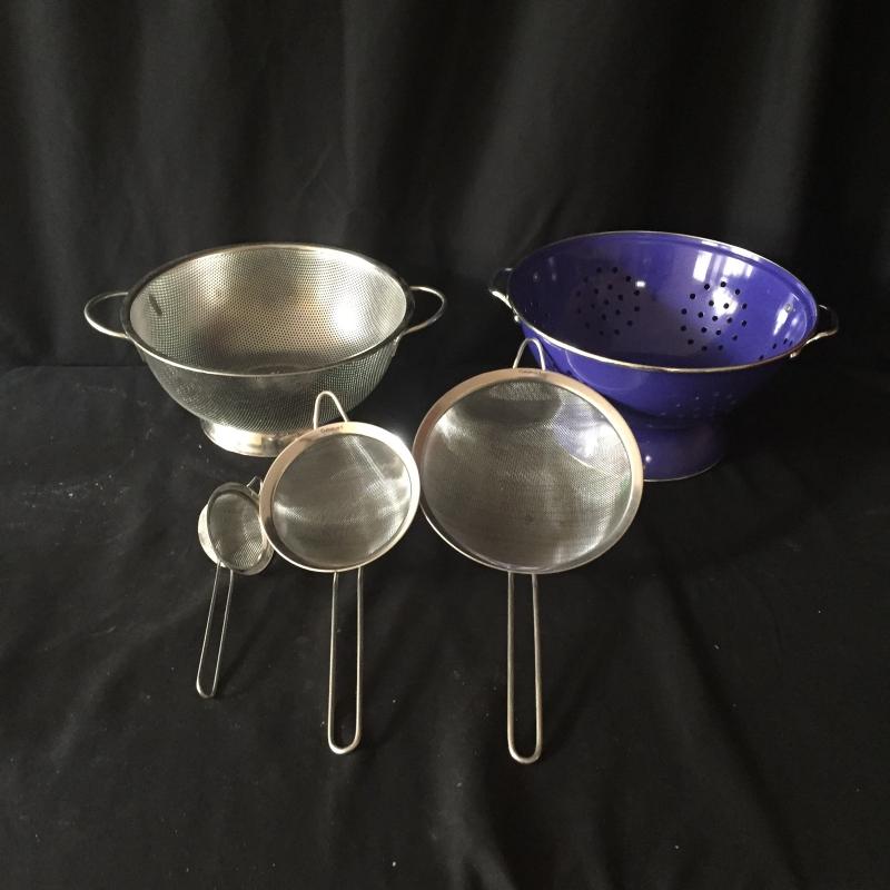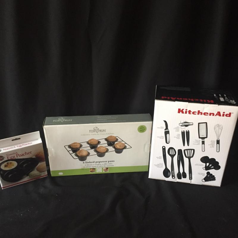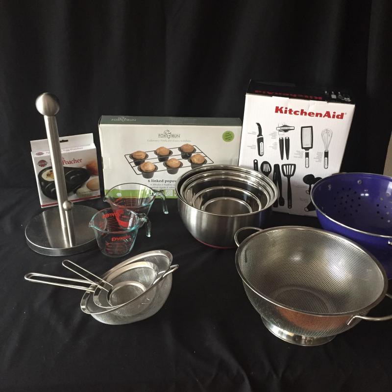 Chefs nesting bowls, pair of colanders, paper towel holder, pair of measuring cups, Cuisinart fine mesh strainers, Kitchen Aid utensils -New!, six linked popover pans -New! and egg poacher -New!. Largest nesting bowl measures 10”D.