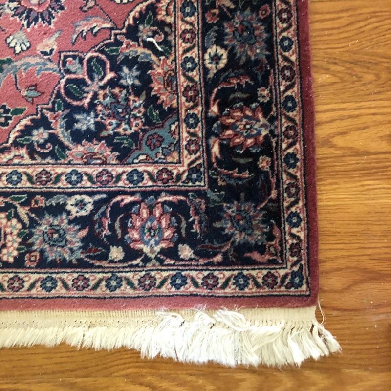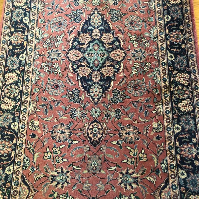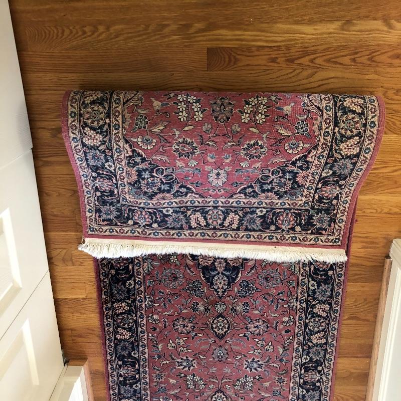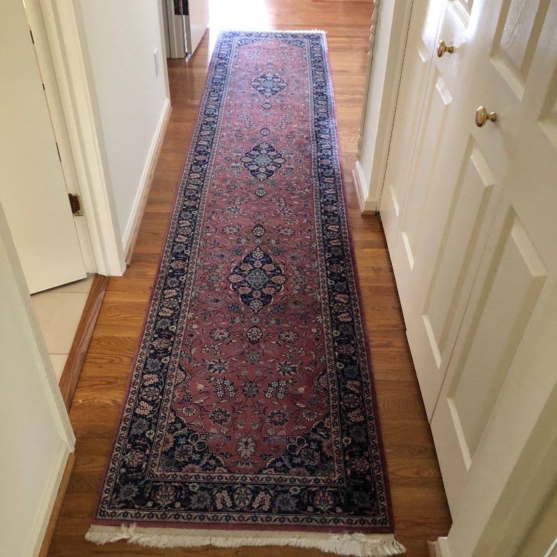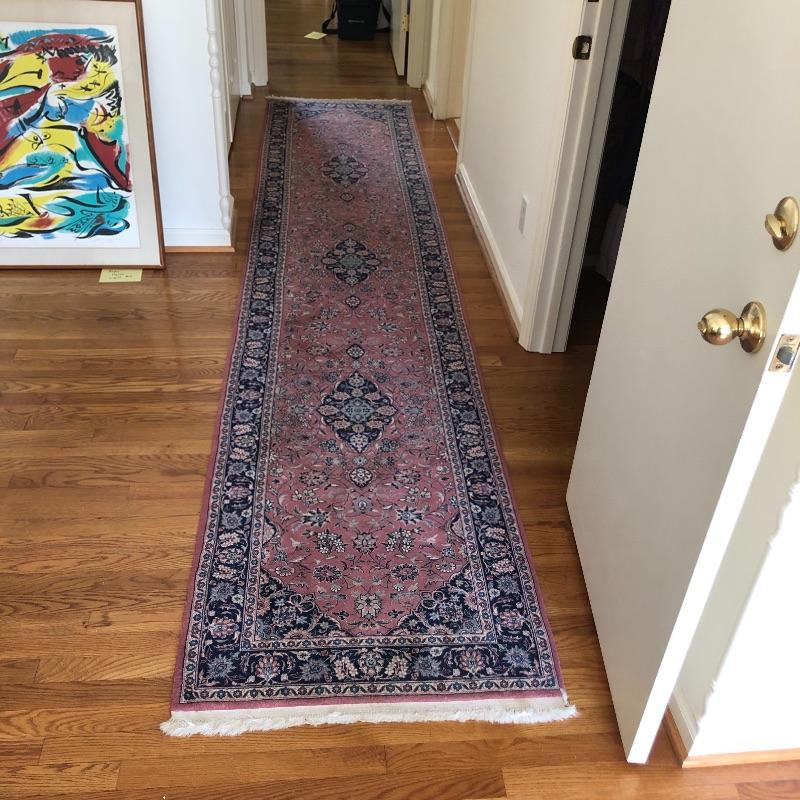 This pretty dusty pink and navy blue rug is very long, measuring 30” wide x 150” long. Rug is in good condition but has some wear on the fringe.