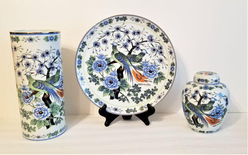 Three matching Asian Style accessories: Column Vase (10" tall), Decorative Plate (10" across), and Ginger Jar "6" tall. Easel comes with the plate. All in excellent condition - very attractive.