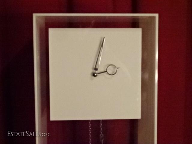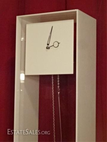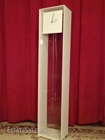 LOT 27: MODERN WHITE ACRYLIC CASE FLOOR CLOCK, CHROME HANDS, LABELED CREATIVE ACCESSORIES, VERY GOOD CONDITION, 61.5"H X 12.5"W X 9"D, SKU387.30