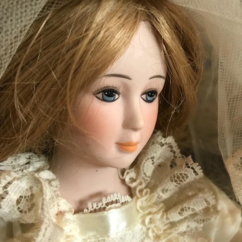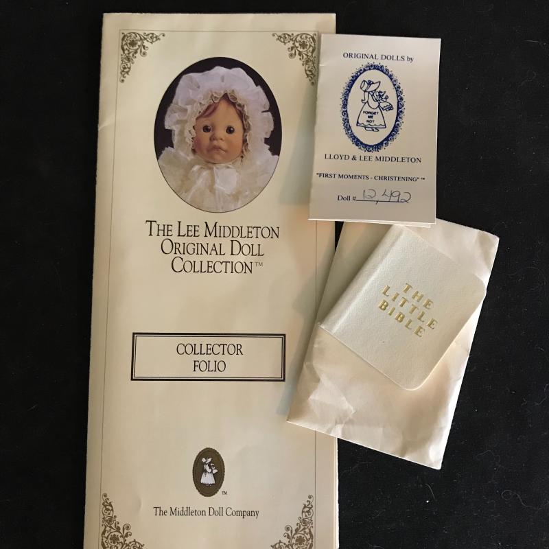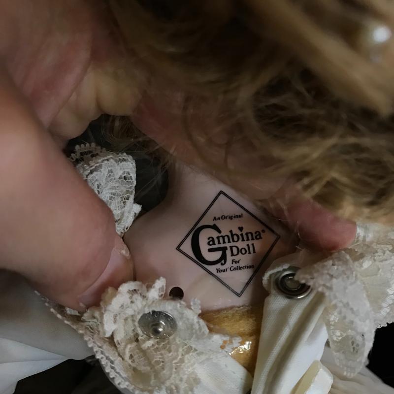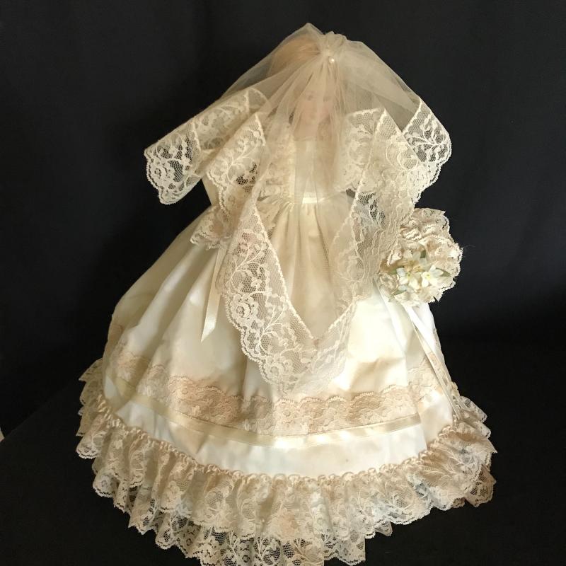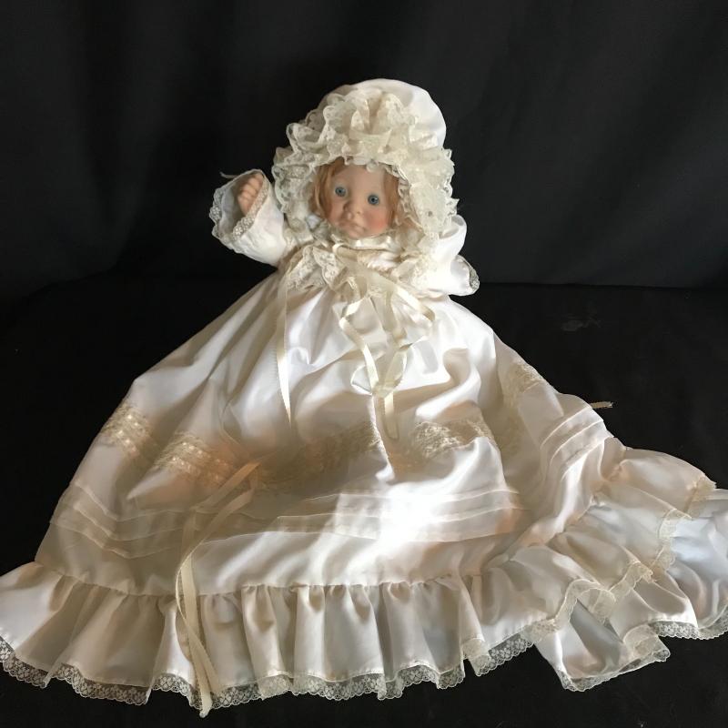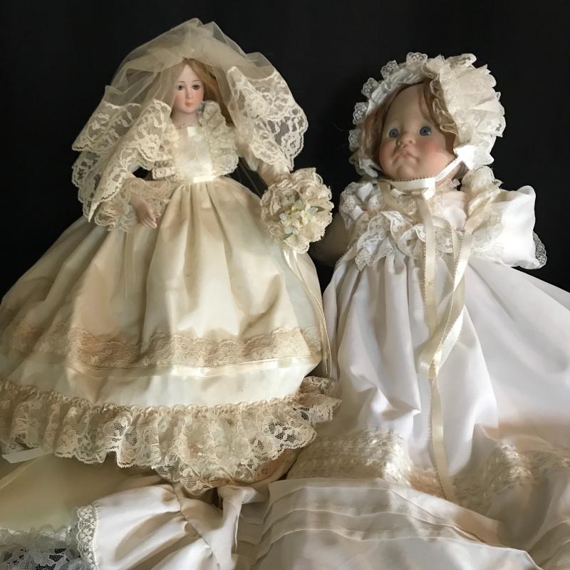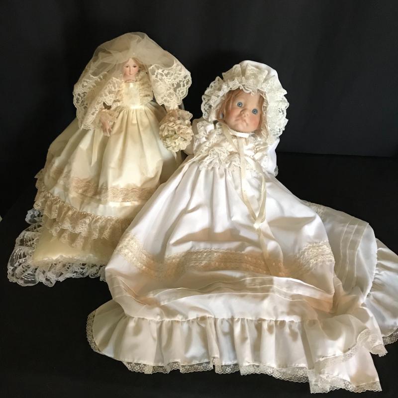 Elegant Gambina “Lorraine” wedding doll with certificate of authenticity. She’s complete with stand, adorned hair, veil and with shoes stored in bubble wrap. Lorraine is accompanied by a ring bearing pillow. Second doll is a “First Moments -Christening Doll” with glass eyes. Both dolls have dust and dog hair present. Shipping available.
