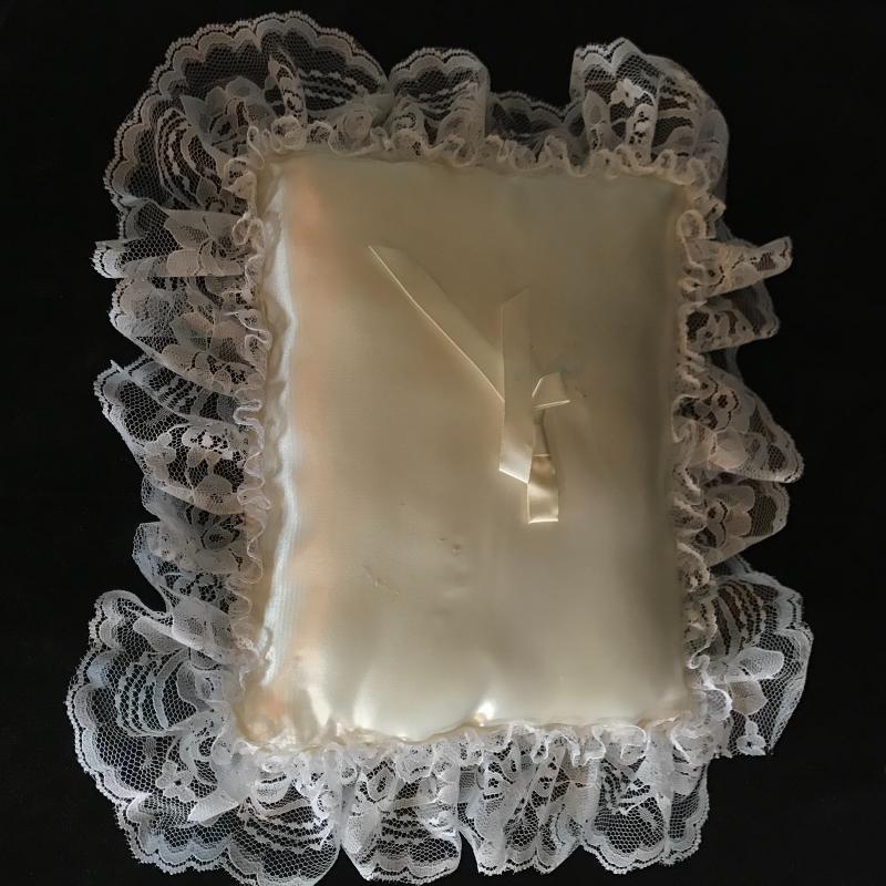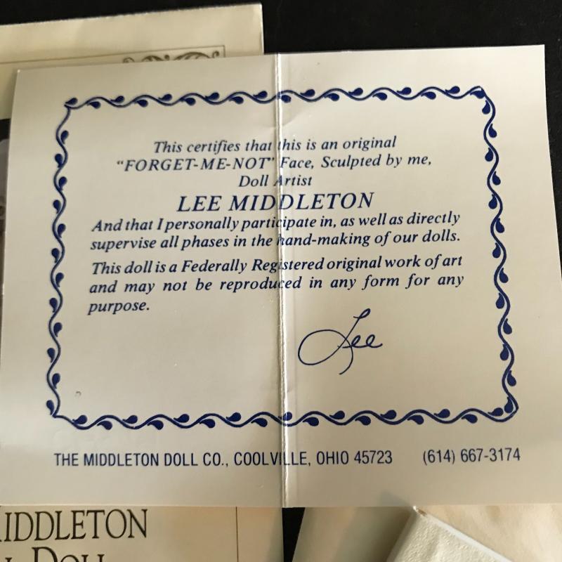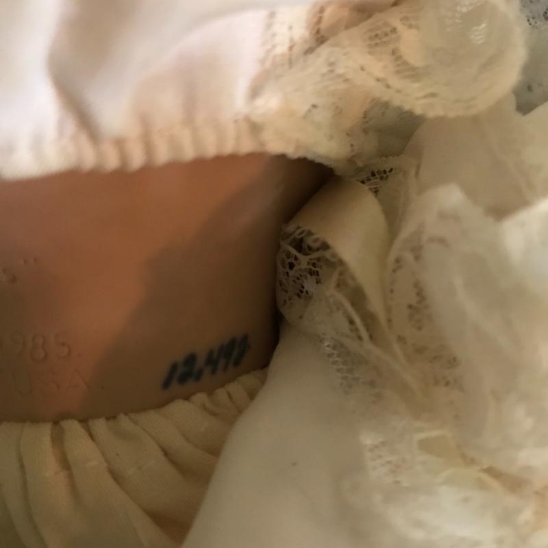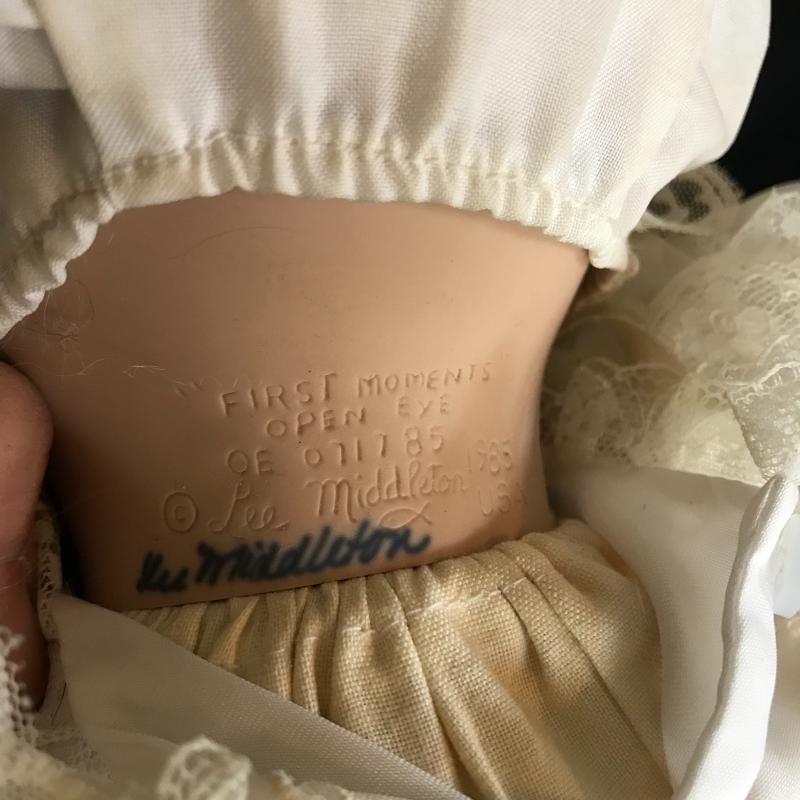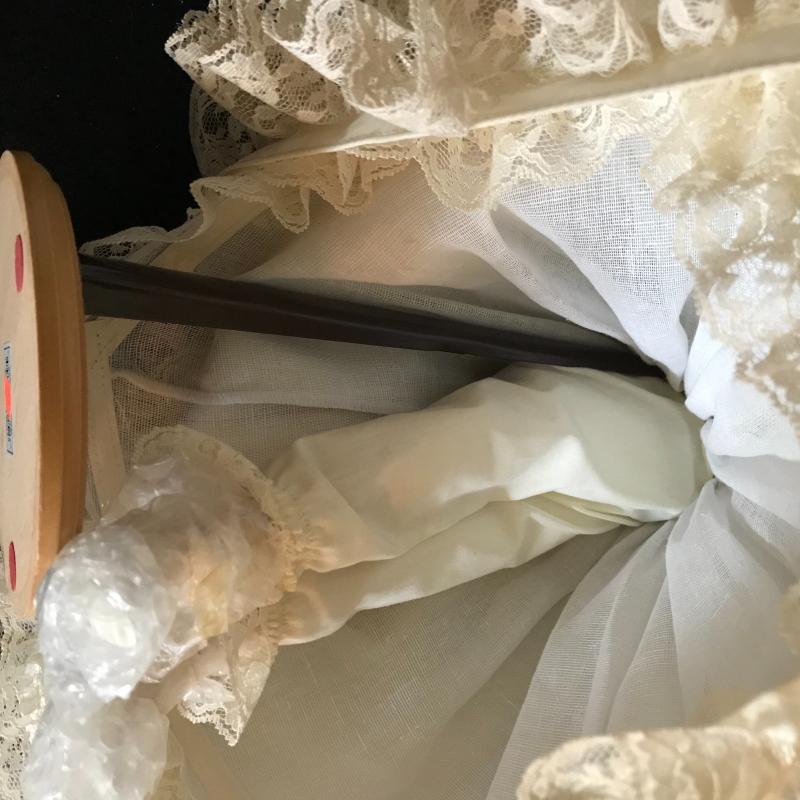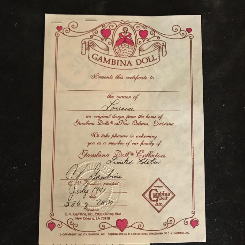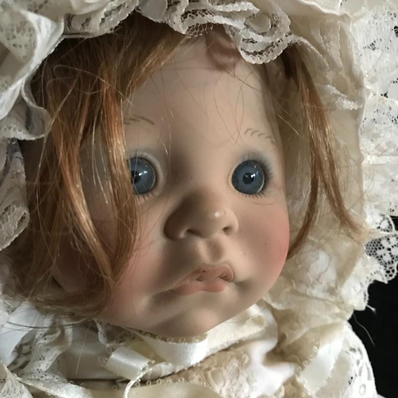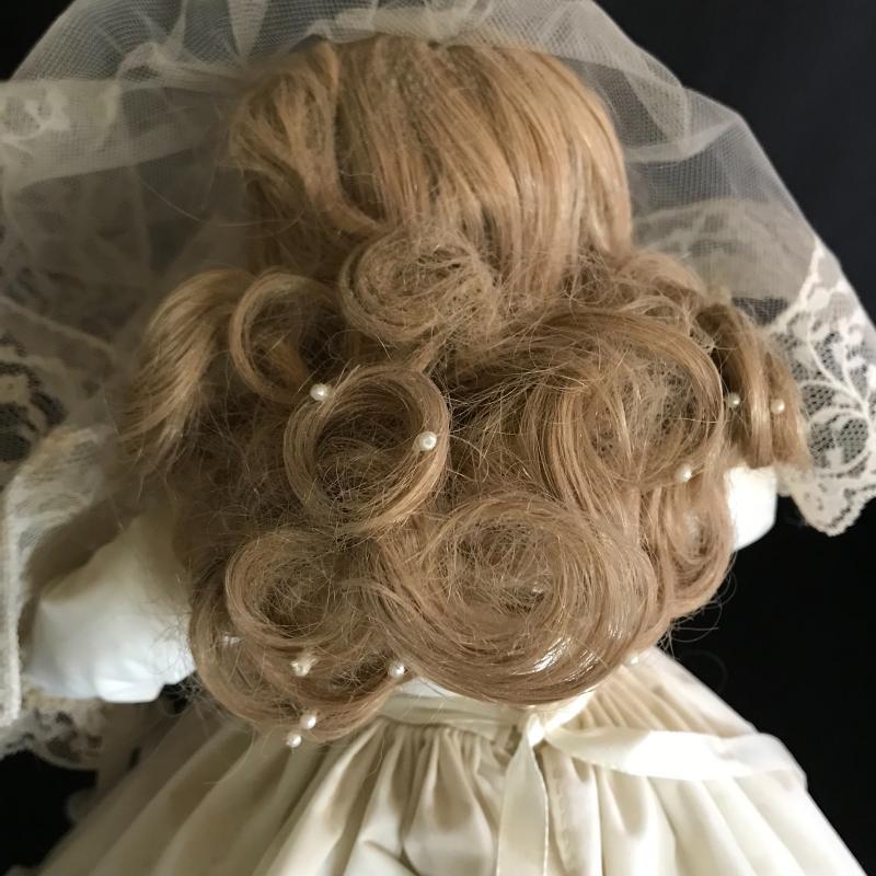 Elegant Gambina “Lorraine” wedding doll with certificate of authenticity. She’s complete with stand, adorned hair, veil and with shoes stored in bubble wrap. Lorraine is accompanied by a ring bearing pillow. Second doll is a “First Moments -Christening Doll” with glass eyes. Both dolls have dust and dog hair present. Shipping available.