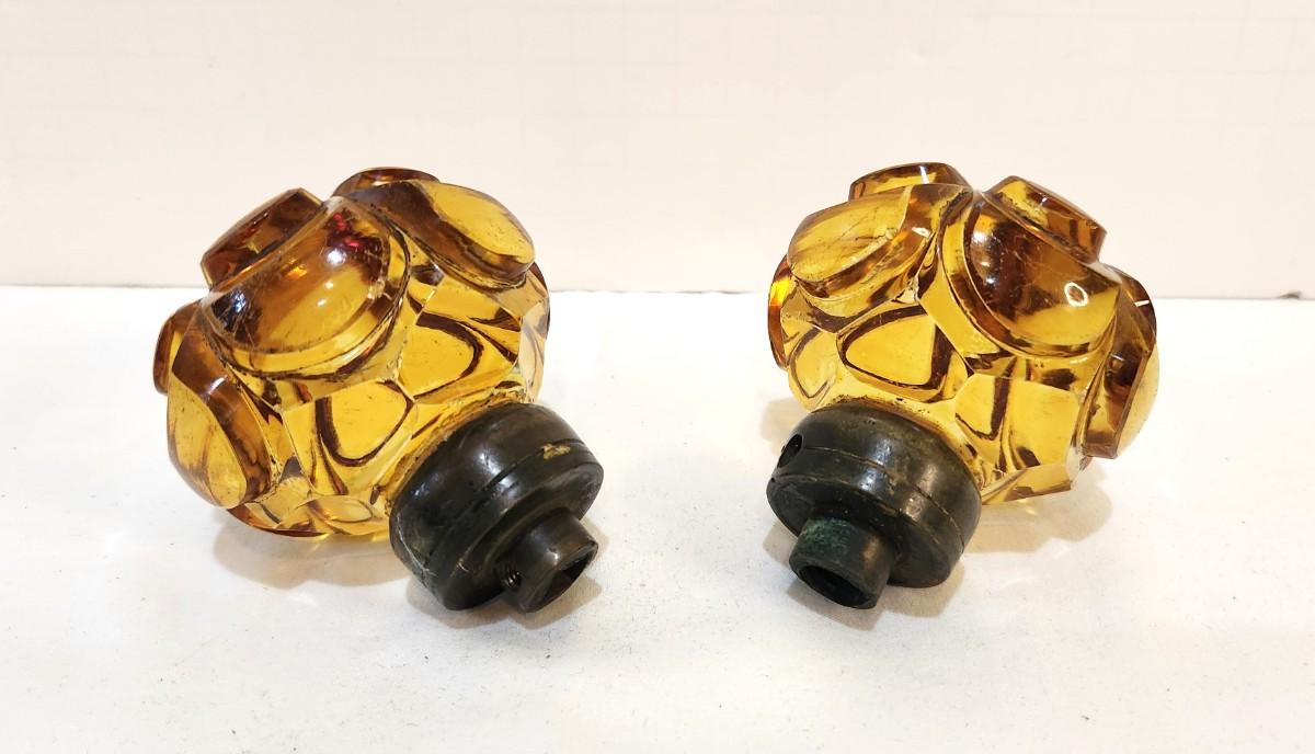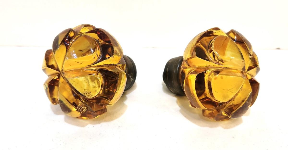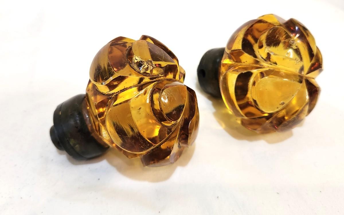 Nice pair of amber glass door knobs, each 3" across, as found.