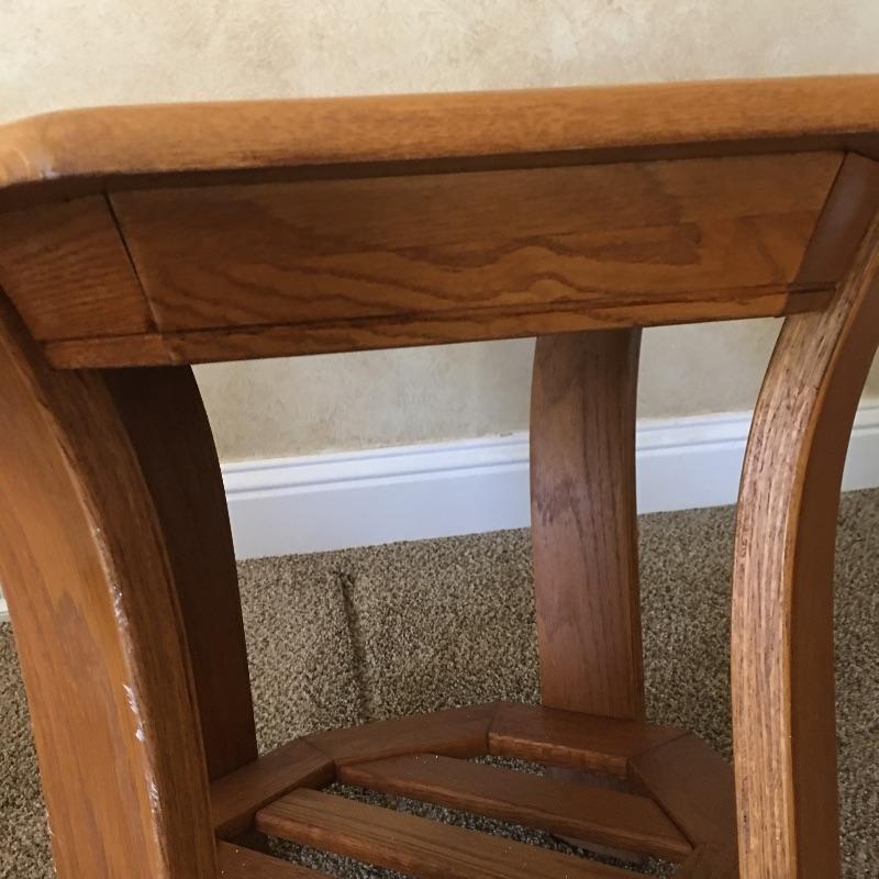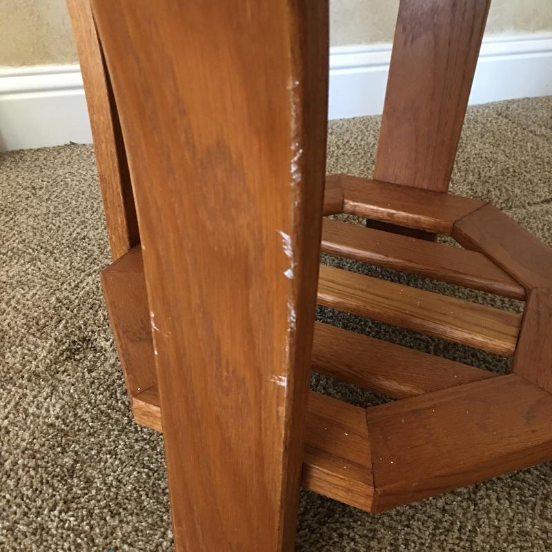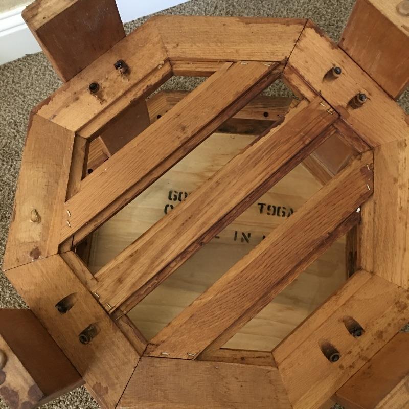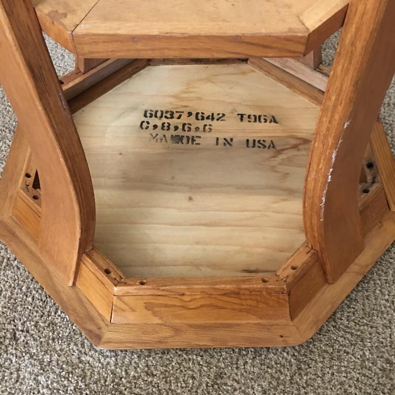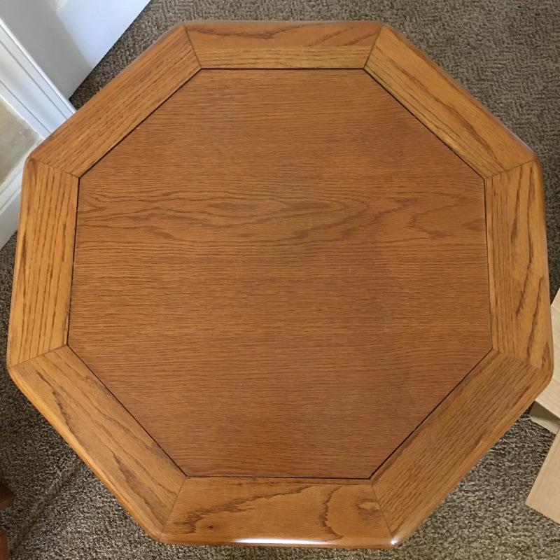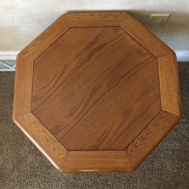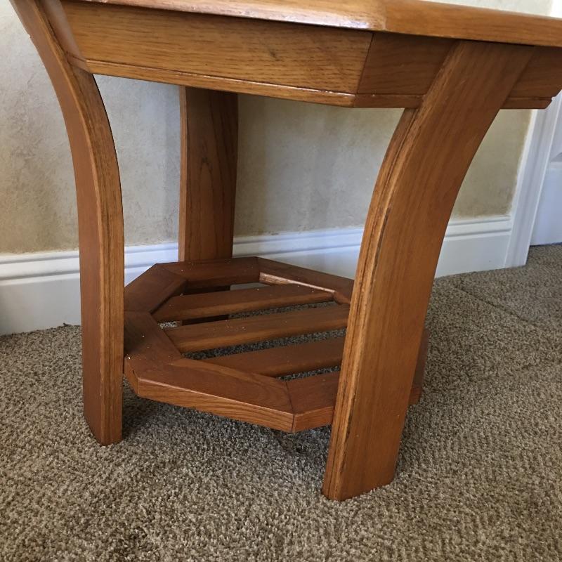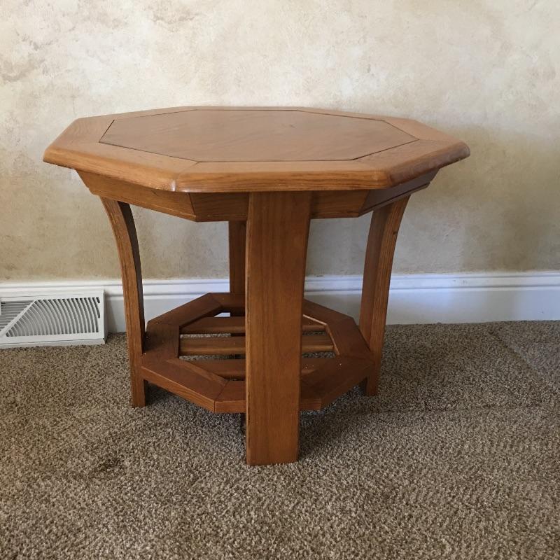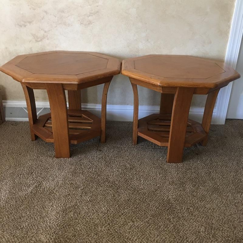 Pair of identical octagonal wooden side tables with slatted shelf underneath. Unique wooden side tables for your home. Tables measure 26” x 26” x 20.5”.