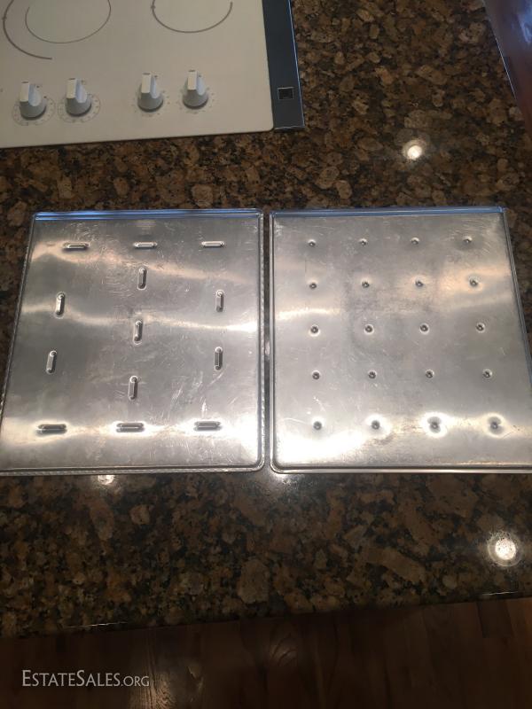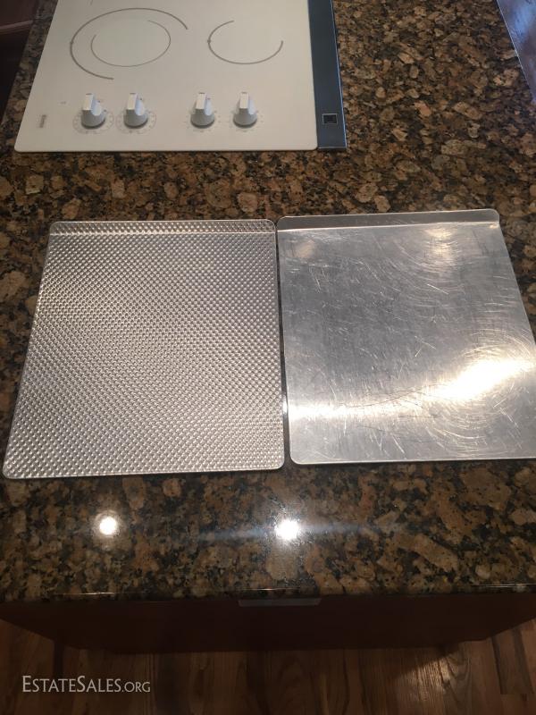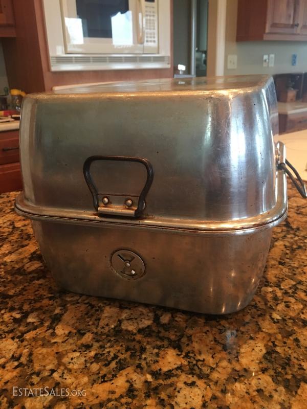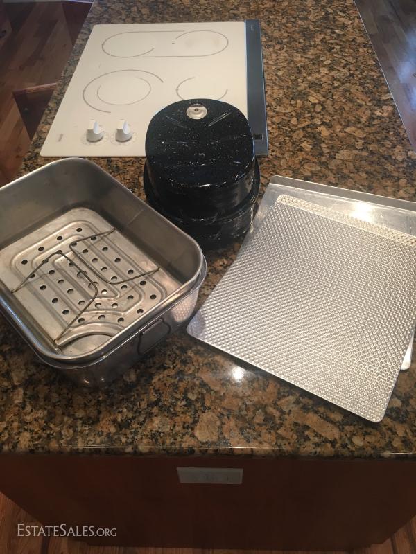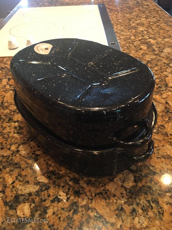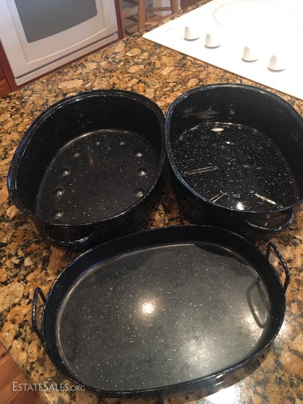Wear Ever Turkey Roaster, two baking sheets and black enamelware roaster.