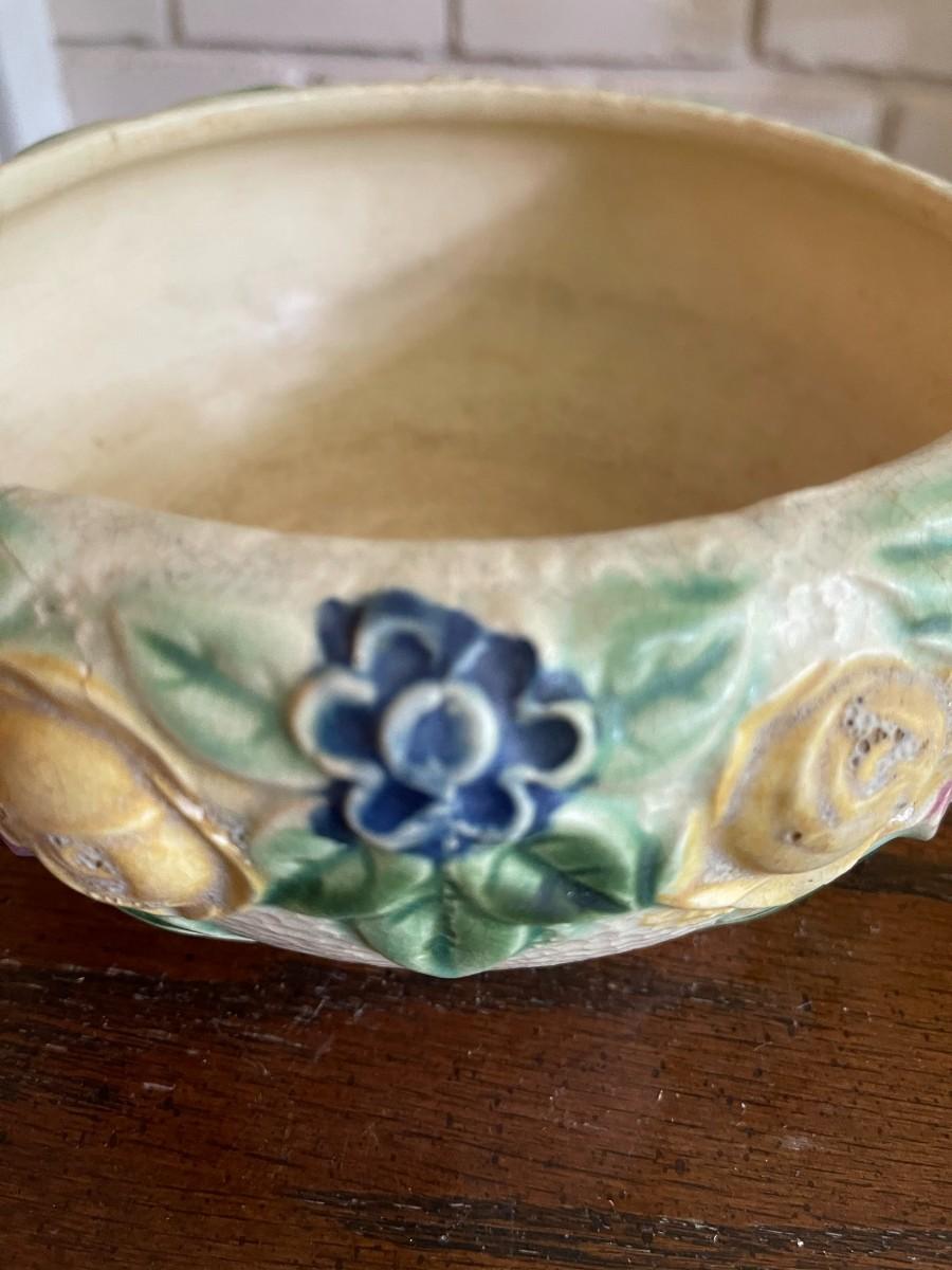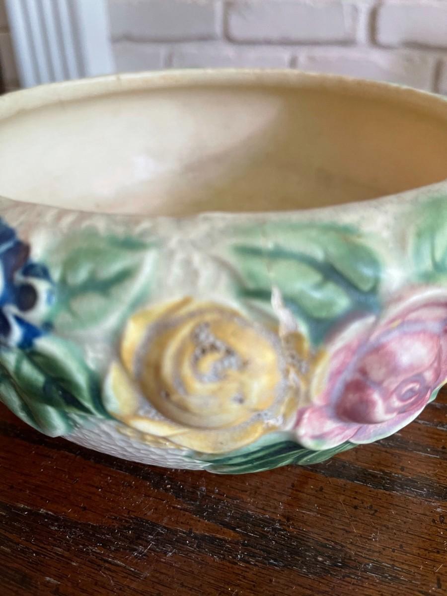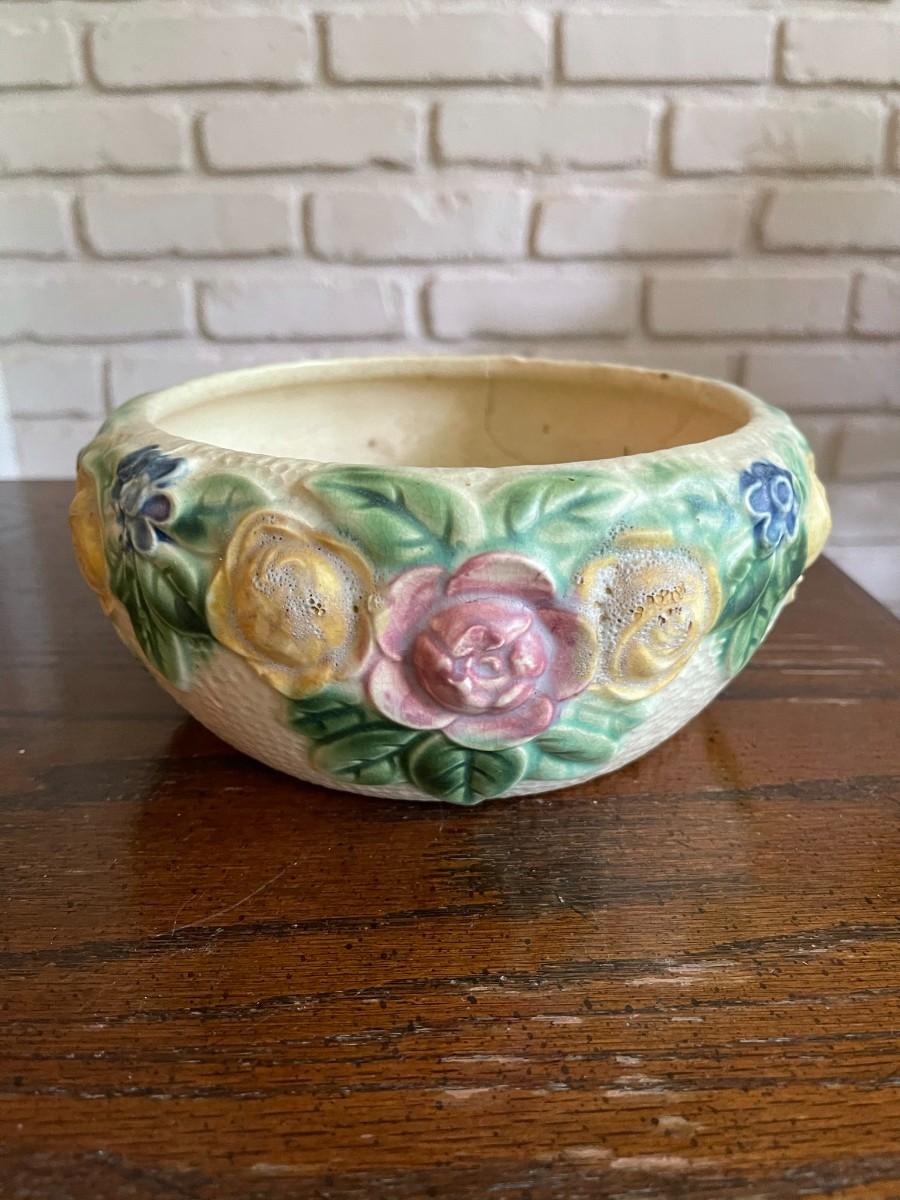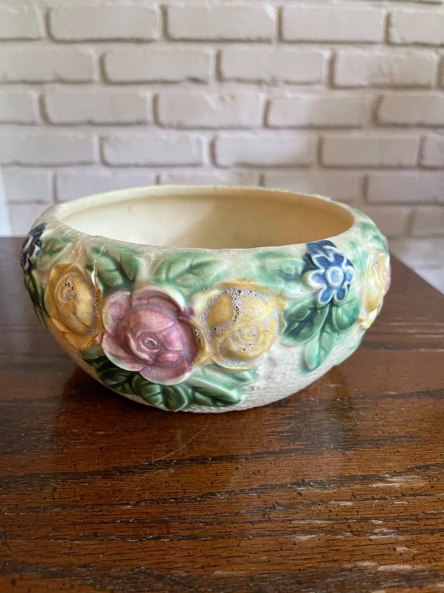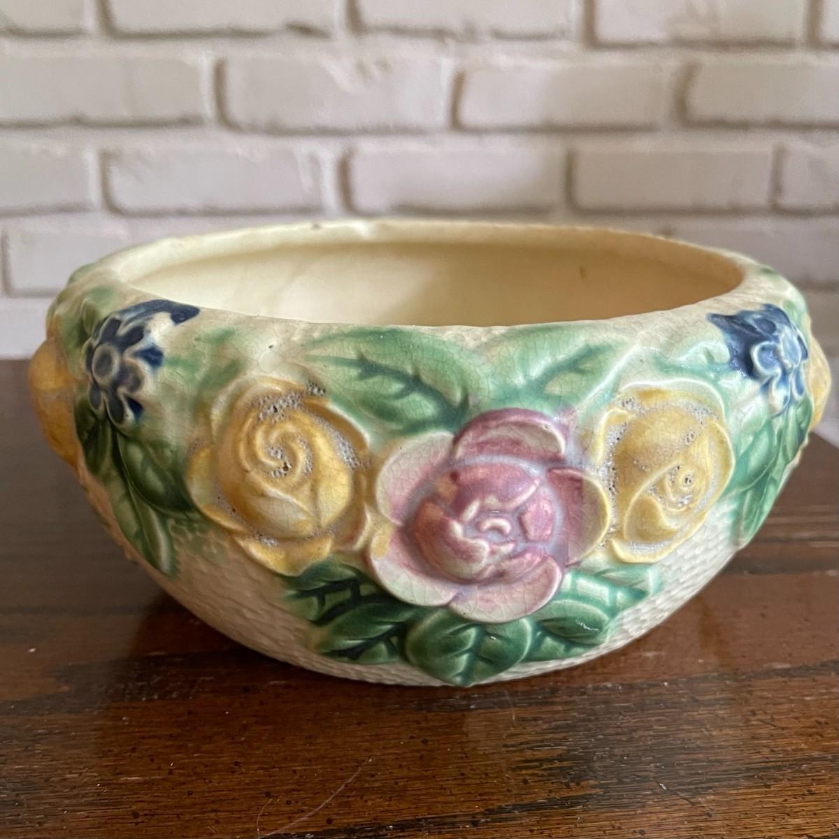 Vintage Roseville Pottery, 1917, Rozane, bowl, cream w multicolor pastel flowers