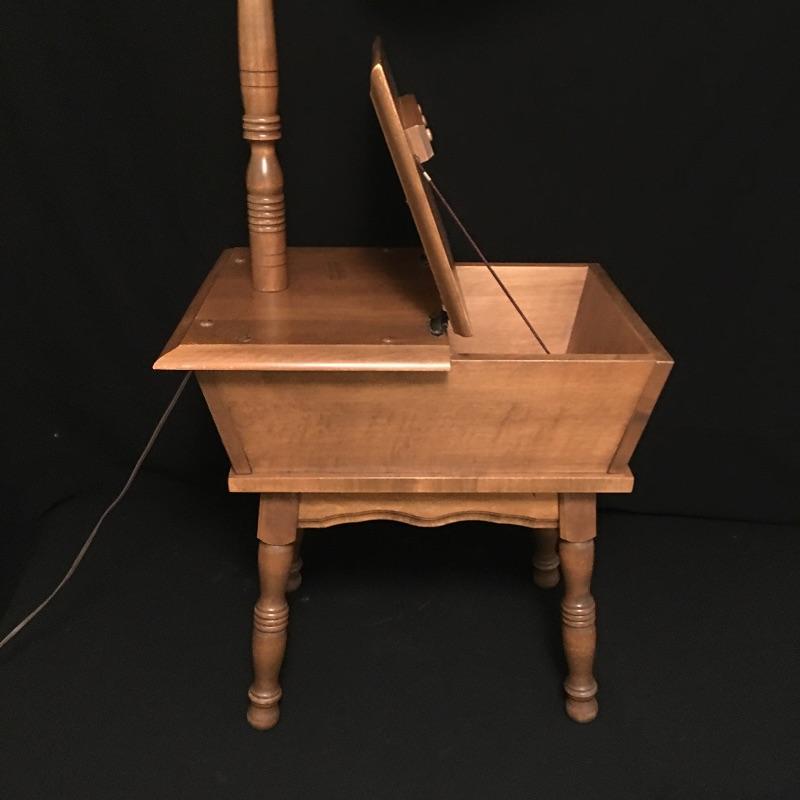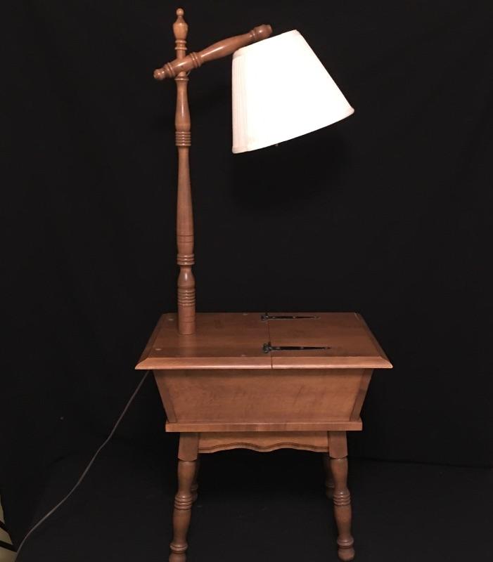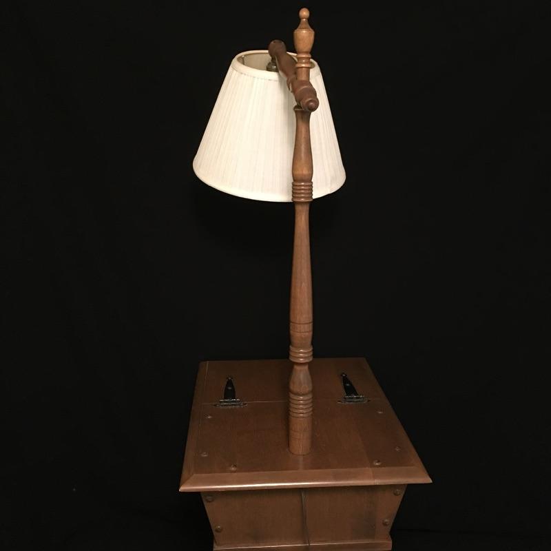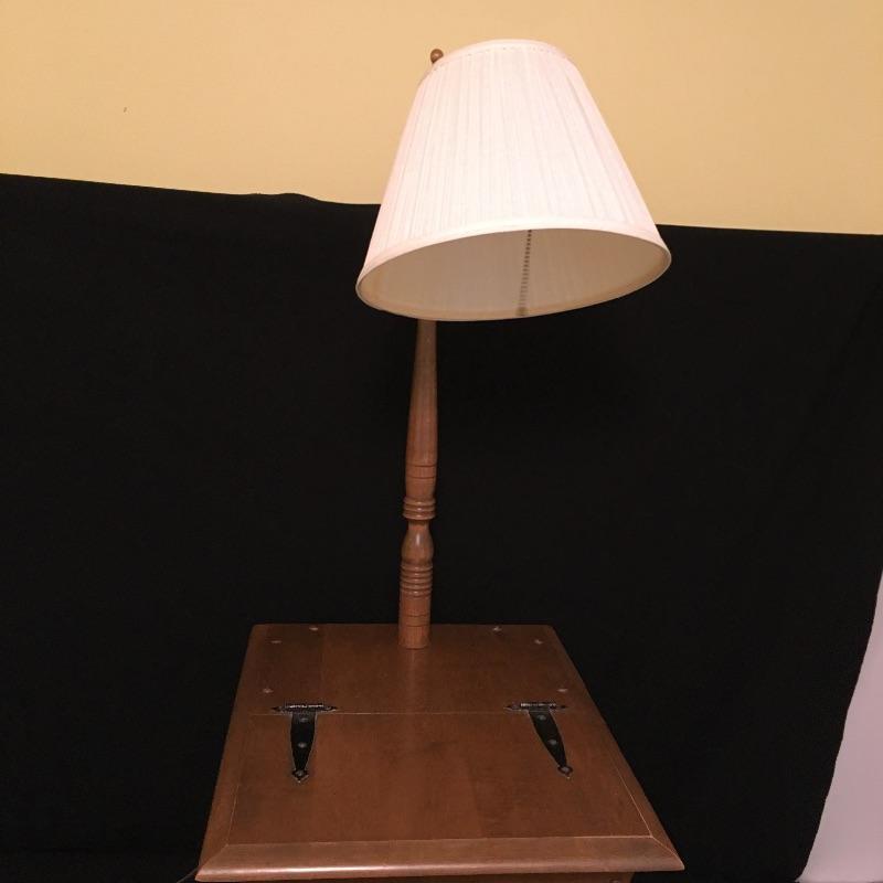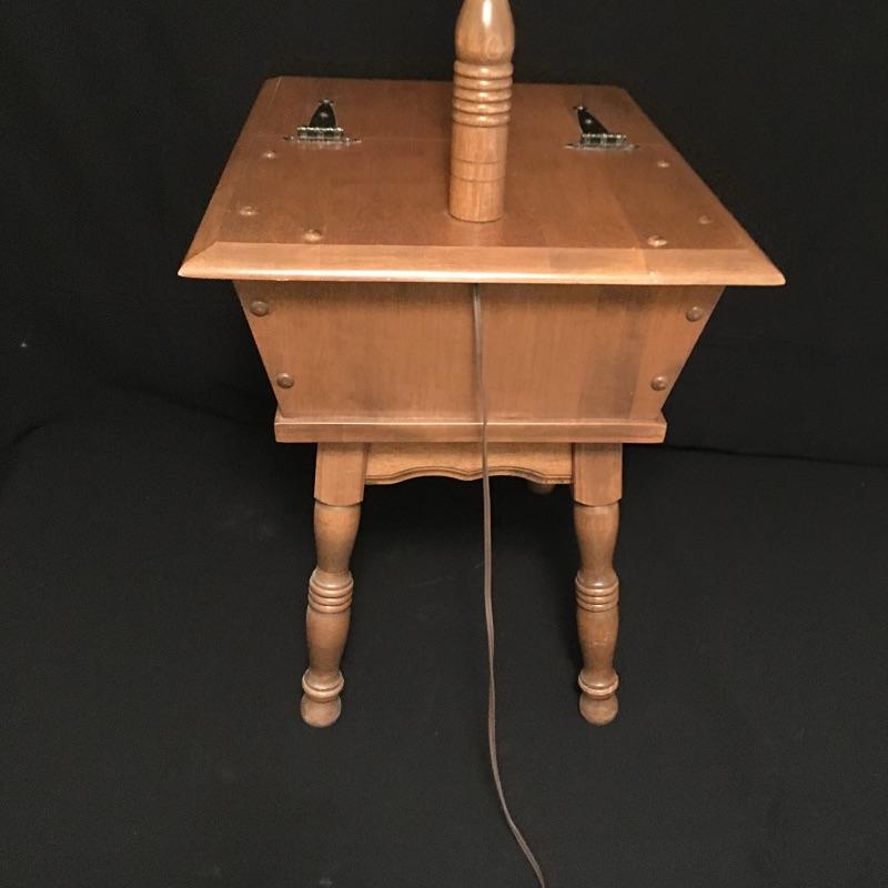Unique and versatile antique wood side table with built in lamp and hinged storage. Two uses in one piece here.