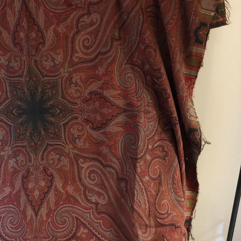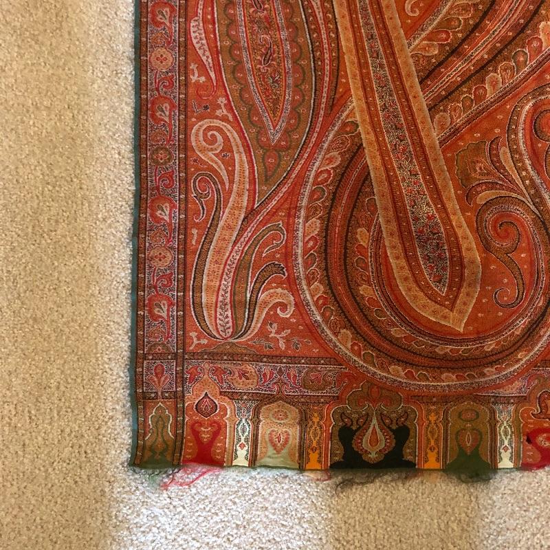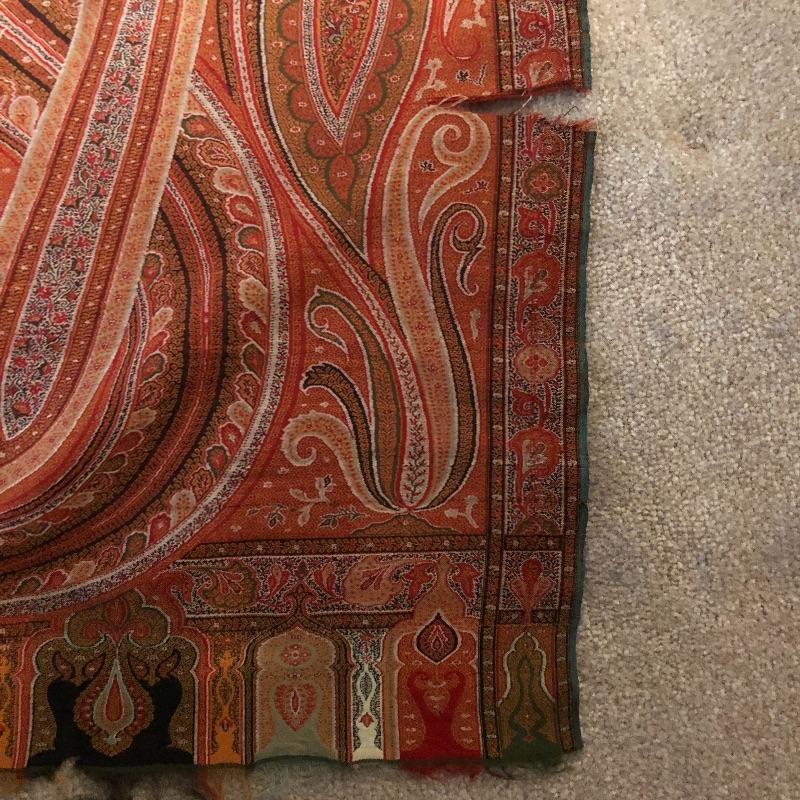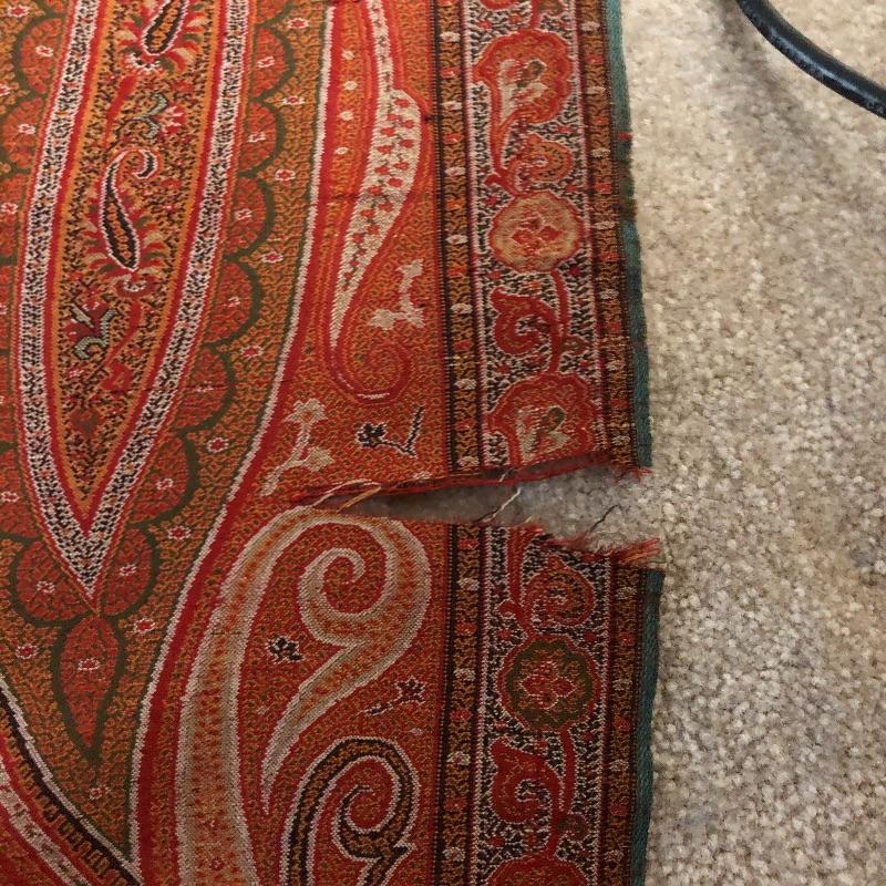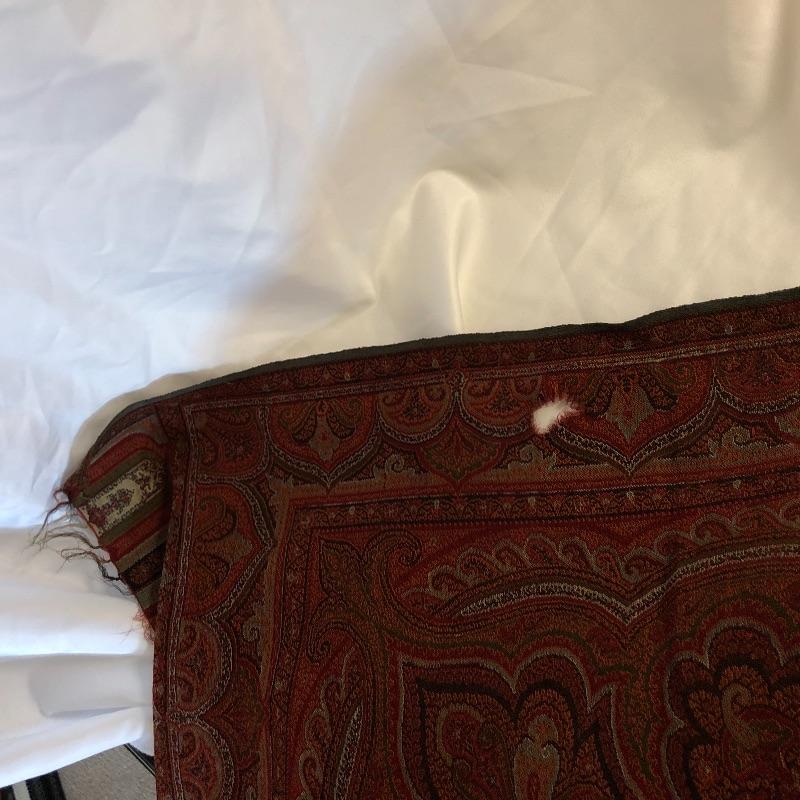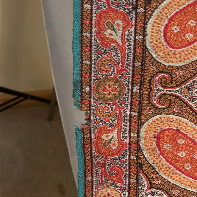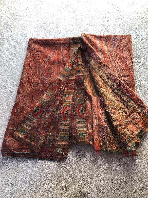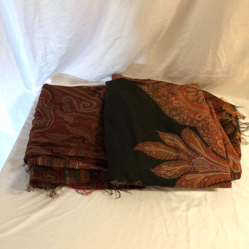 These two pieces of wool and silk fabric remind you of a work of art with there intricate designs and stitching. Both pieces have damage, see pictures. Owner claims they are circa 1860. Largest piece measures 63” x 122”.