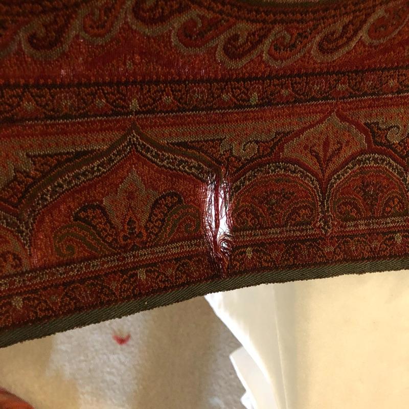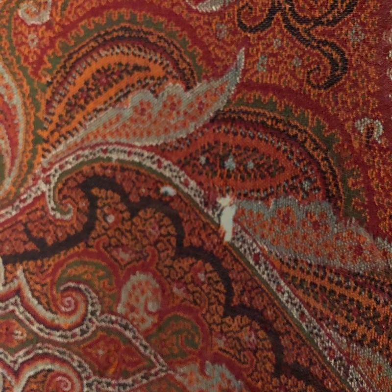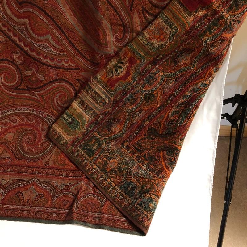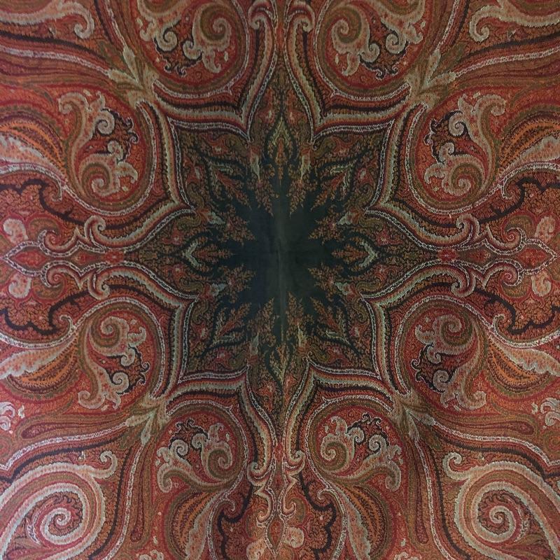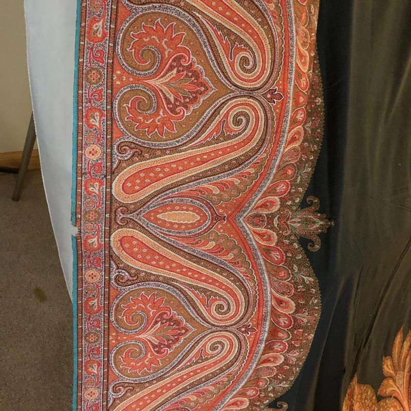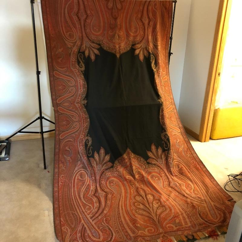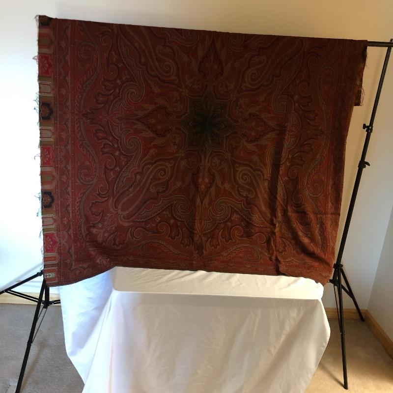 These two pieces of wool and silk fabric remind you of a work of art with there intricate designs and stitching. Both pieces have damage, see pictures. Owner claims they are circa 1860. Largest piece measures 63” x 122”.
