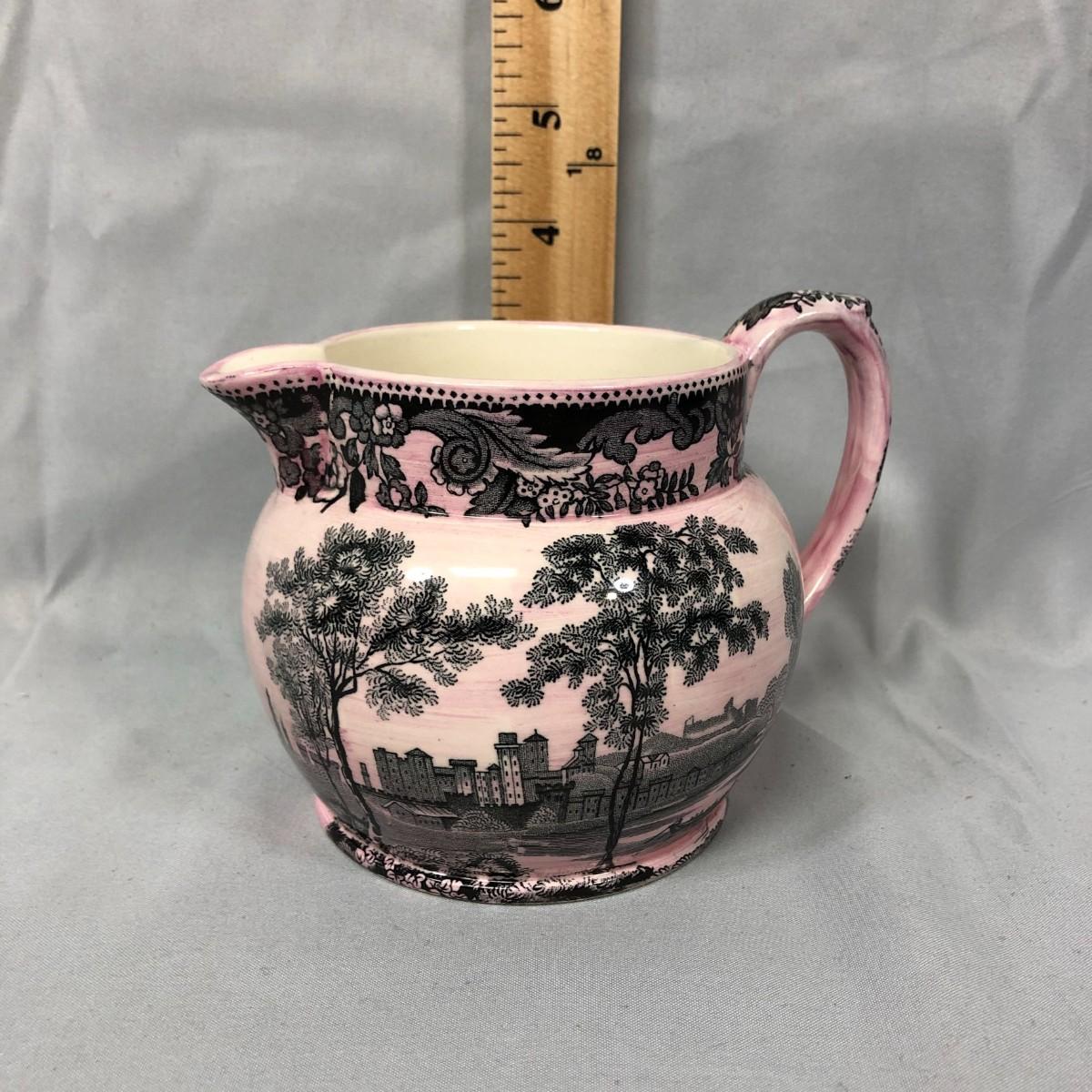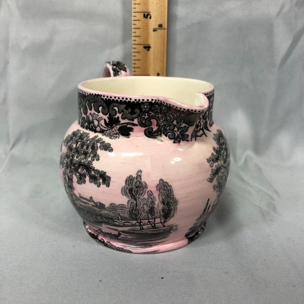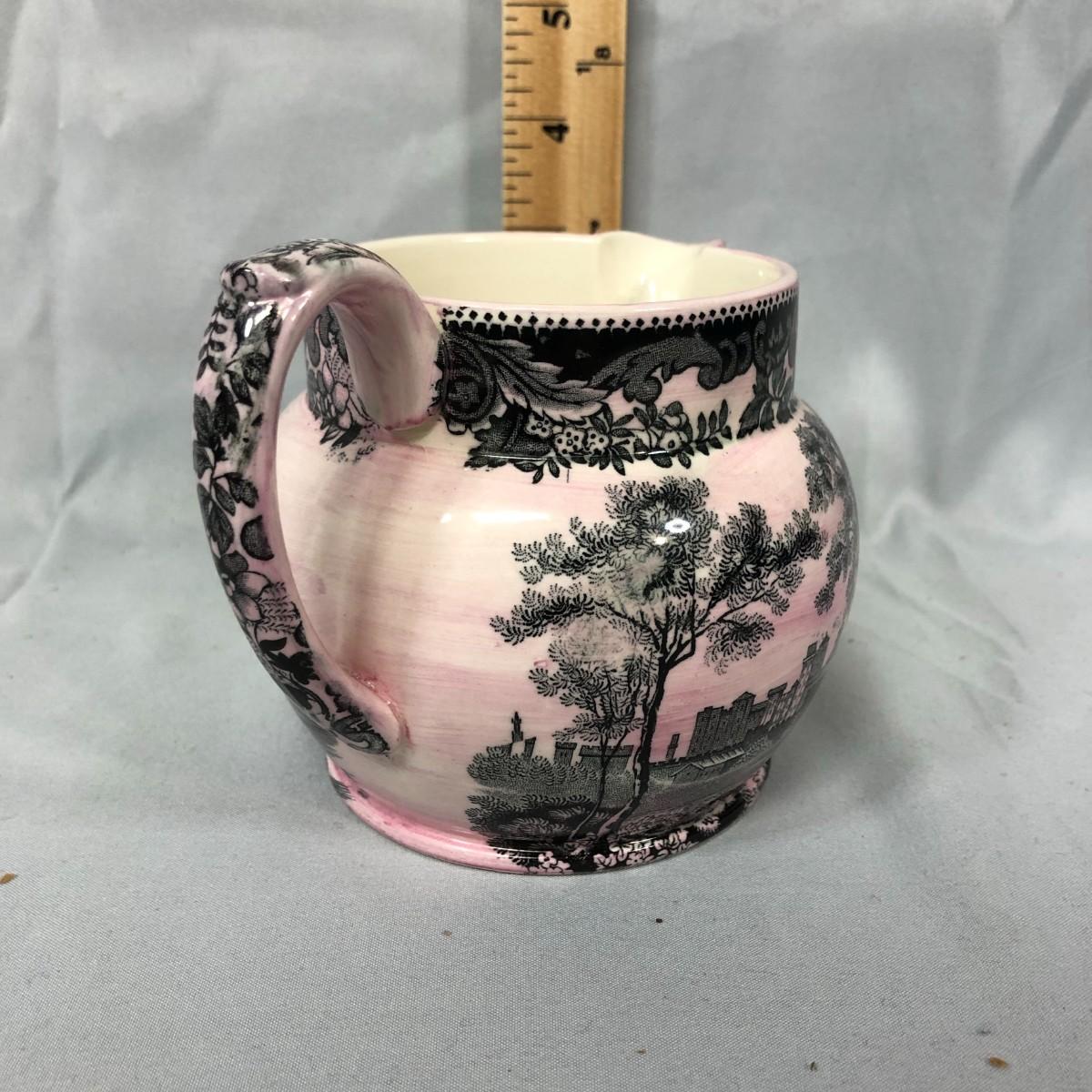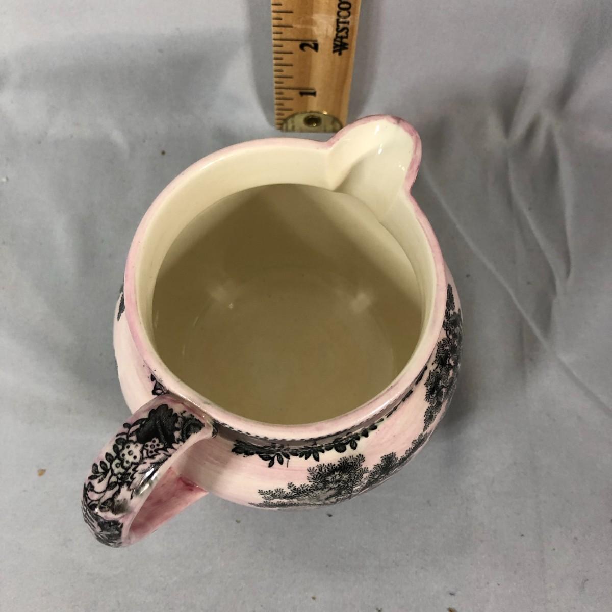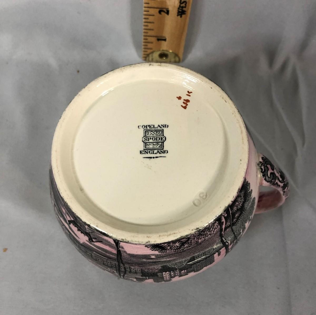 This one has me stumped because I can not find another one like it or any information on this one. It is about 3.5" tall and in excellent condition. It has a pink background with black silohuette picture on that. I don't see any chips, cracks, or crazing.