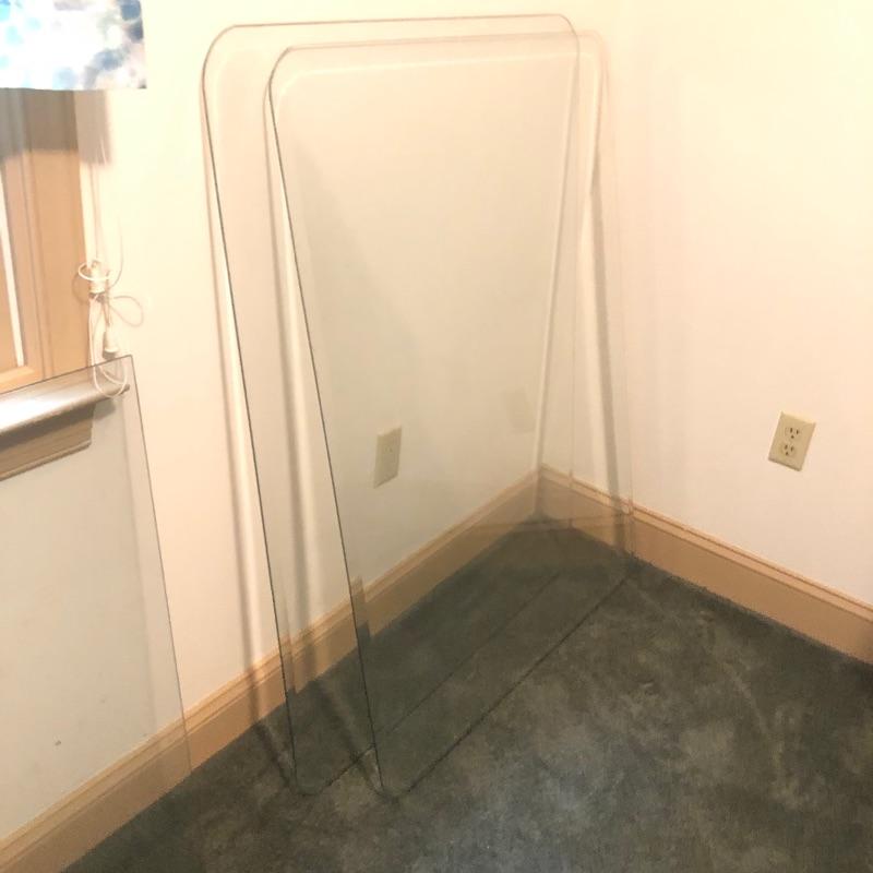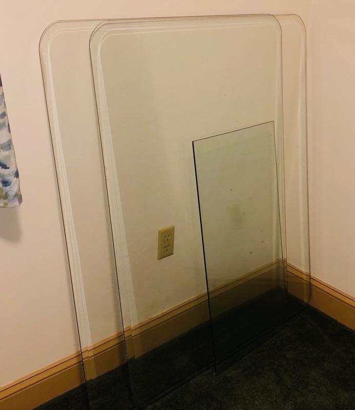 There are two large and one smaller pieces of glass in this lot. Glass is very hard to photograph, but the two larger pieces are tempered, beveled glass. The smaller rectangular piece is not beveled but is a nice size for possibly protecting something small and precious. Larger pieces are chair mats and do have some scratches on them. Last image attempts to show some of these marks.