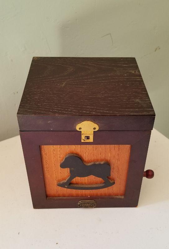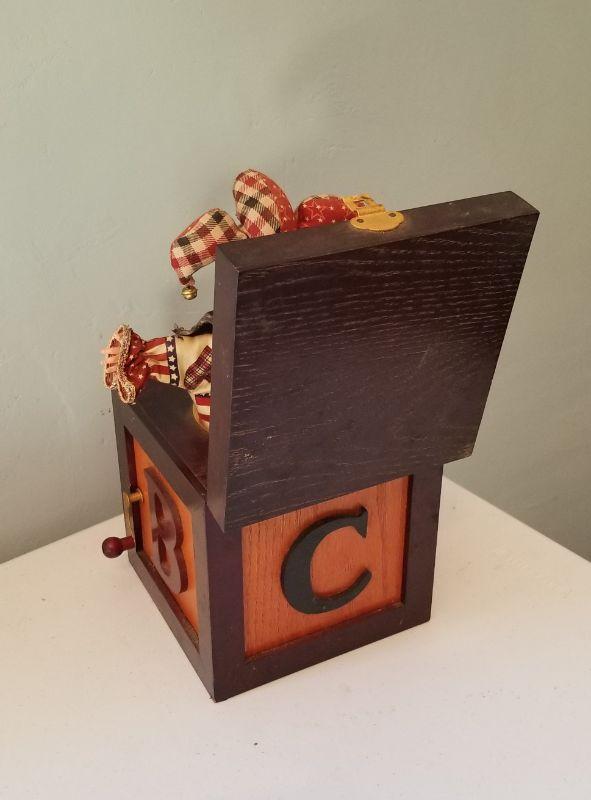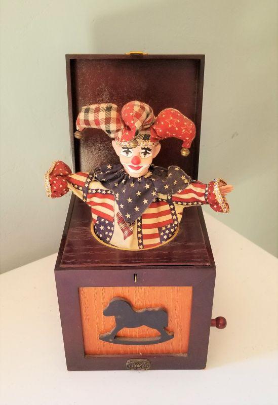 Patriotic style Jack in the Box - Brand is Thomas (Pacconi) Museum Series. Works fine - turn the crank to "Pop goes the Weasel" and he pops right out. Closes fine. Good used condition. 15" tall when open, 8" when closed.