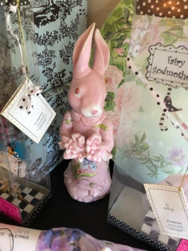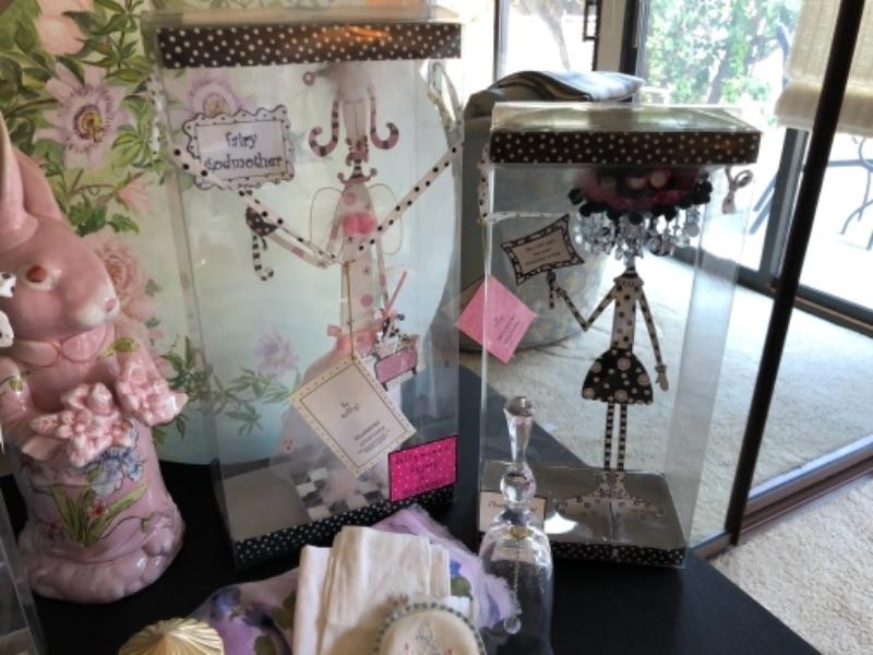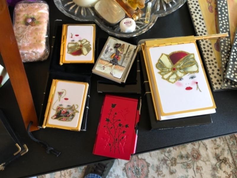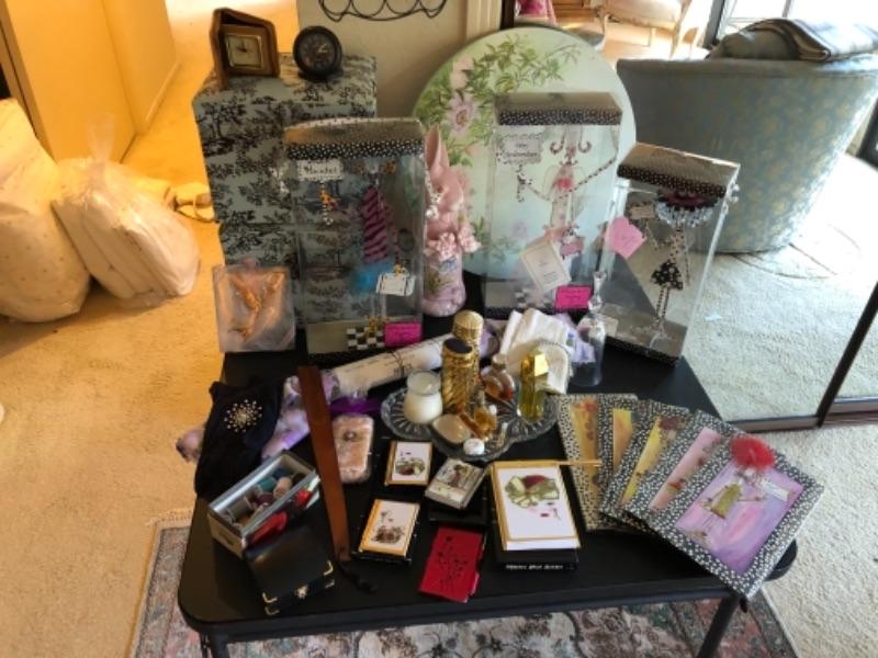 Lot 27. Three decorative metal figurines, five matching paper dolls, pictures, pink porcelain bunny, two alarm clocks, two quilted trinket boxes, gloves, notepads/pens, round painting, perfumes, angel ornaments, material, crystal bell, hankies, shoehorn, sewing items, small eyeglass holder, necklace, owl scarf hanger, etc.--WAS $95““NOW $71.25