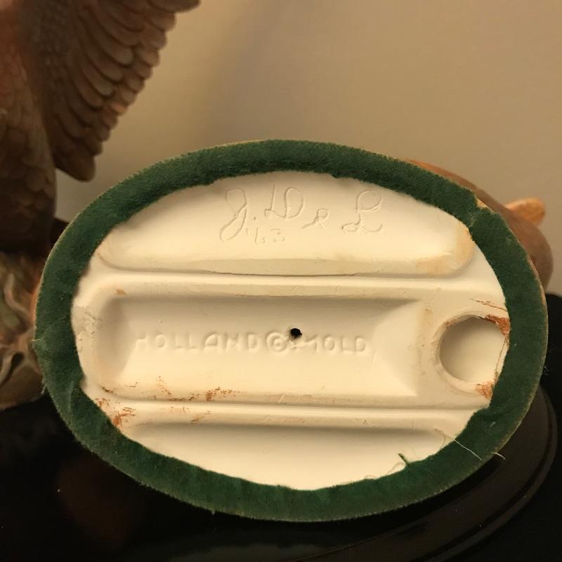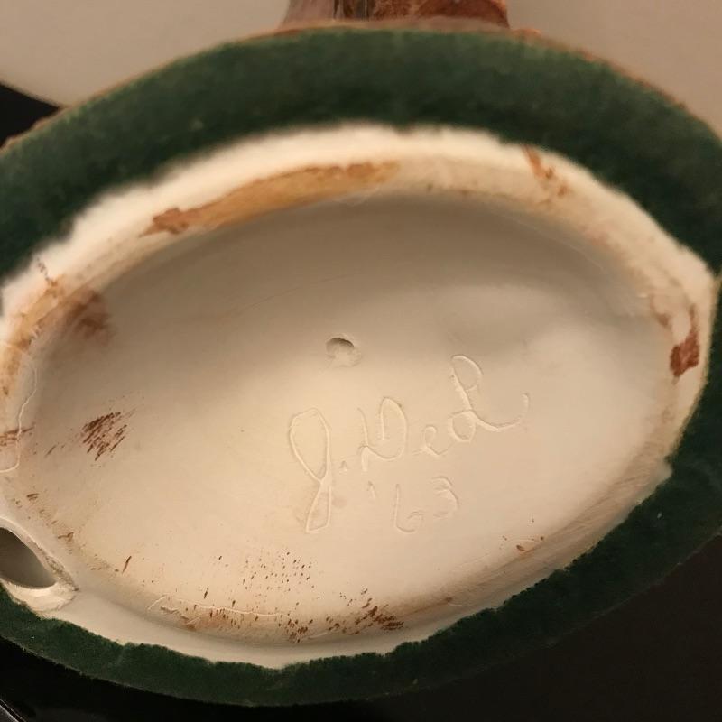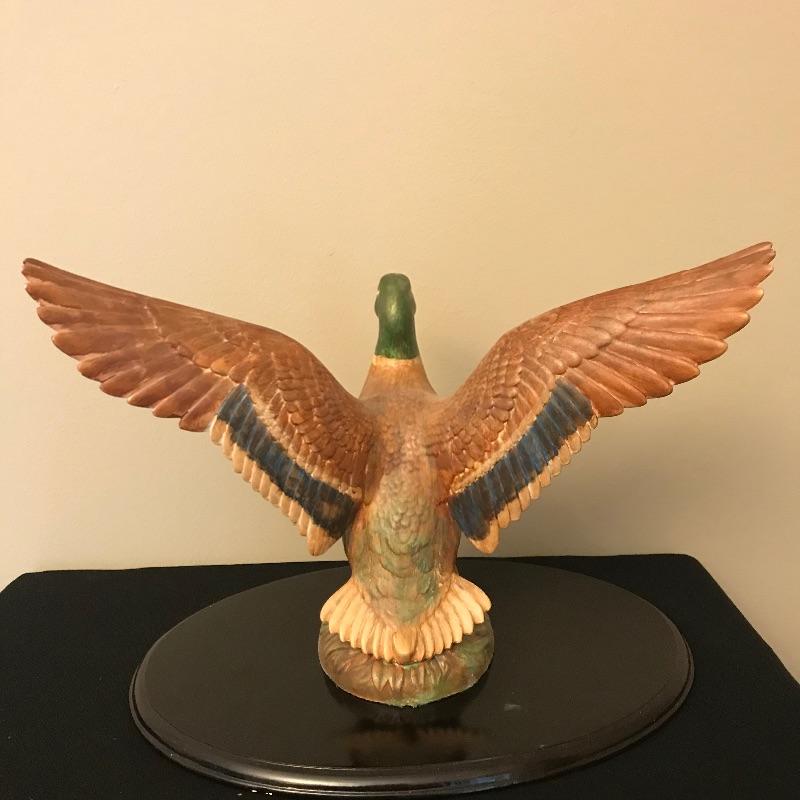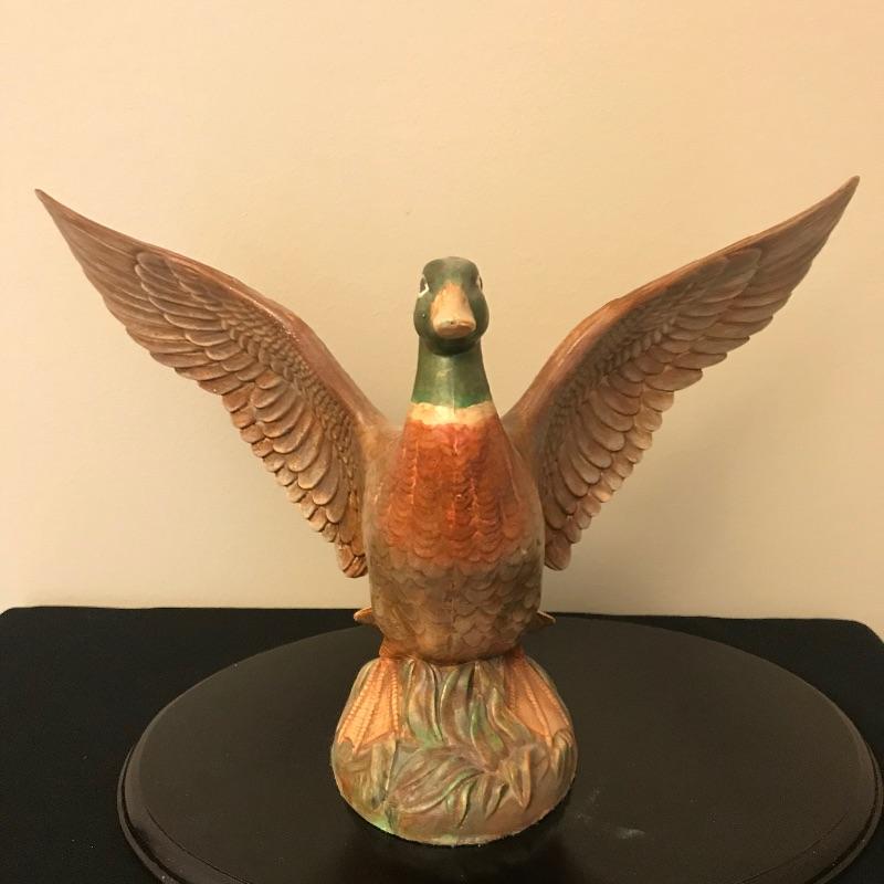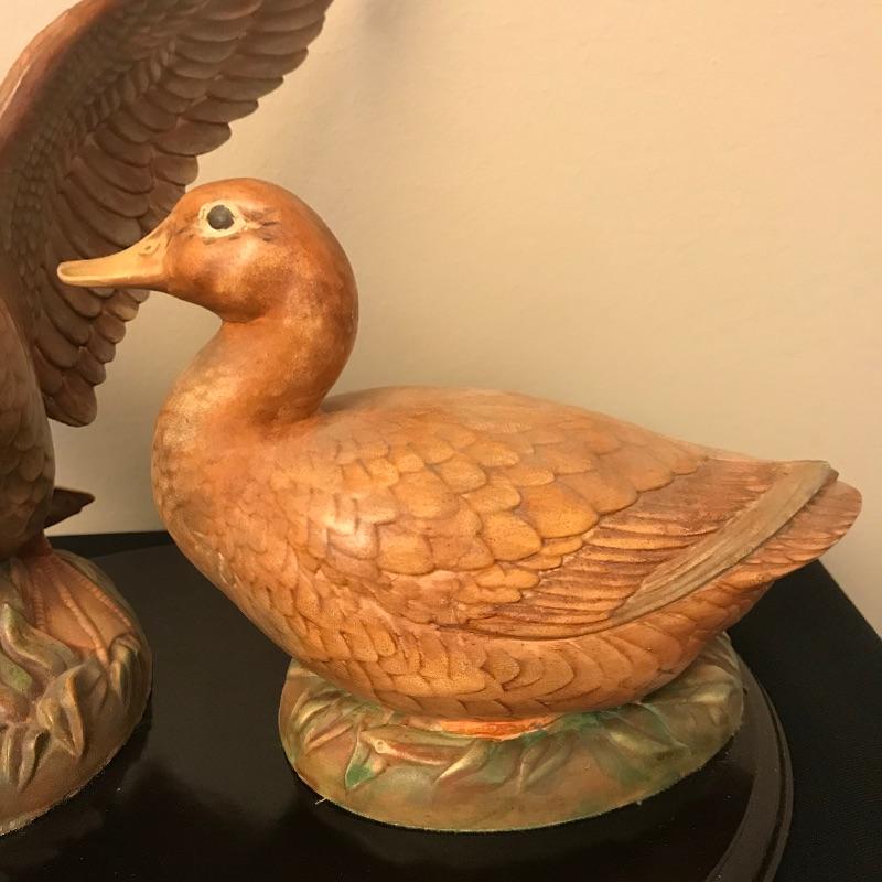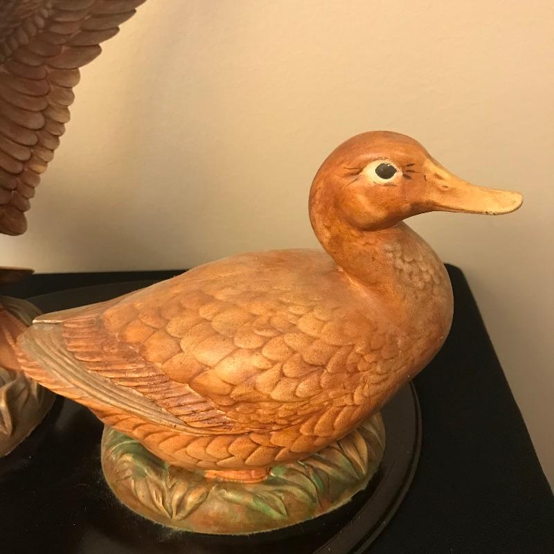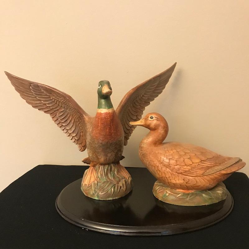 Two lovely painted ducks signed and dated “˜63. These two feathered friends come with a dark brown wooden stand. Larger duck measures approximately 12” x 5” x 7”. The stand is approximately 11” x 8.25. Shipping available.