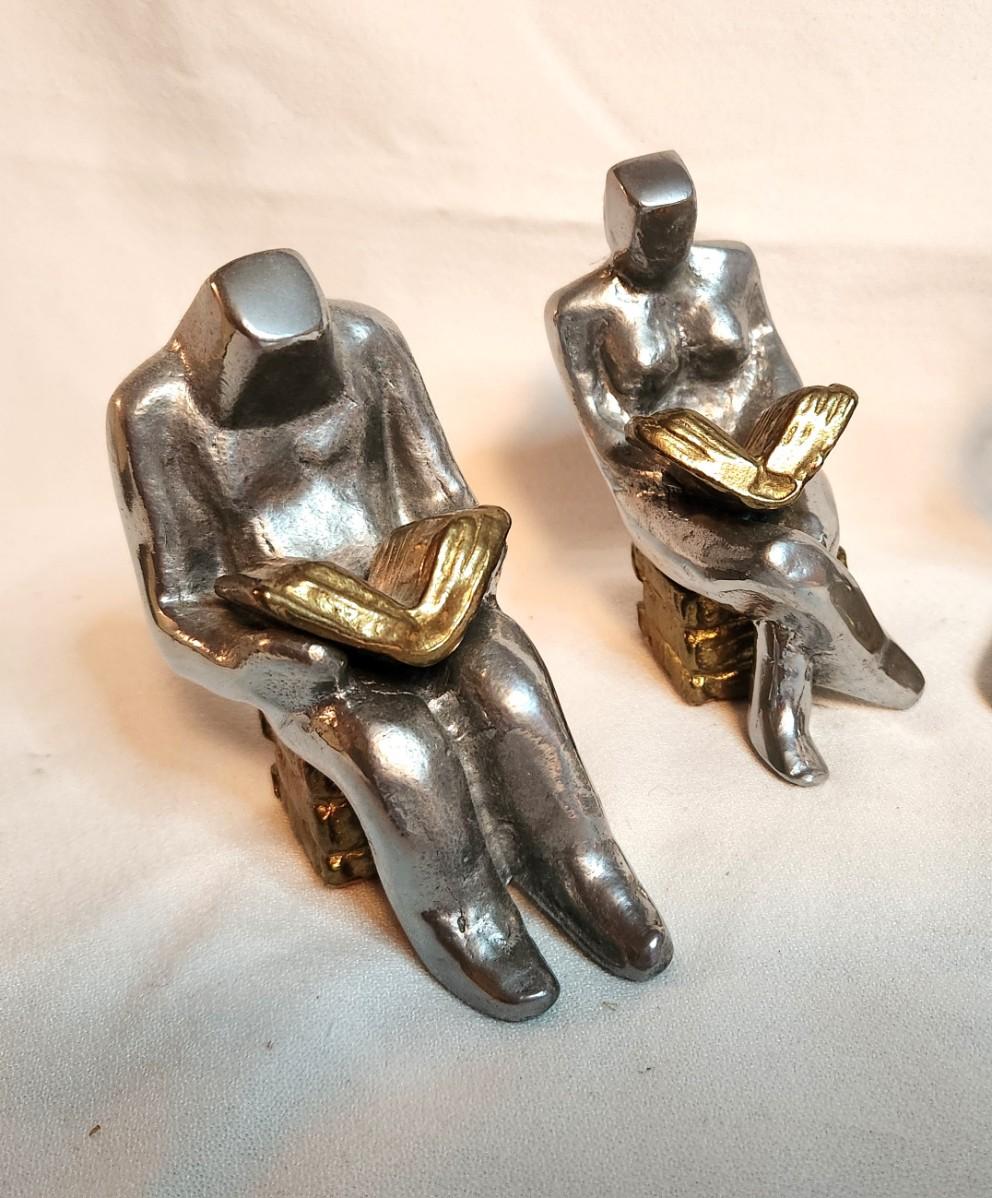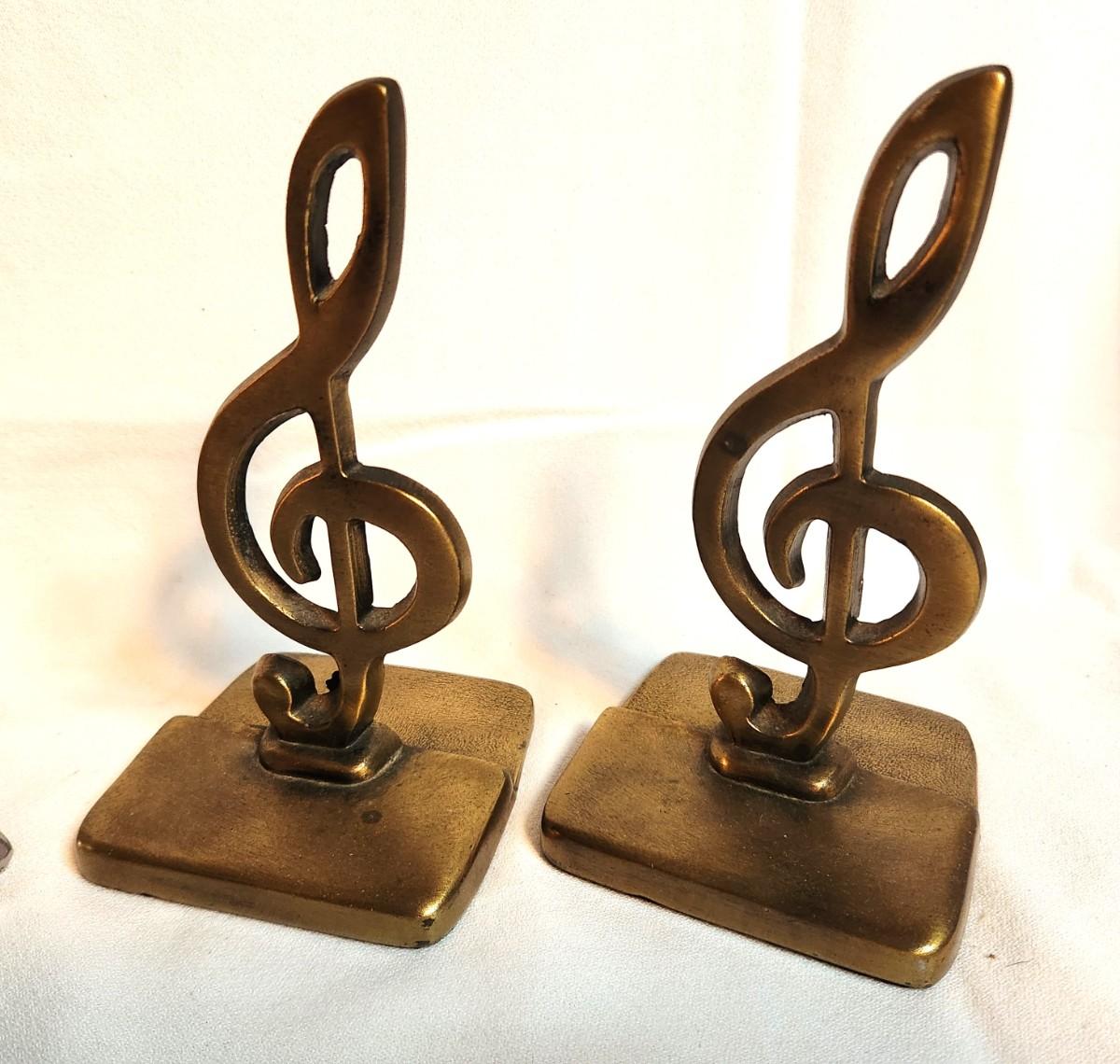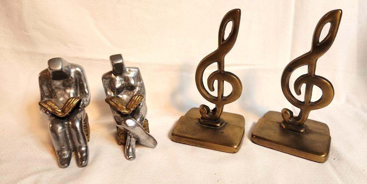 Lot of 2 pairs of vintage bookends - the Brutalist seated figures are from Scottish artist David Marshall (1980's), known for his iconic aluminum and brass pieces- each about 4.5" tall - heavy. His works are sought after. Also, a set of metal treble clefs on base (7" tall).