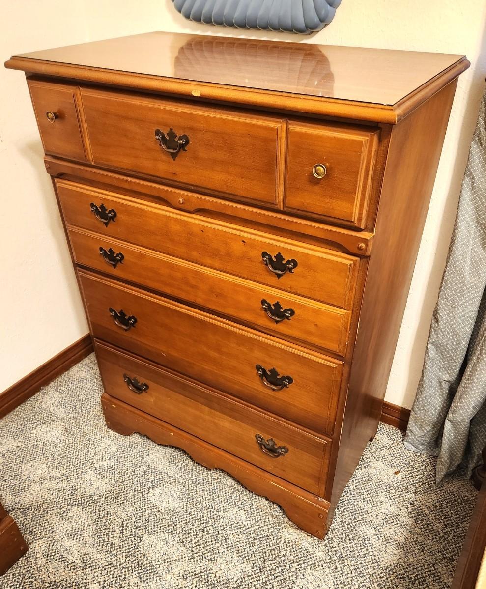 Vintage Mid-Century 4 drawer chest of drawers - no maker noted - maple finish. Some dings, as shown. Pretty good condition.