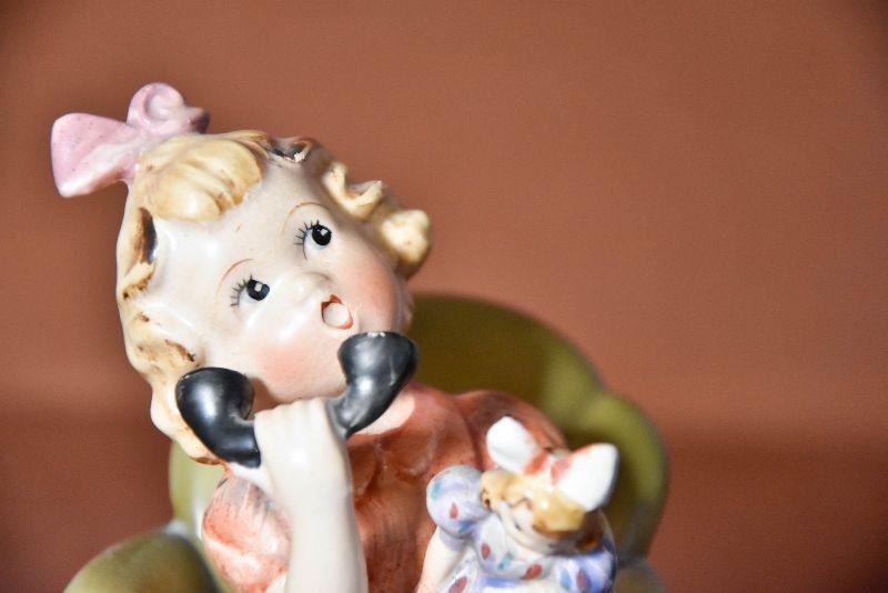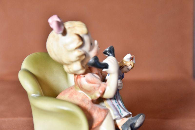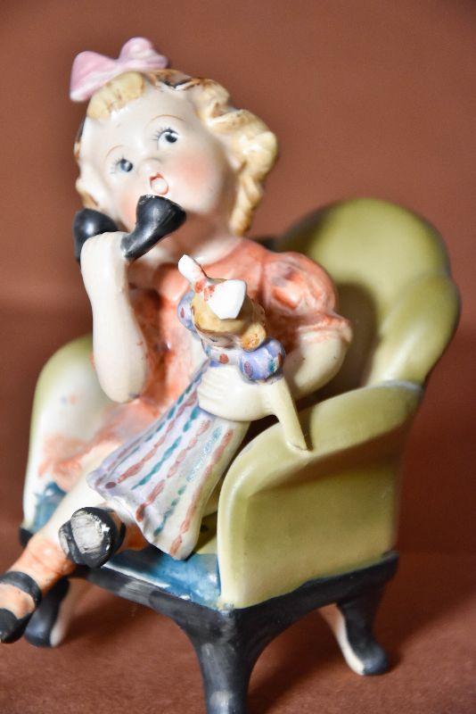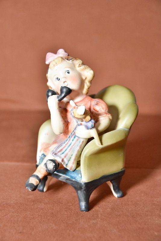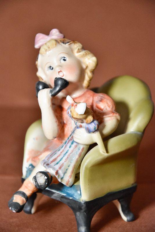 Adorable 5" high figurine of a little girl holding a doll on a chair talking on the phone. Looks hand painted.