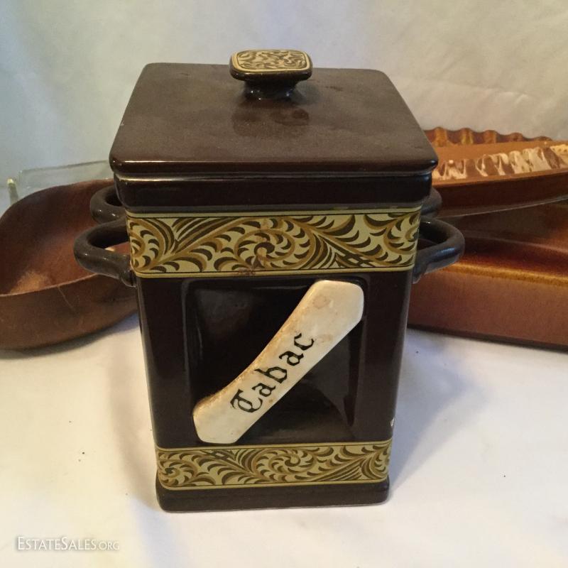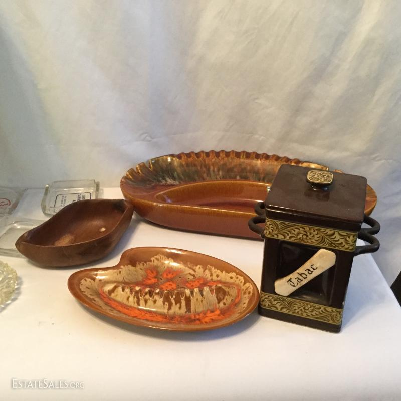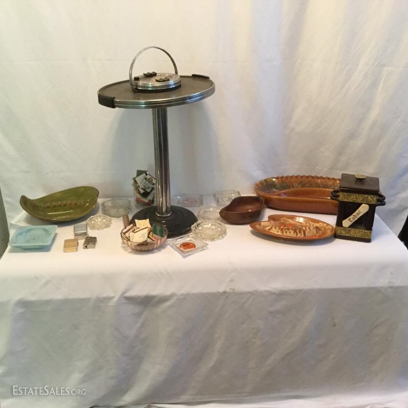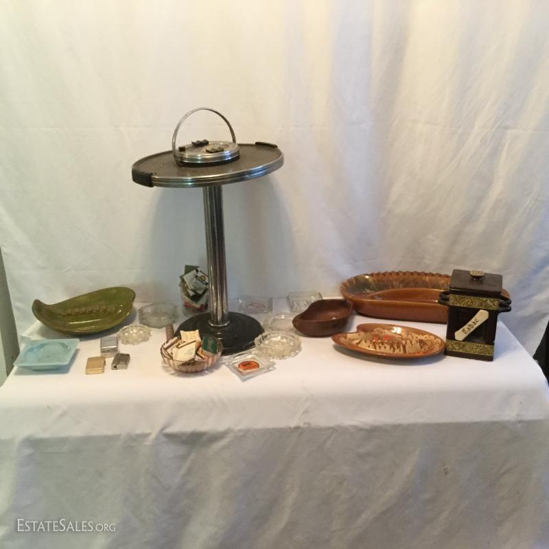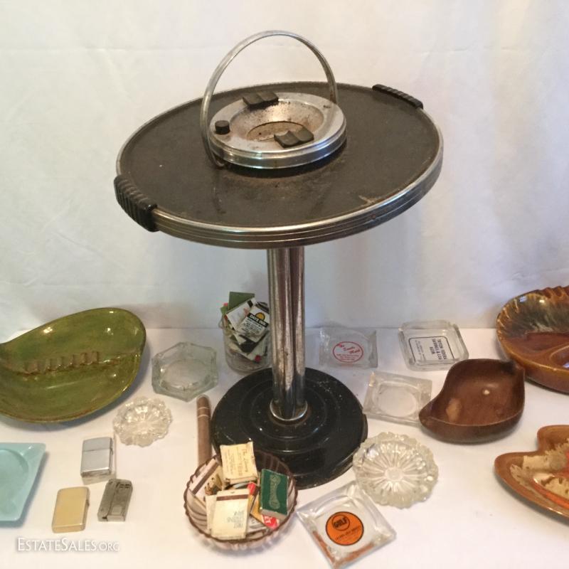 Misc smoking items: Art Deco style standing black & chrome ashtray. Ceramic Tobacco Container. Also includes many small, collectible ashtrays, zippo lighters, matches etc. See photos.