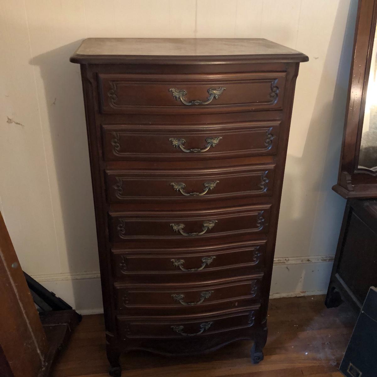 This seven dovetailed drawer vintage chest of drawers has casters on the front and shows excellent craftsmanship. Chest has some scratches and nicks, see pictures. Chest measures 18” x 28” x 51”.