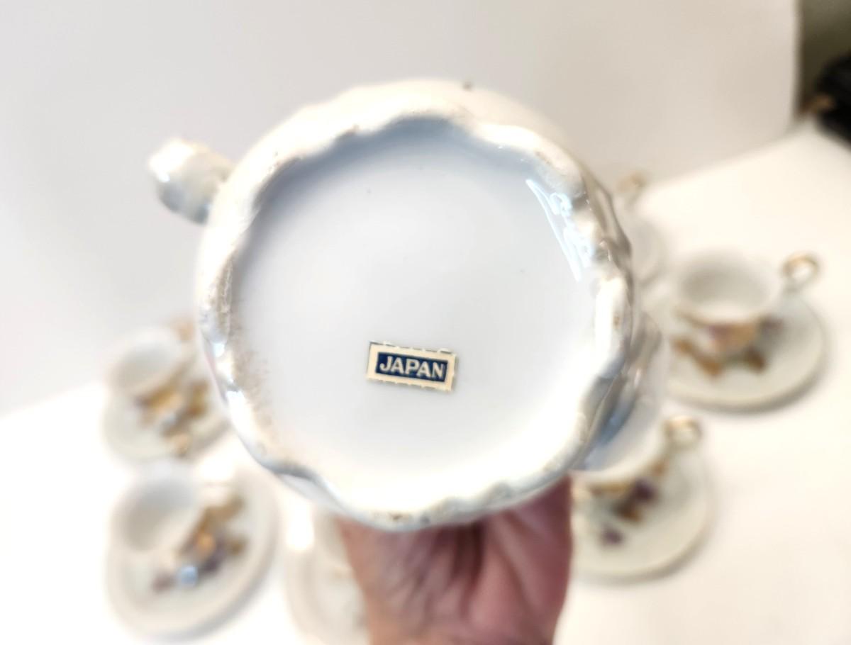 Vintage "Japan" (still has stickers) tea set - teapot, creamer/sugar, six cups/saucers. All in good condition. Teapot 8" tall. Lovely painted floral motif.