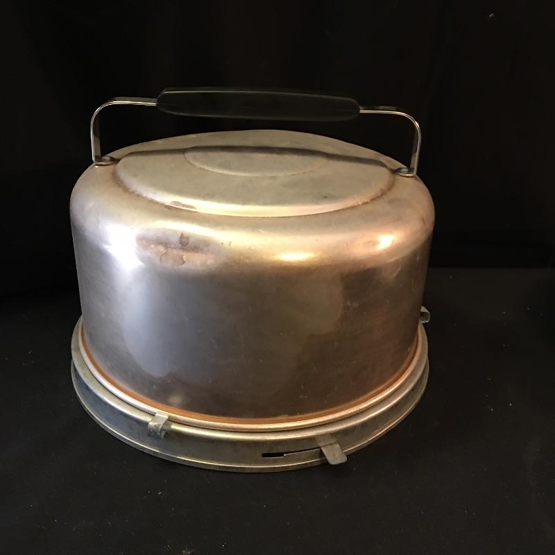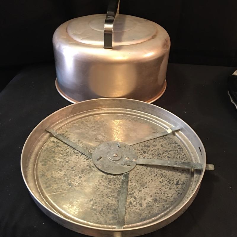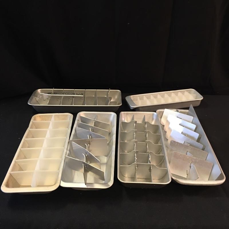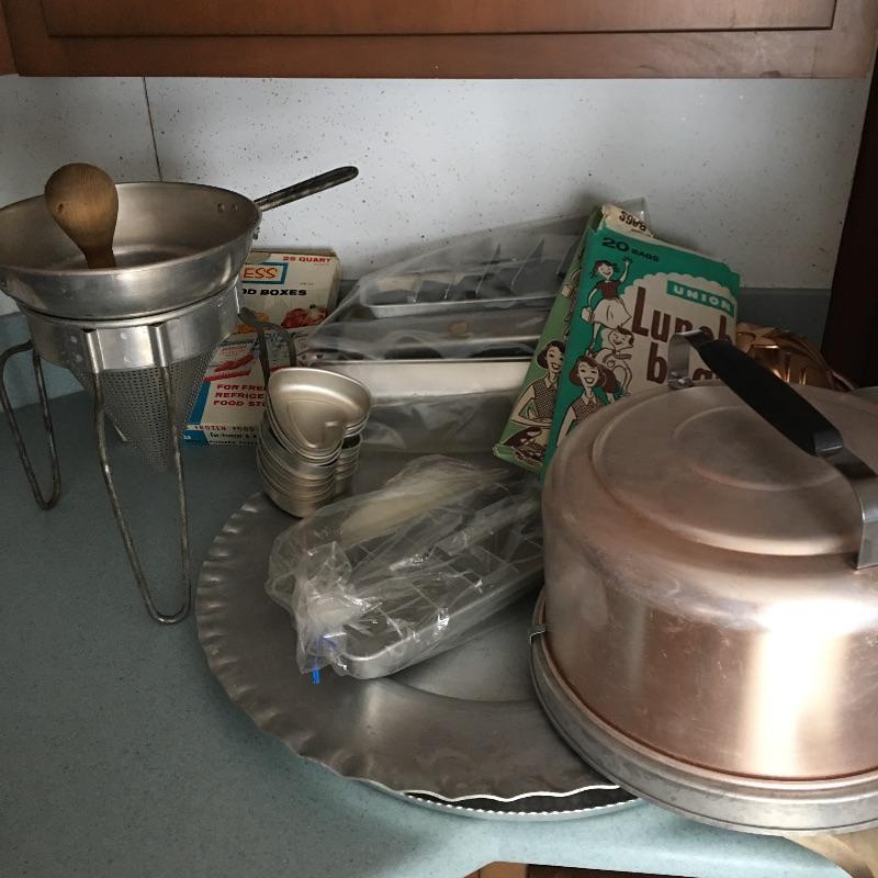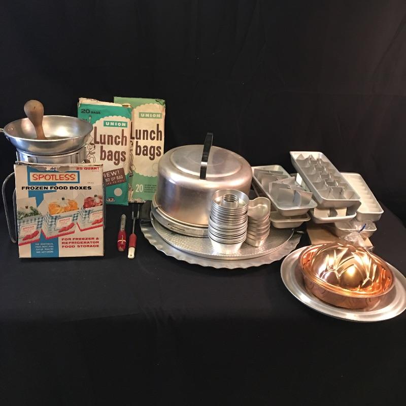 Great collection of vintage kitchen items with lots of fun aluminum pieces. Includes metal and plastic ice trays, strainer with wood pestle, cake carrier, wooden cutting board, two large aluminum serving trays, mini cake pans, two jello molds and some vintage lunch bags and freezer boxes that probably work as well now as when they were made. . Largest tray measures 18”D. Relive your memories from your youth with this step back in time lot.