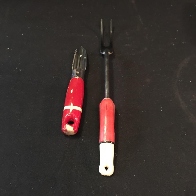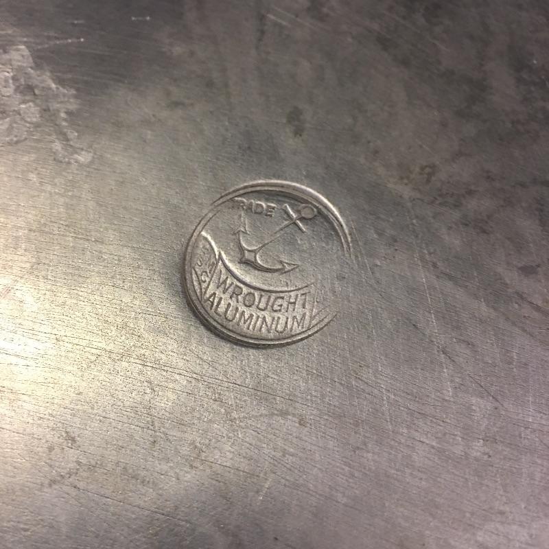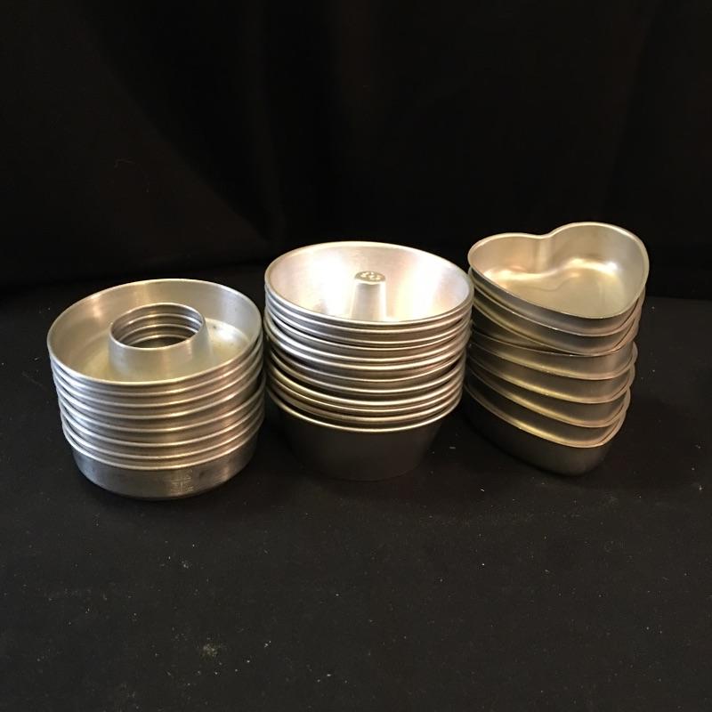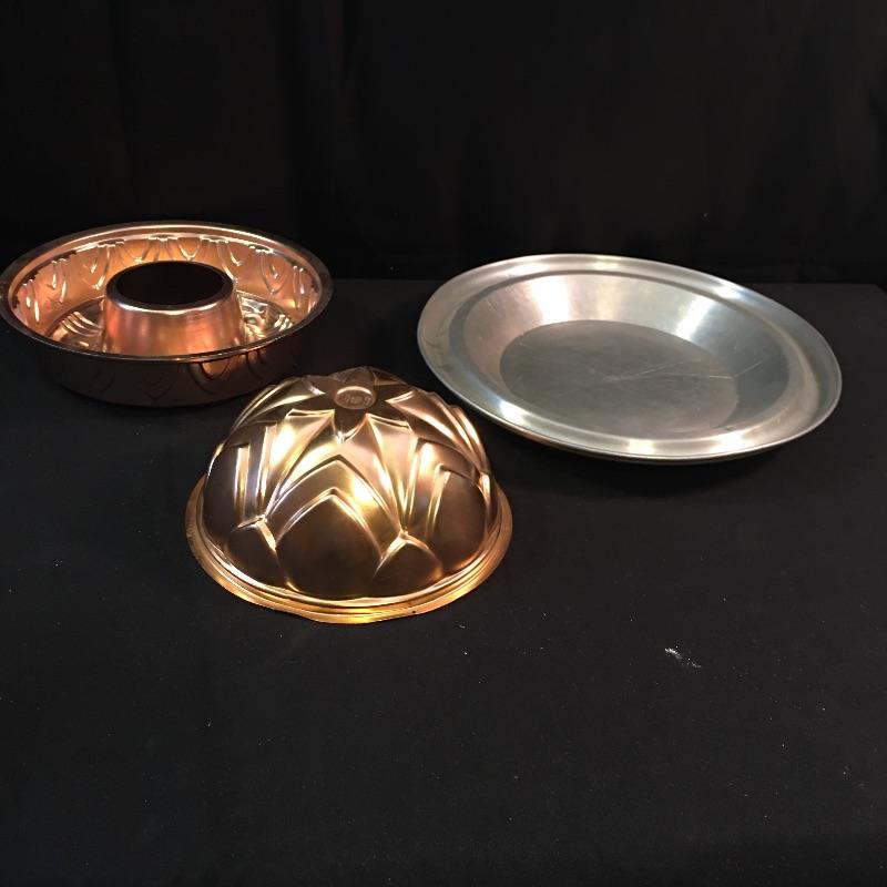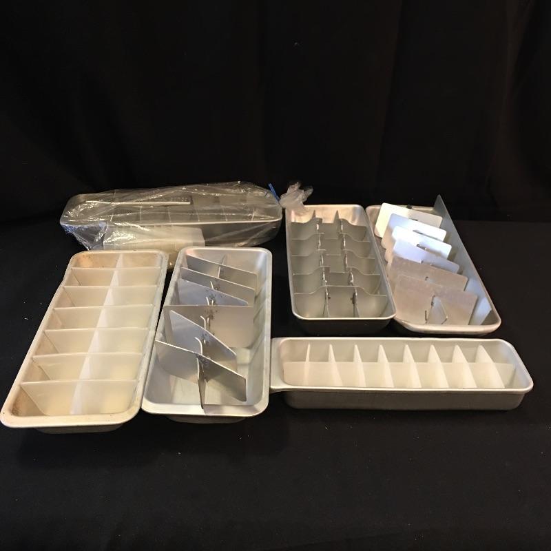 Great collection of vintage kitchen items with lots of fun aluminum pieces. Includes metal and plastic ice trays, strainer with wood pestle, cake carrier, wooden cutting board, two large aluminum serving trays, mini cake pans, two jello molds and some vintage lunch bags and freezer boxes that probably work as well now as when they were made. . Largest tray measures 18”D. Relive your memories from your youth with this step back in time lot.
