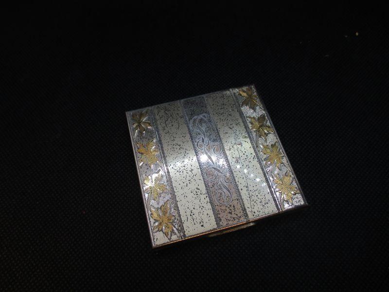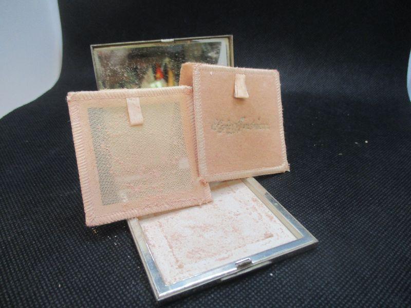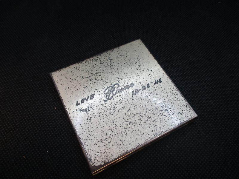 This metal compact has wear as shown on the front and back, but otherwise is in excellent condition. It is engraved "Love Bruce 12-25 '46" and has the screen insert and the applicator insert. There's even a bit of loose powder still in it! It is 2.75" square.