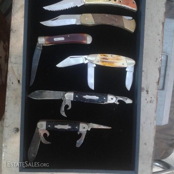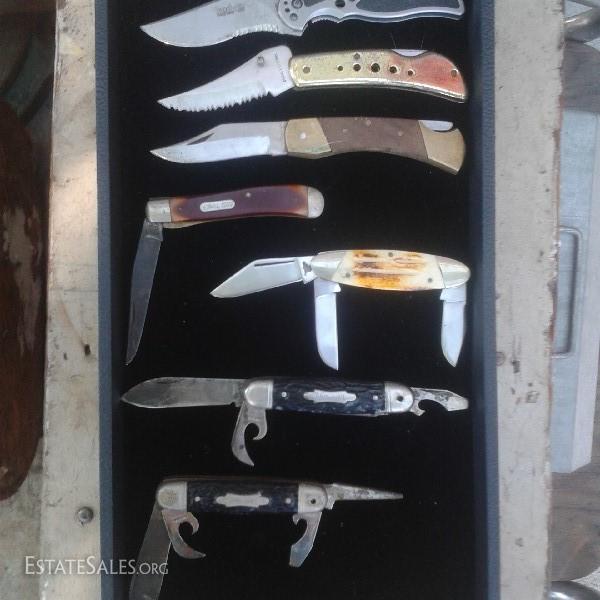 This lot houses 1 to 4 blade fold-back pocket knives 3" or larger (without blades extended) from manufacturers Schrader Walde, Kershaw, Frost and Kamp King. All knives show signs of normal wear and tear, with a few knives needing their blades cleaned. A great start-up set for the young collector. Reminder: only out-of-state auction winners have S&H/alternate payment options.