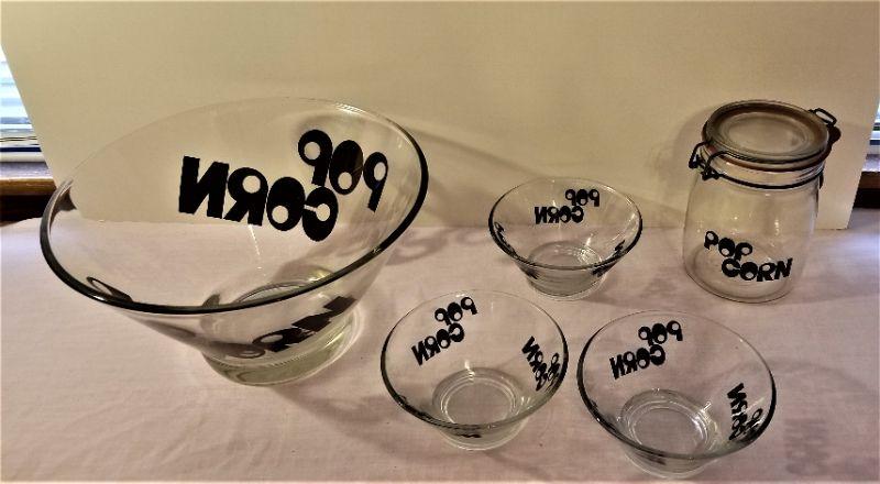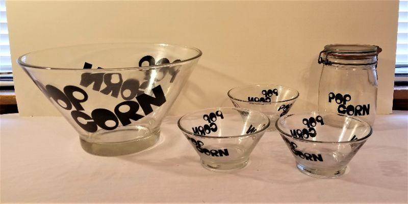 Vintage 1970's Glass Popcorn set - large serving bowl, 3 smaller bowls, and canister for the kernels (that's the hard piece to find in this set). Large bowl is 10.5" across and 6" tall, smaller bowls are 5" across and 2.5" tall, canister 6" tall. Good condition.