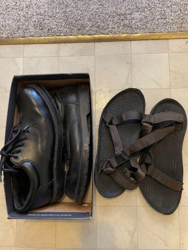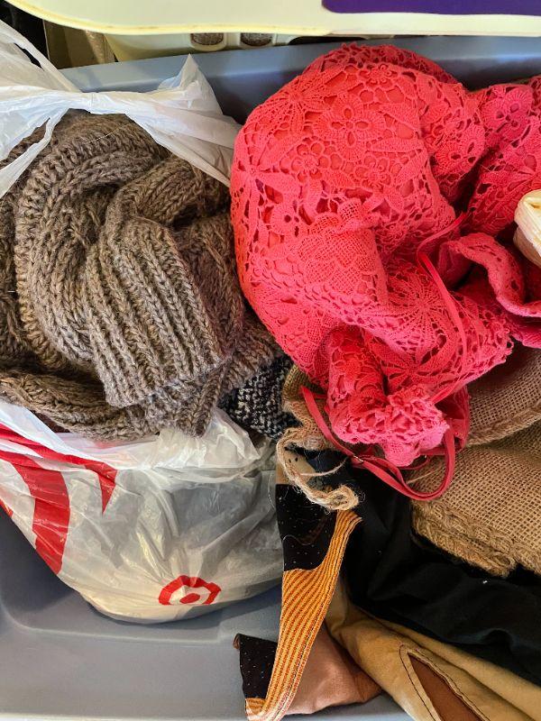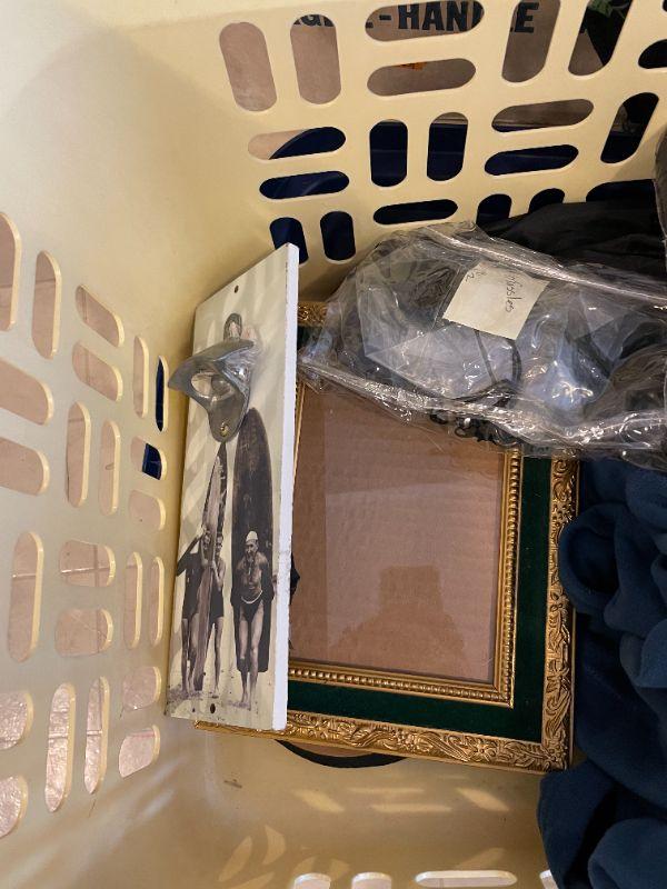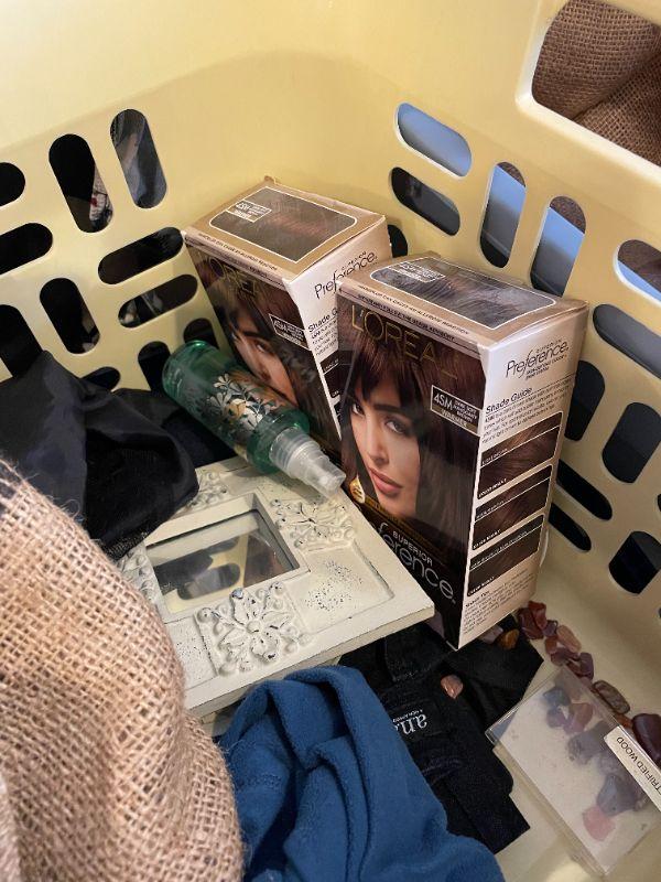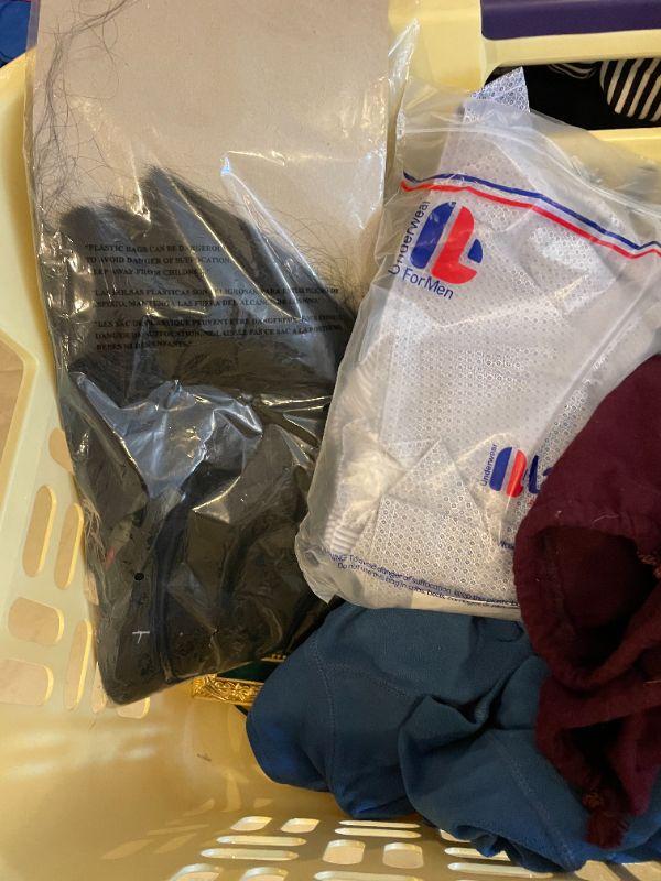 Wedding dress, shoes (men's size 12), women's clothes, cosmetics, hangers, laundry basket.