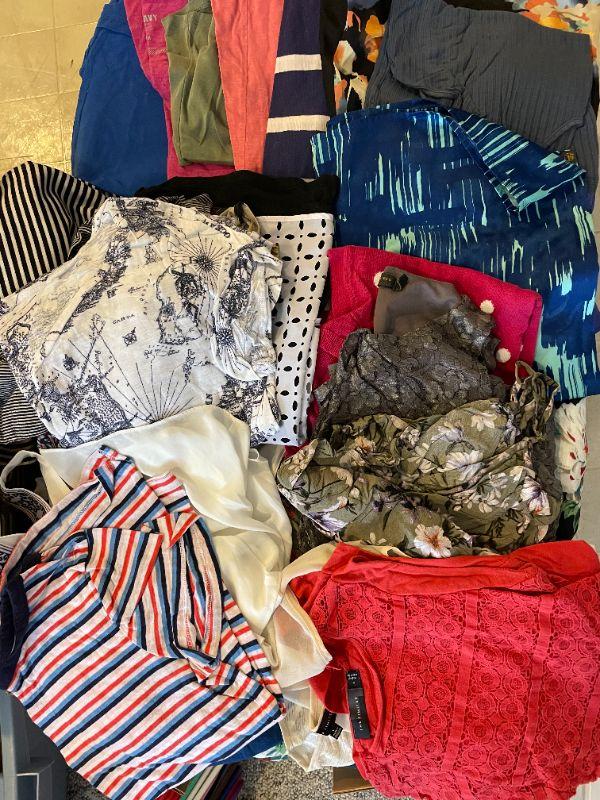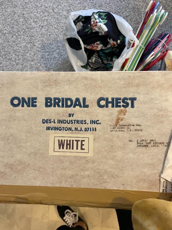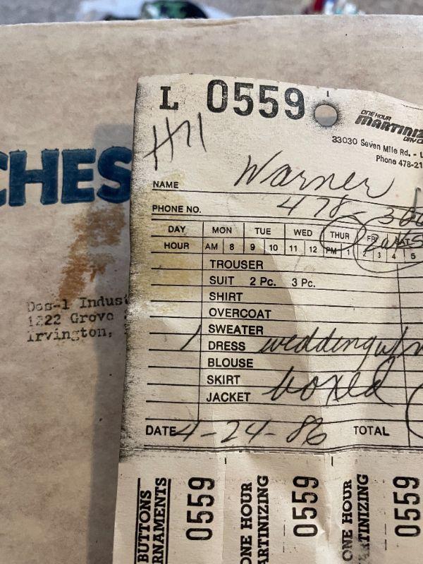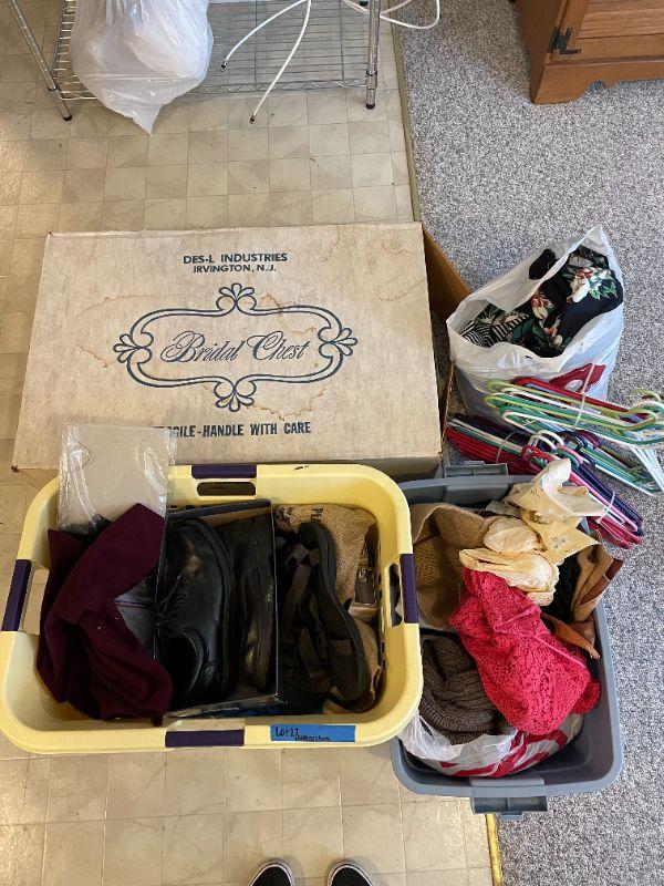 Lot 27 - Wedding dress, shoes (men's size 12), women's clothes, cosmetics, hangers, laundry basket