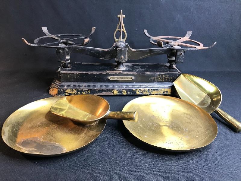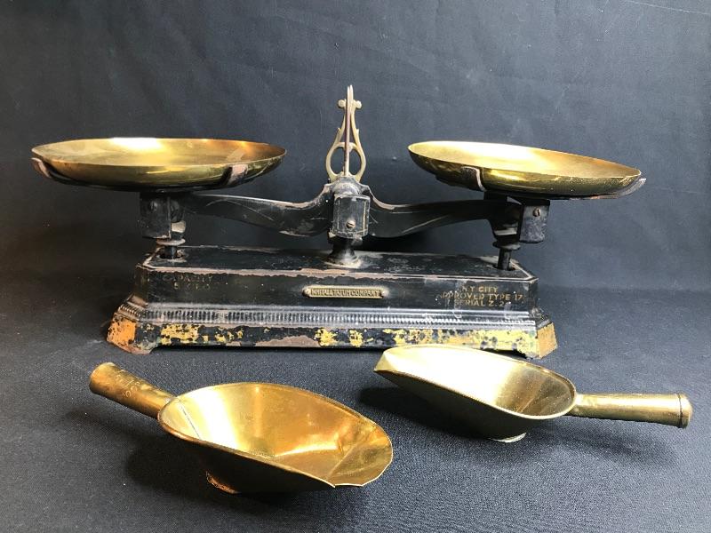 Antique triple beam scale . Includes two scoops. Please see all pictures for content of the lot, condition of the lot, and measurements if taken. Pictures are the best representation of the items listed and items are untested unless indicated in description. Thank you for looking and have fun bidding!