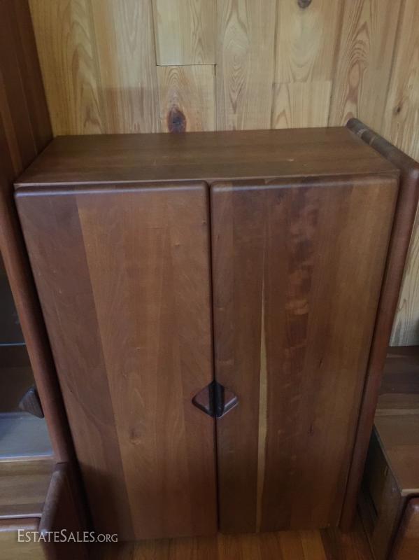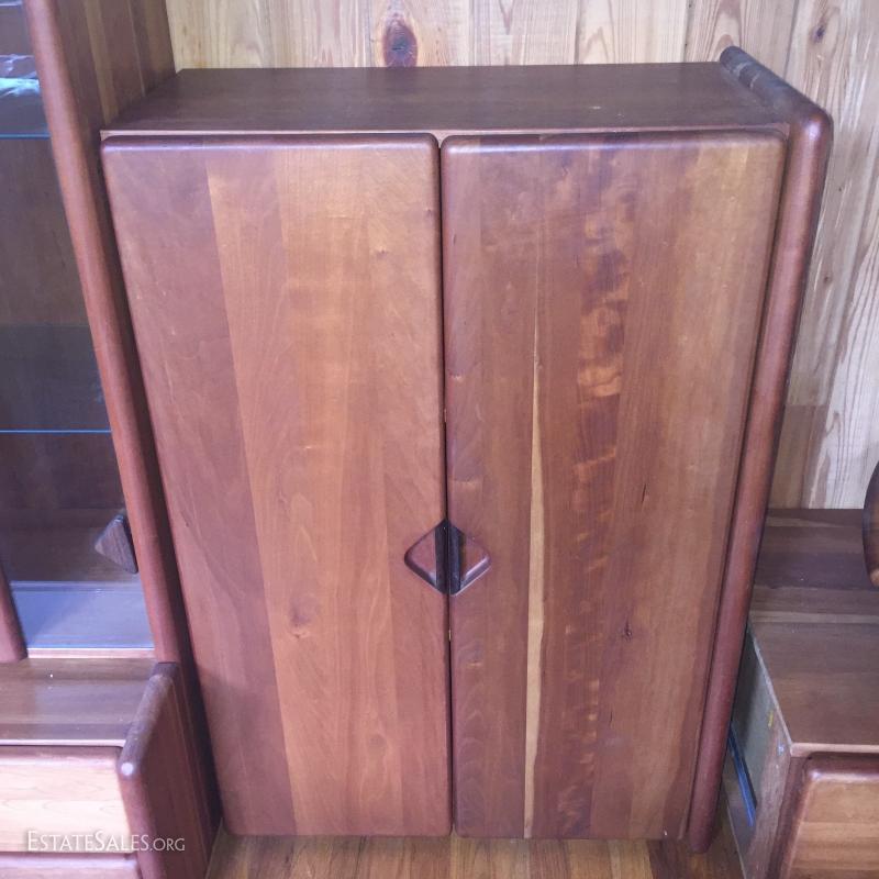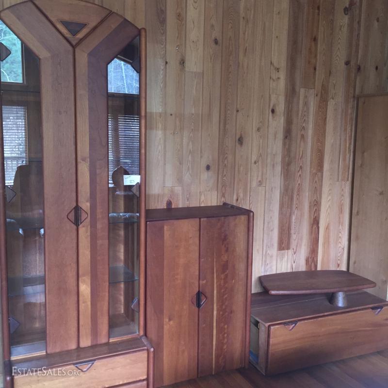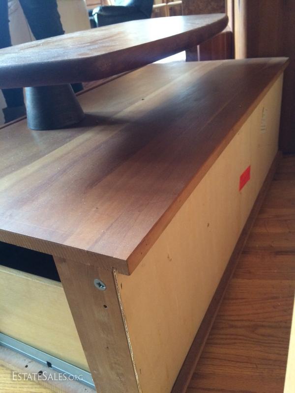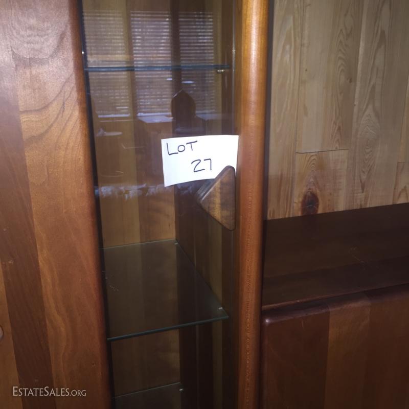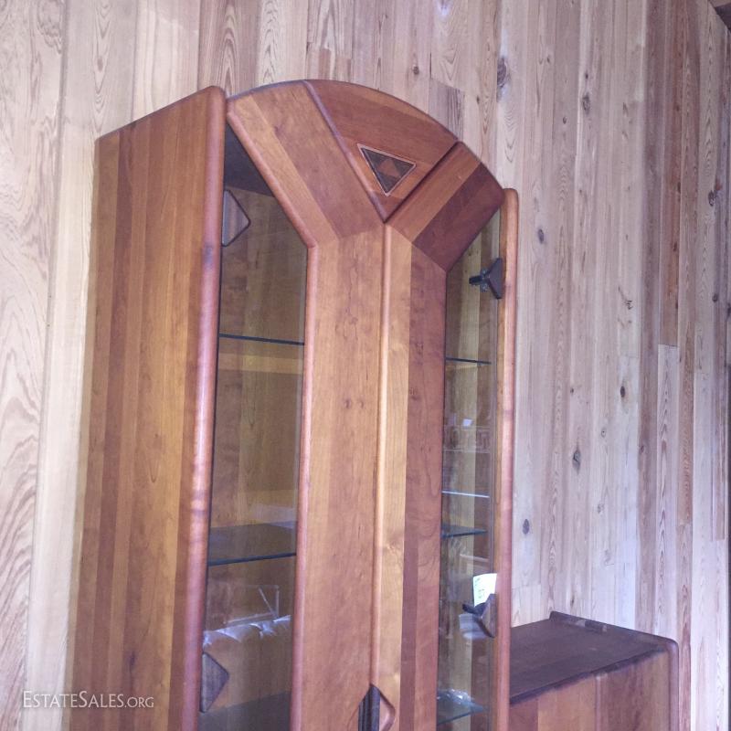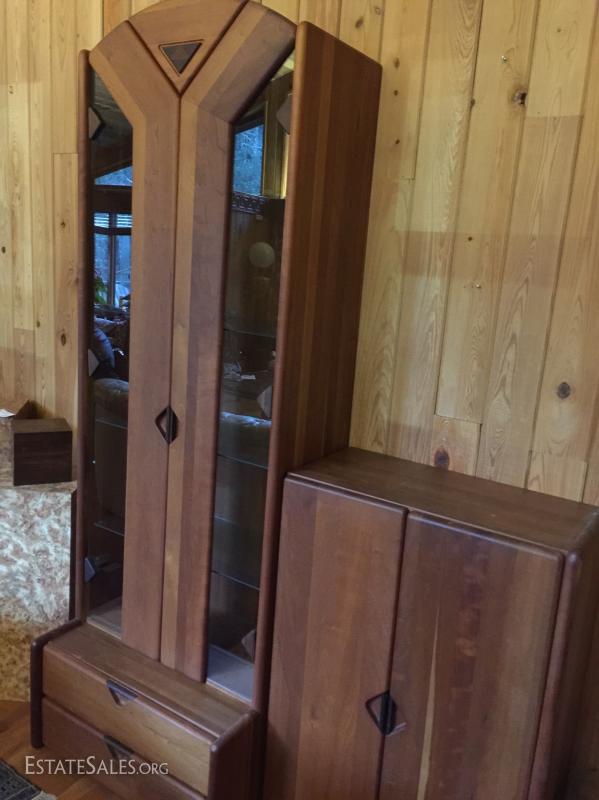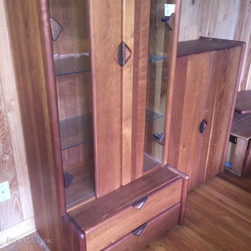 Three piece cabinet with glass doors, side cabinet and tv stand. Mix hardwoods. Cabinet has two glass doors and removable side cabinet with two doors. TV Stand top swivels back and forth. Drawer on TV stand is a little loose and may need reinforcement. Sides and back are open. Sold as is. See photos for details.