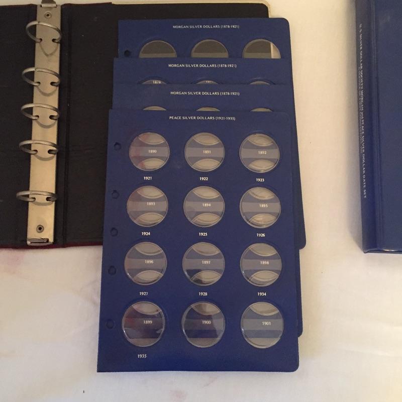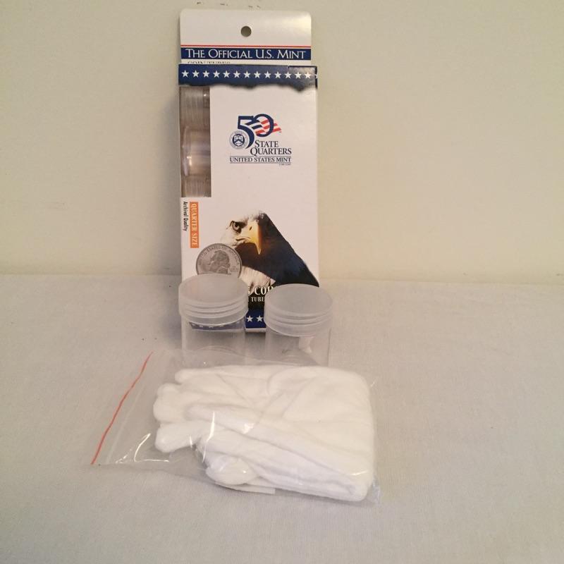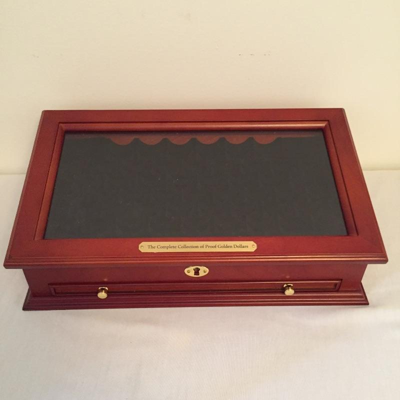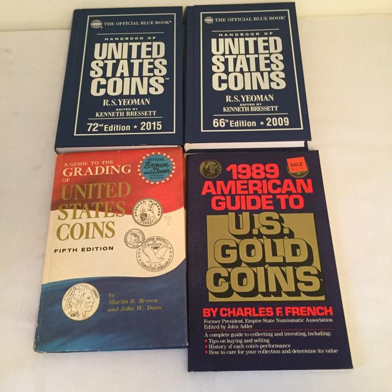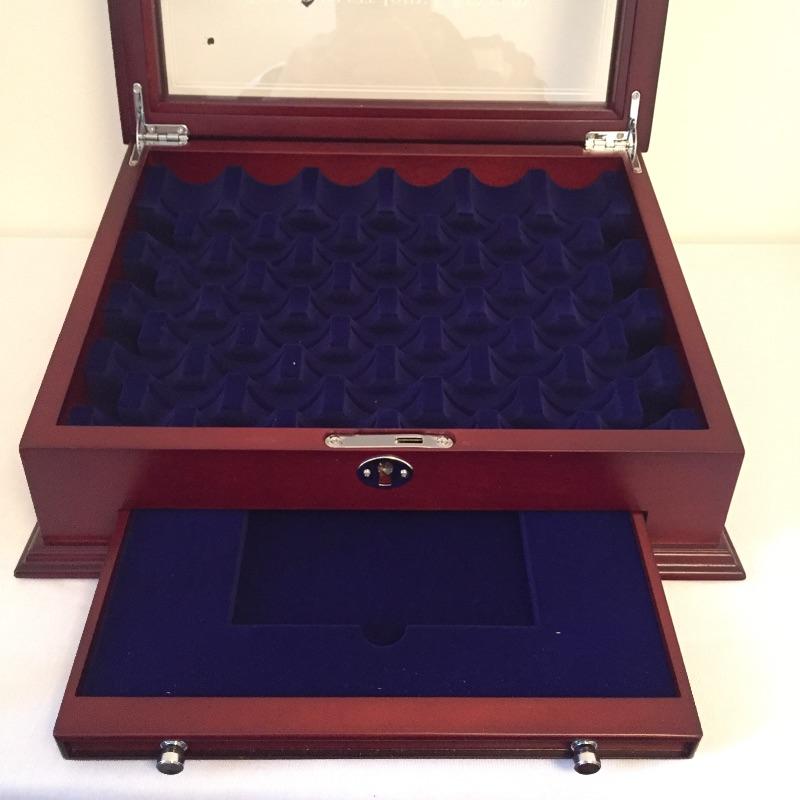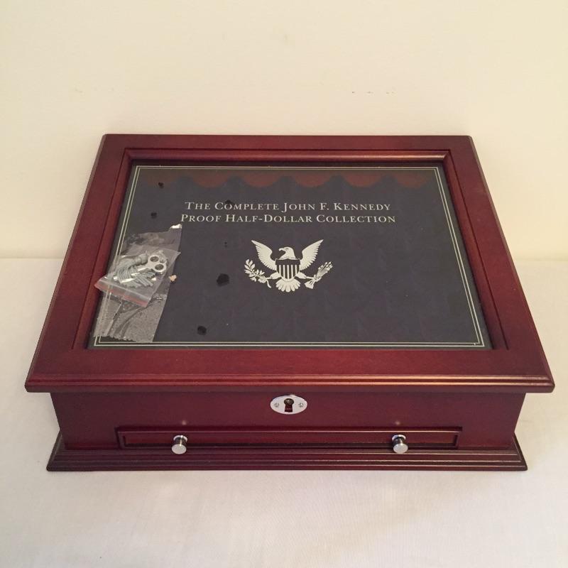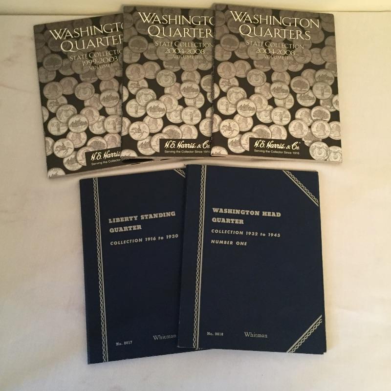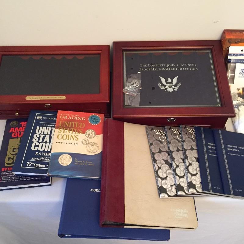 Two wooden and glass coin display boxes, books on coins, quarter collection books and more. Largest box measures 10.5” x 13.5” x 5.5”.