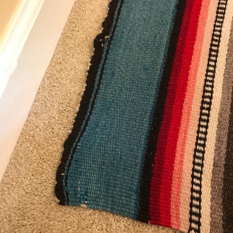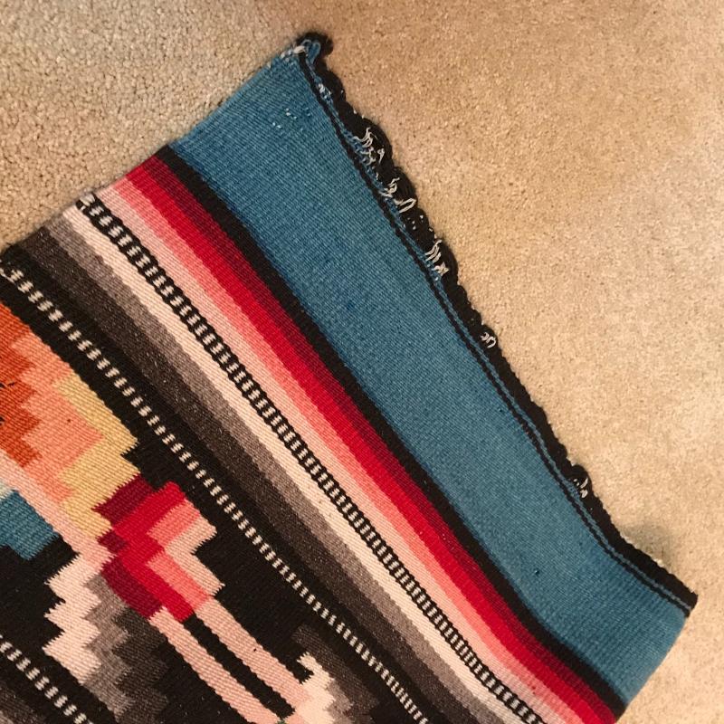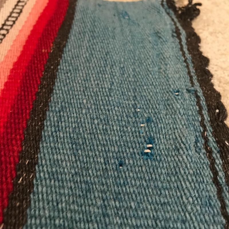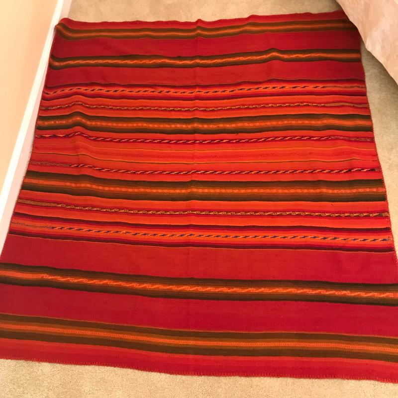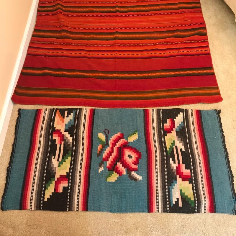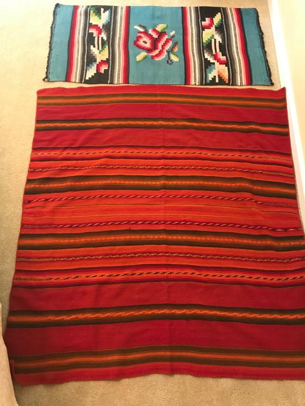 Two well cared for woven pieces for many different uses. Use as a rug, tablecloth or throw. Largest is a wool mix and measures 46.5”x50.5”. Smaller is wool and is 45”x22”. Shipping or Local pick up only.